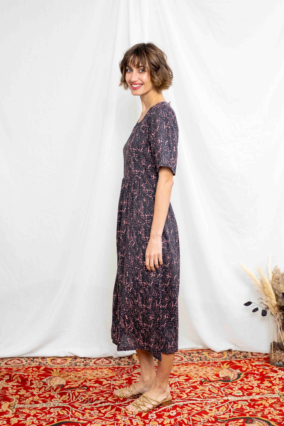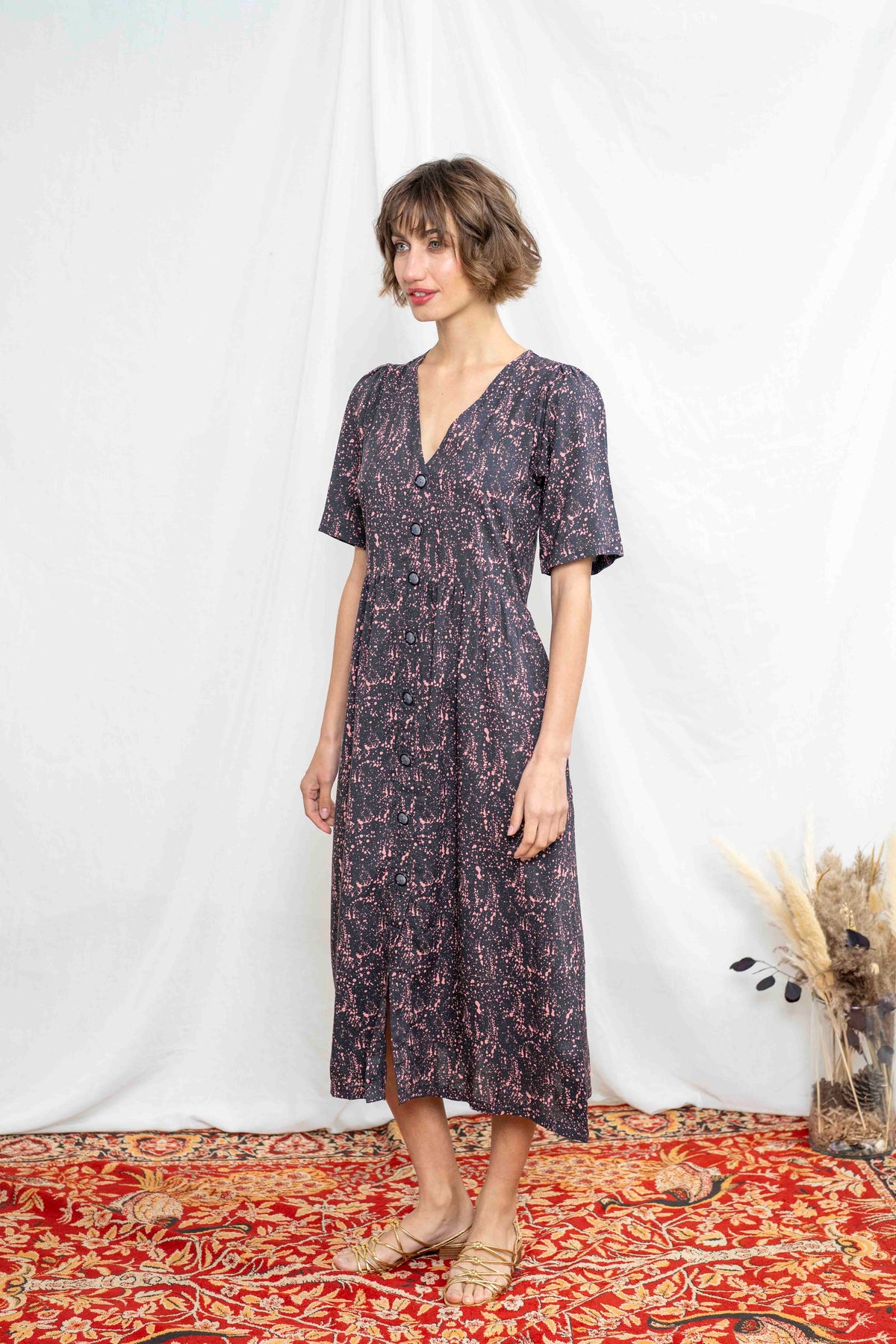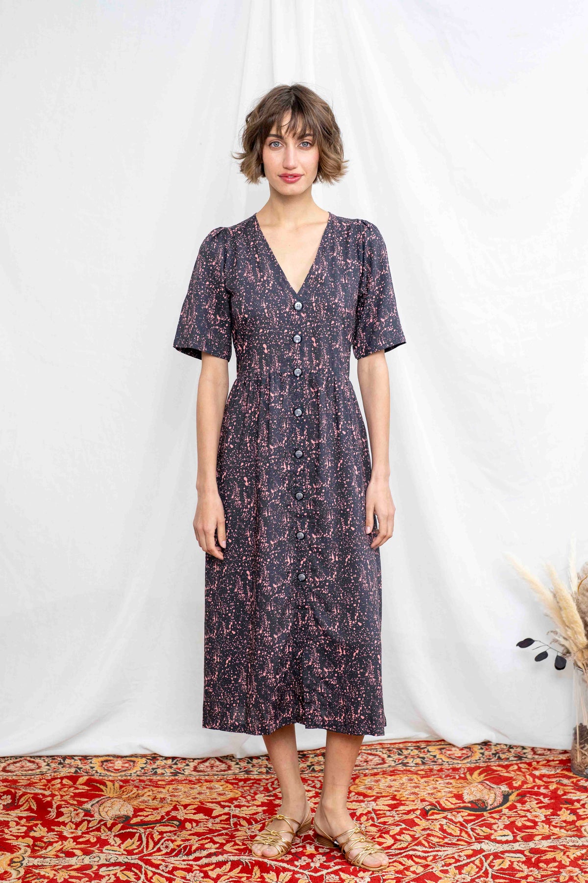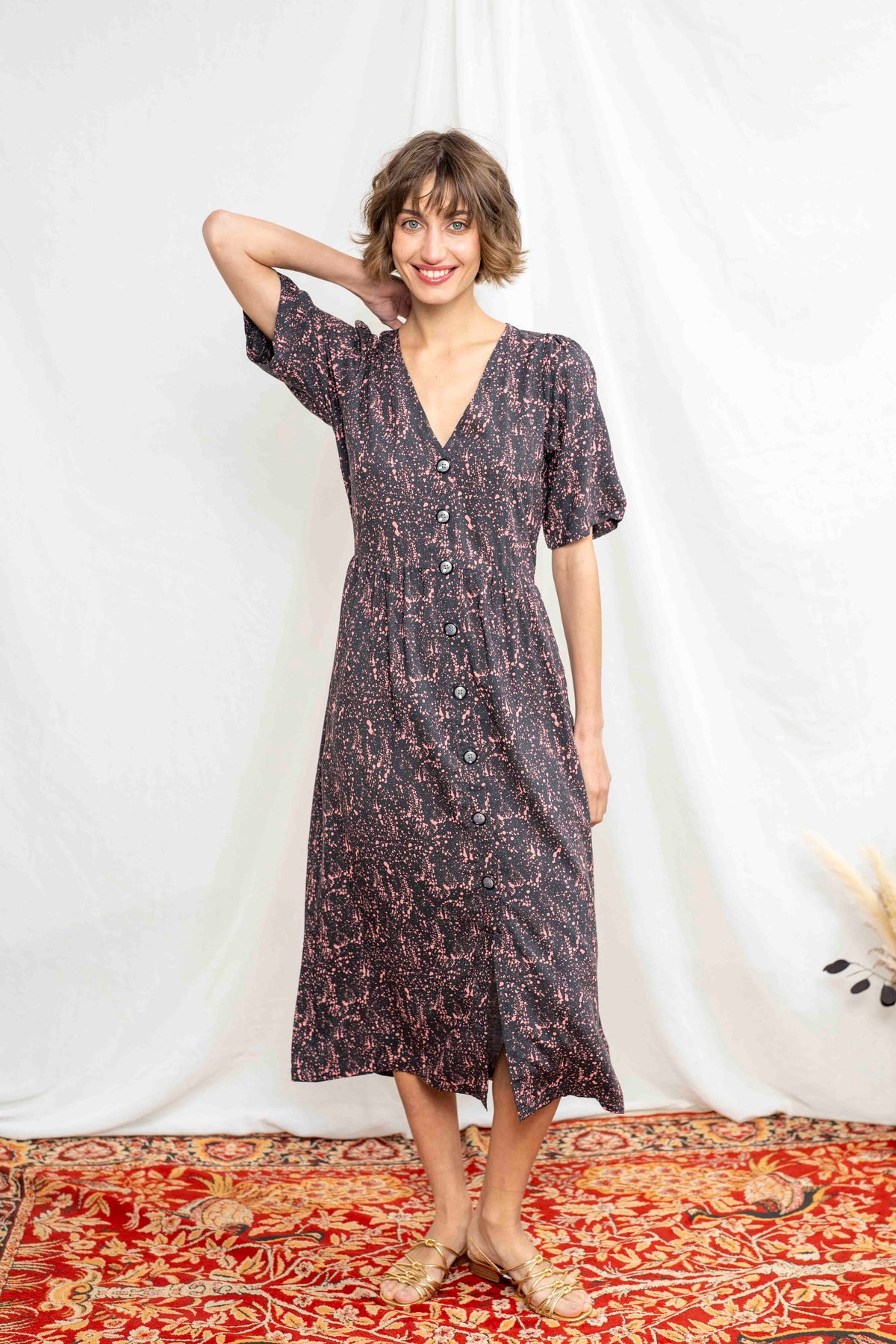 שמלת מידי קלילה ומחמיאה בגזרה נשפכת, עם כיסים צדדיים לנוחות מירבית. מפתח וי עדין מחמיא למבנה הגוף, בעוד שהכפתורים הדקורטיביים מוסיפים טאץ' אלגנטי.