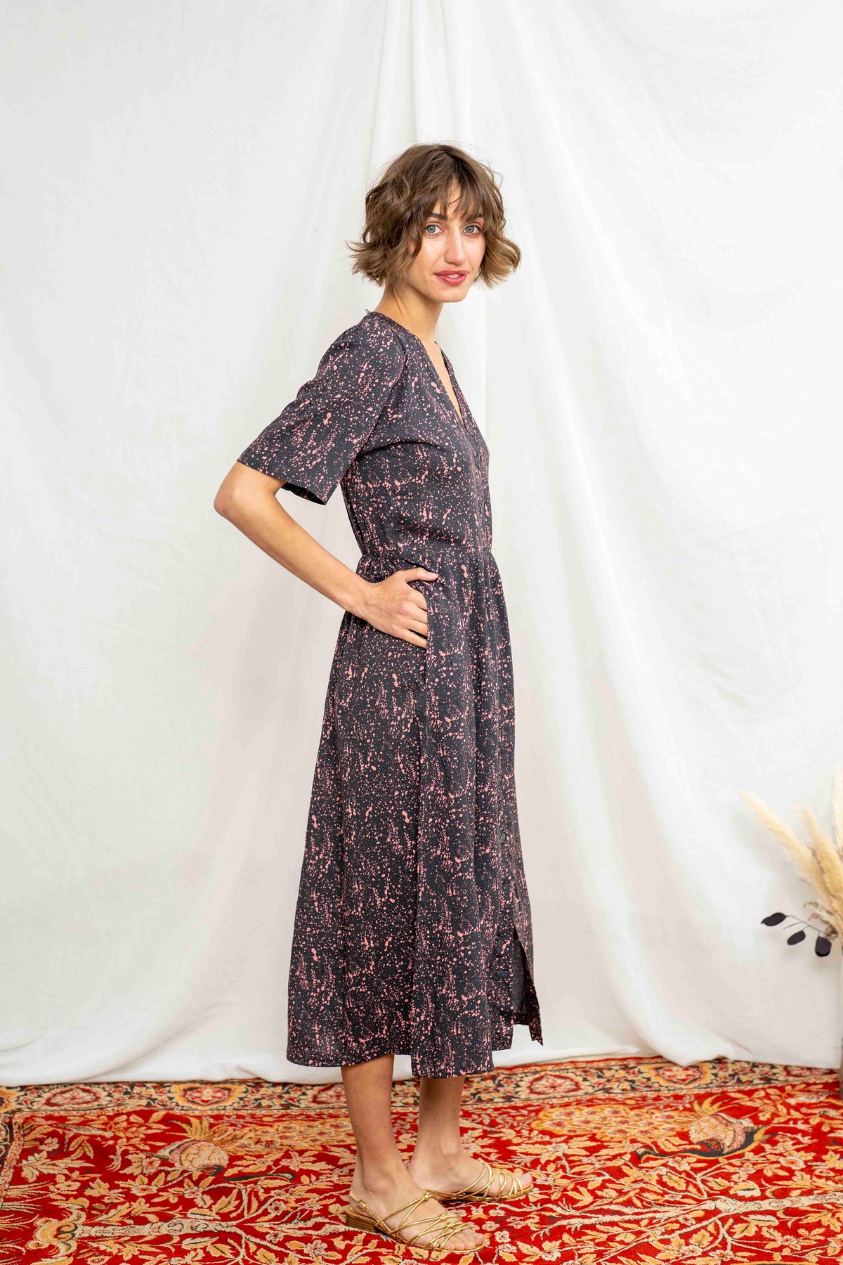 השרוולים הרחבים מעניקים מראה רך ומשוחרר, והדפס הטיפות המופשט בגווני ורוד עתיק על רקע אפור מוסיף עומק ועניין.