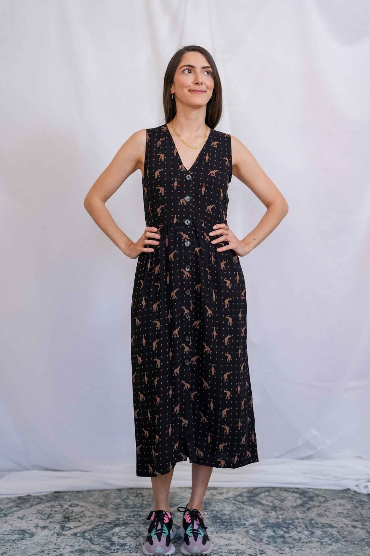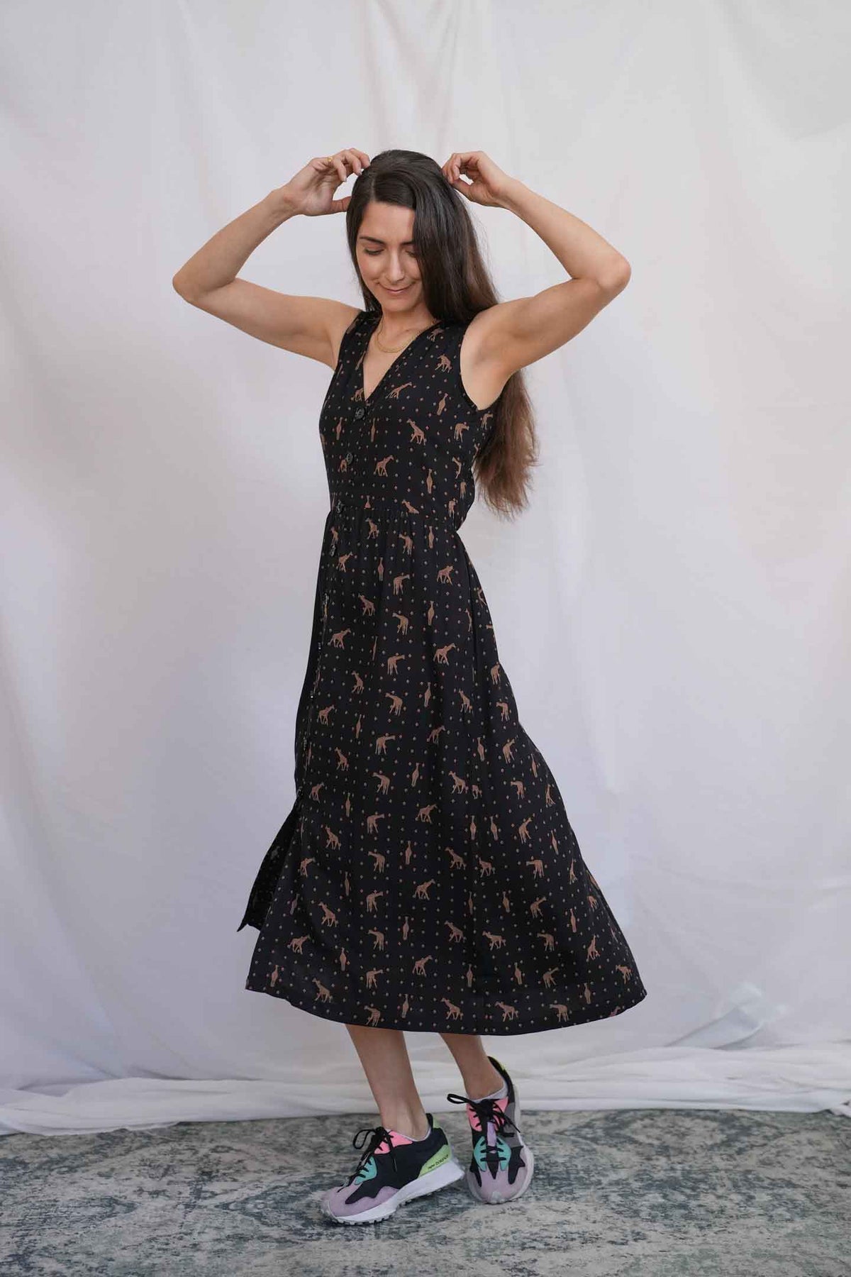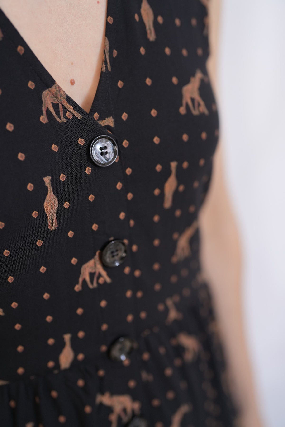 שמלת יולי ג'ירפות עם פרינט מיוחד וגאוני של גירפות ונקודות מוזהבות על רקע שחור