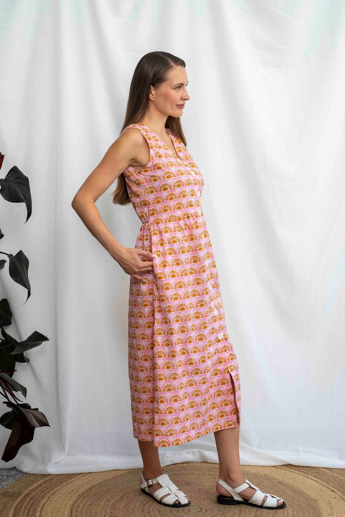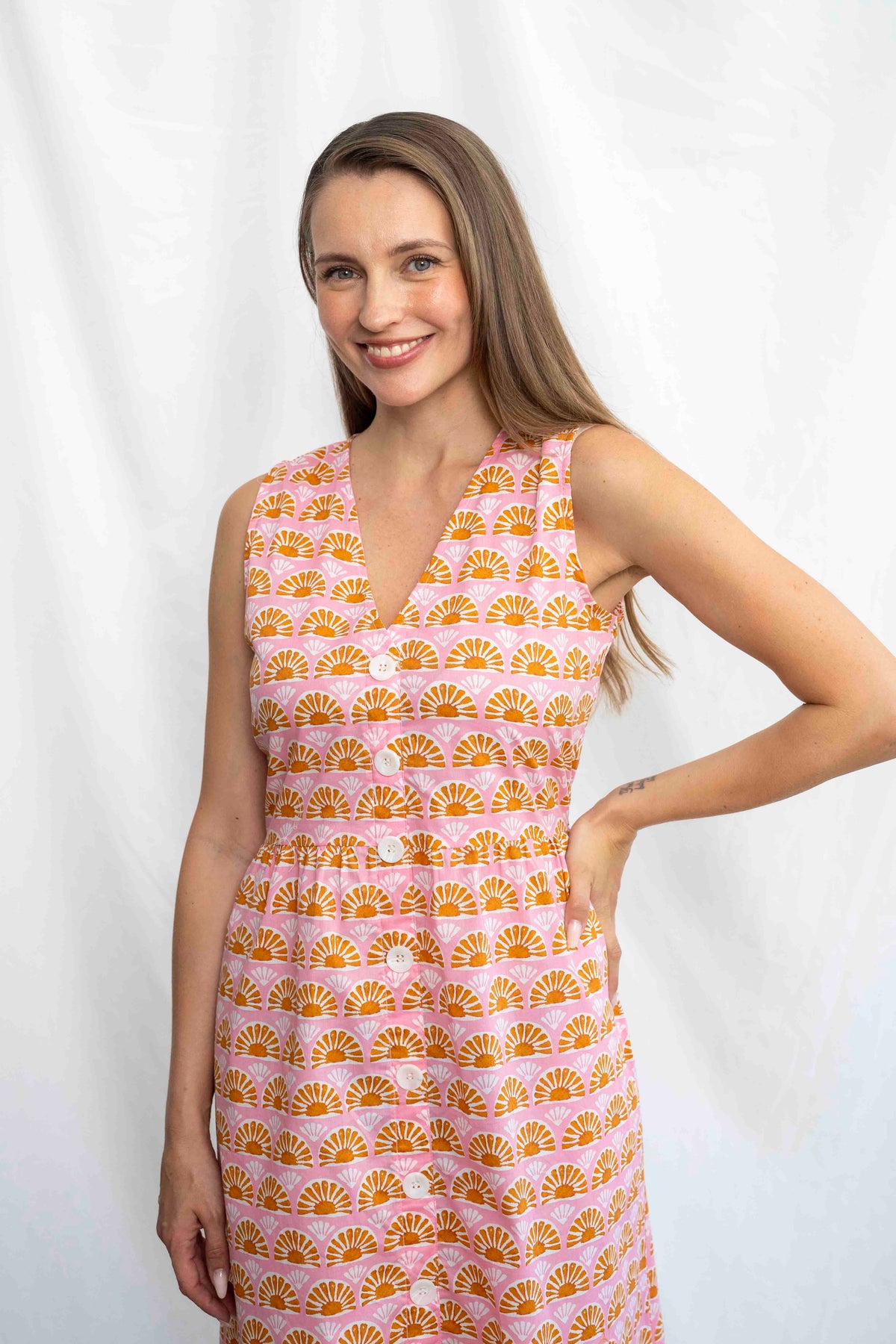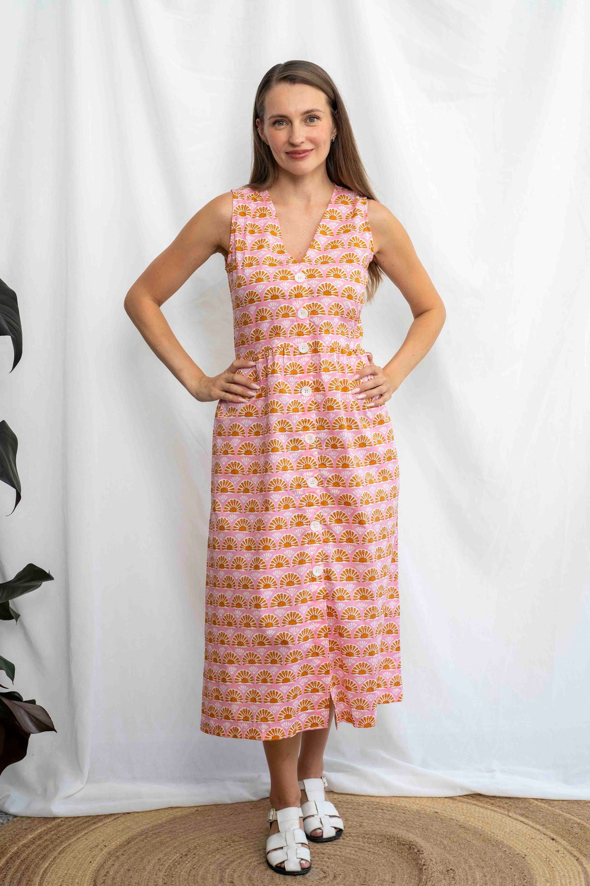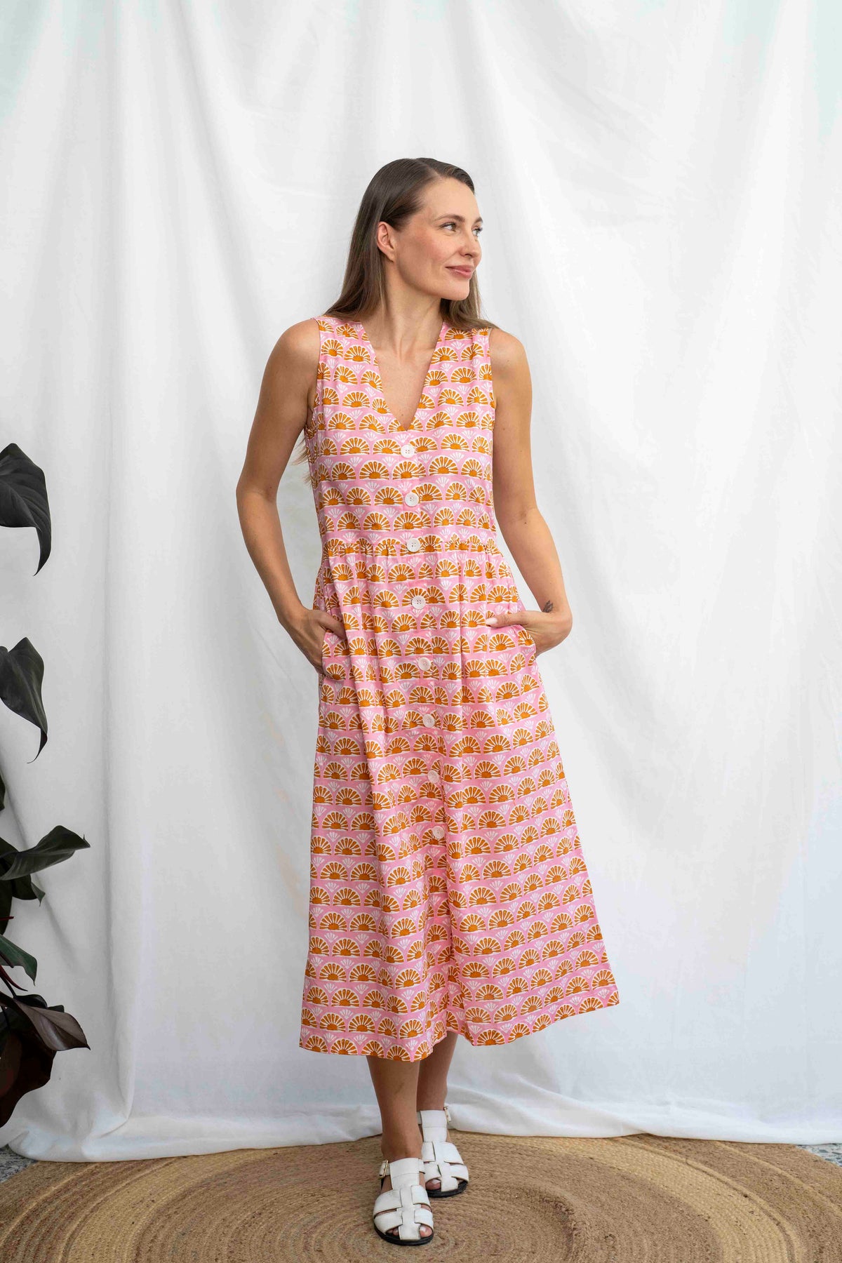 מהמם בכל אירוע. השמלה באורך מידי, ללא שרוולים ועם מפתח וי מושלם. הכפתורים הדקורטיביים לכל אורך השמלה מעניקים ביטחון וסטייל, ויש לה זוג הכיסים הצידיים מוסיפים פרקטיות. הגומי בגב מאפשר נוחות מרבית ומדגיש את המותן בצורה מחמיאה.
