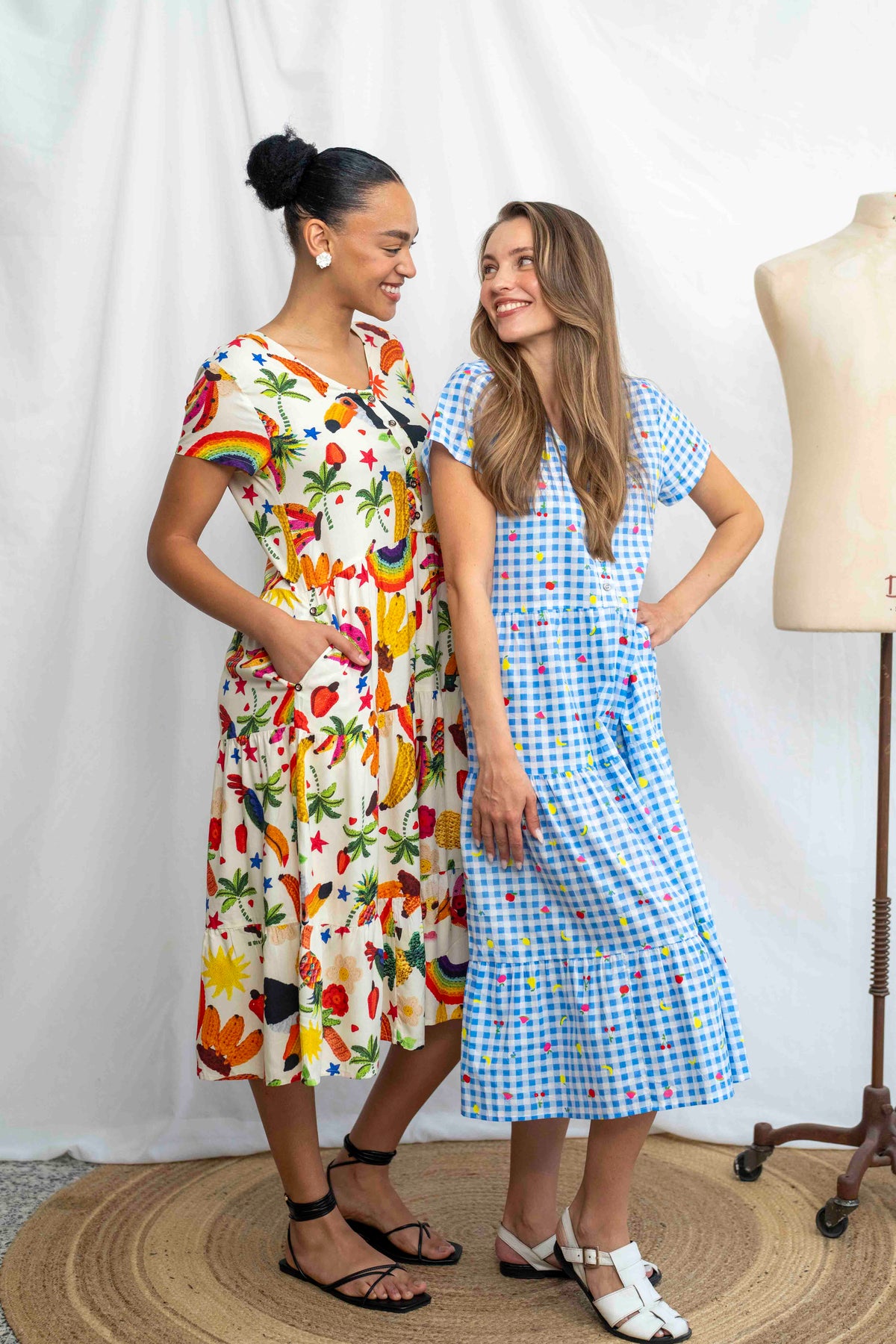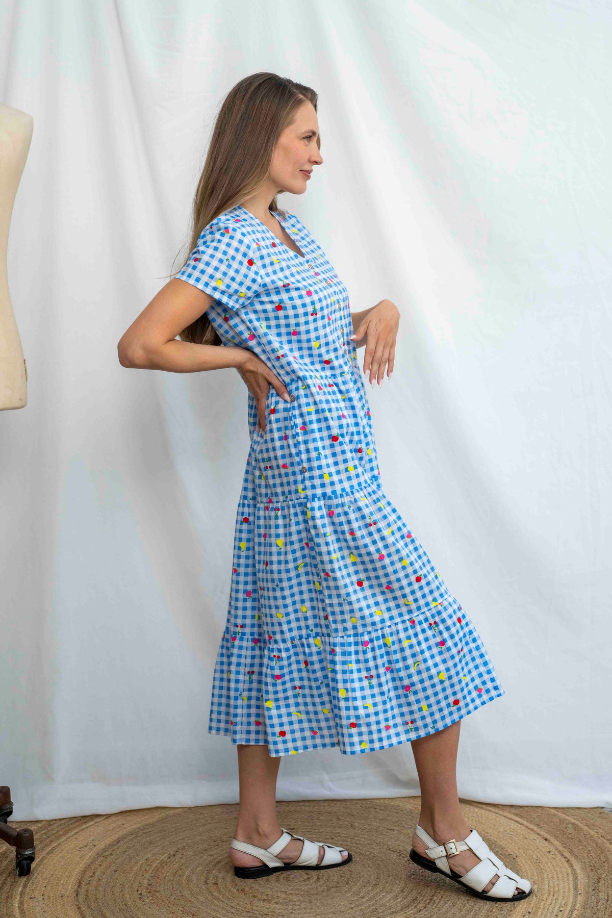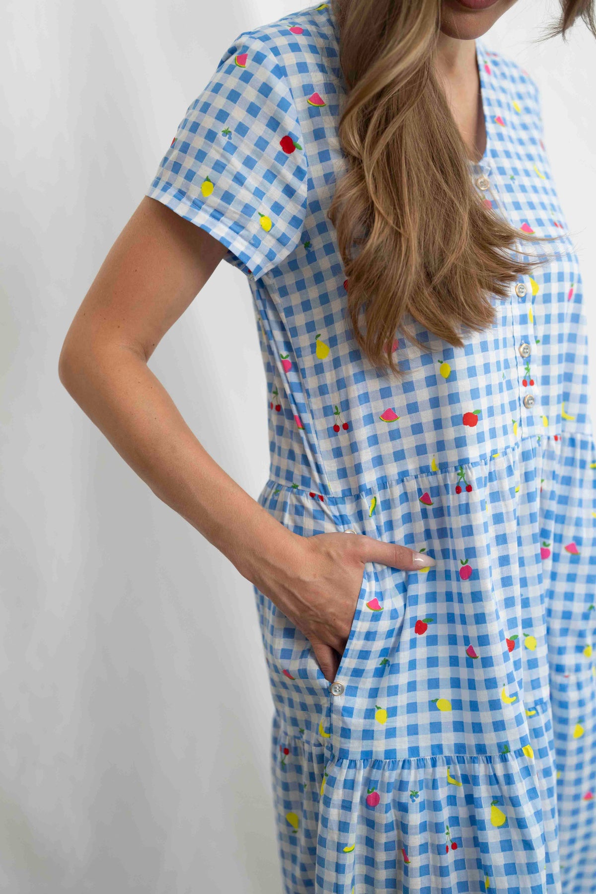 שמלה שהיא קריצה שובבה לילדות הקיץ הכי שמחות שלך: שמלת הקומות "פיקניק" מעוטרת בהדפס משובץ בגווני תכלת-לבן, שעליו פזורים איורים צבעוניים קטנים של פירות – ממש כמו שולחן פיקניק חגיגי עם טאץ' אמנותי.