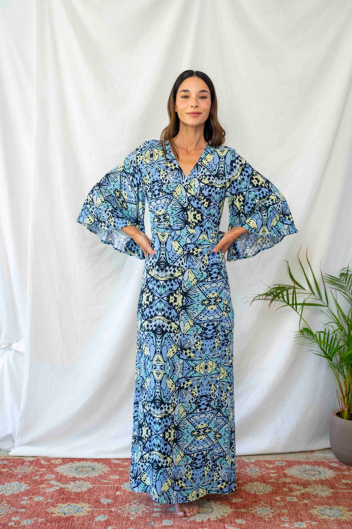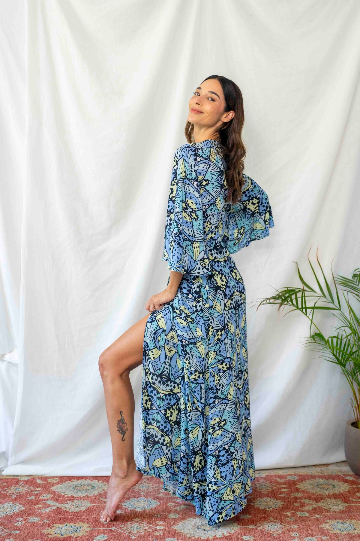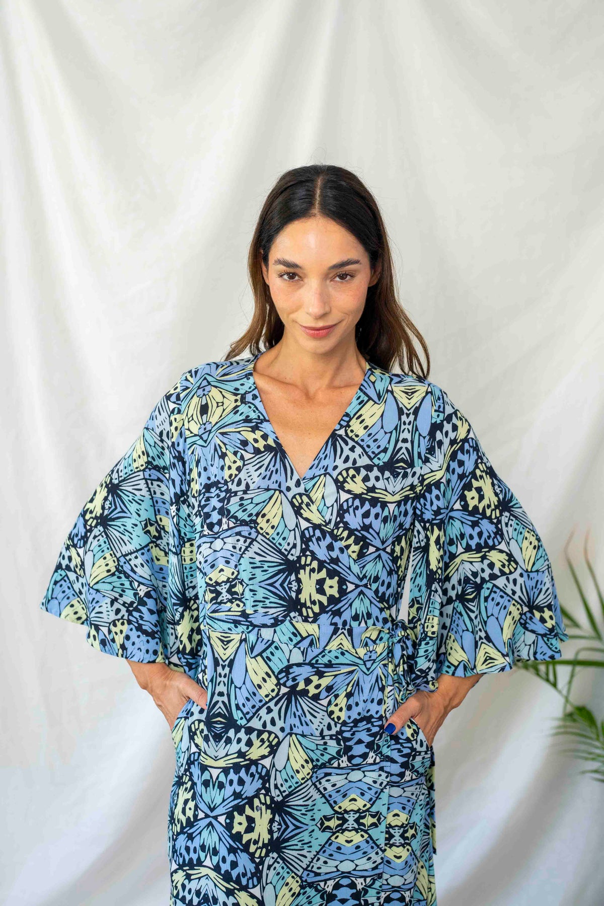 קימונו מקסי כנפיי פרפרים היא שמלה בולטת ודומיננטית למרות שהיא מקושטת בגווני פסטל עדינים, מעוטרת בפרחים כחולים שמקושטים בזהב. שמלה לאירוע וליום חול כאחד. הדגם בהשראת הקימונו היפני, שמלה סופר מרשימה בגיזרת מעטפת, בעלת שרוולי פעמון מרשימים וכמובן (איך לא?!) כיסים! שמלה צנועה ונשית בו זמנית, ארוכה ומלאת נוכחות, תראה מושלם עם עקב או עם סניקרס ותקצור את כל המחמאות.