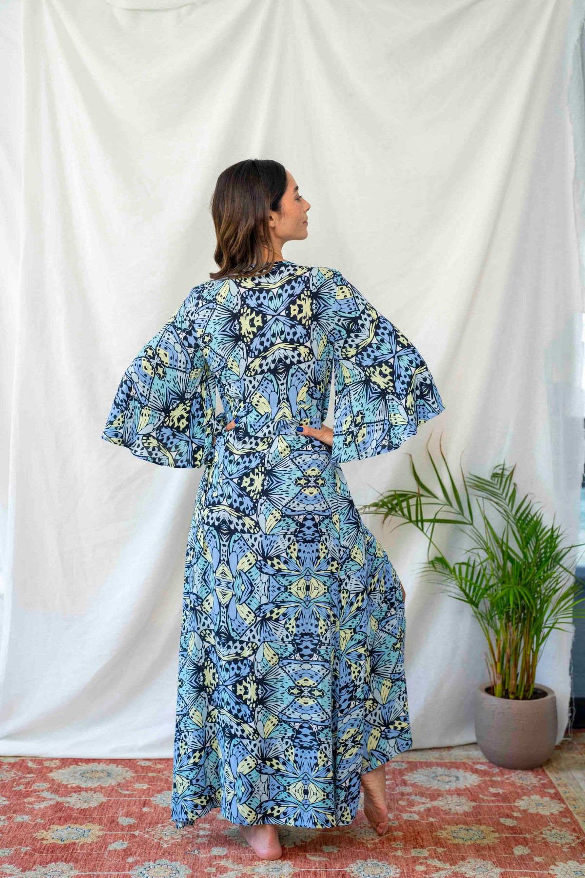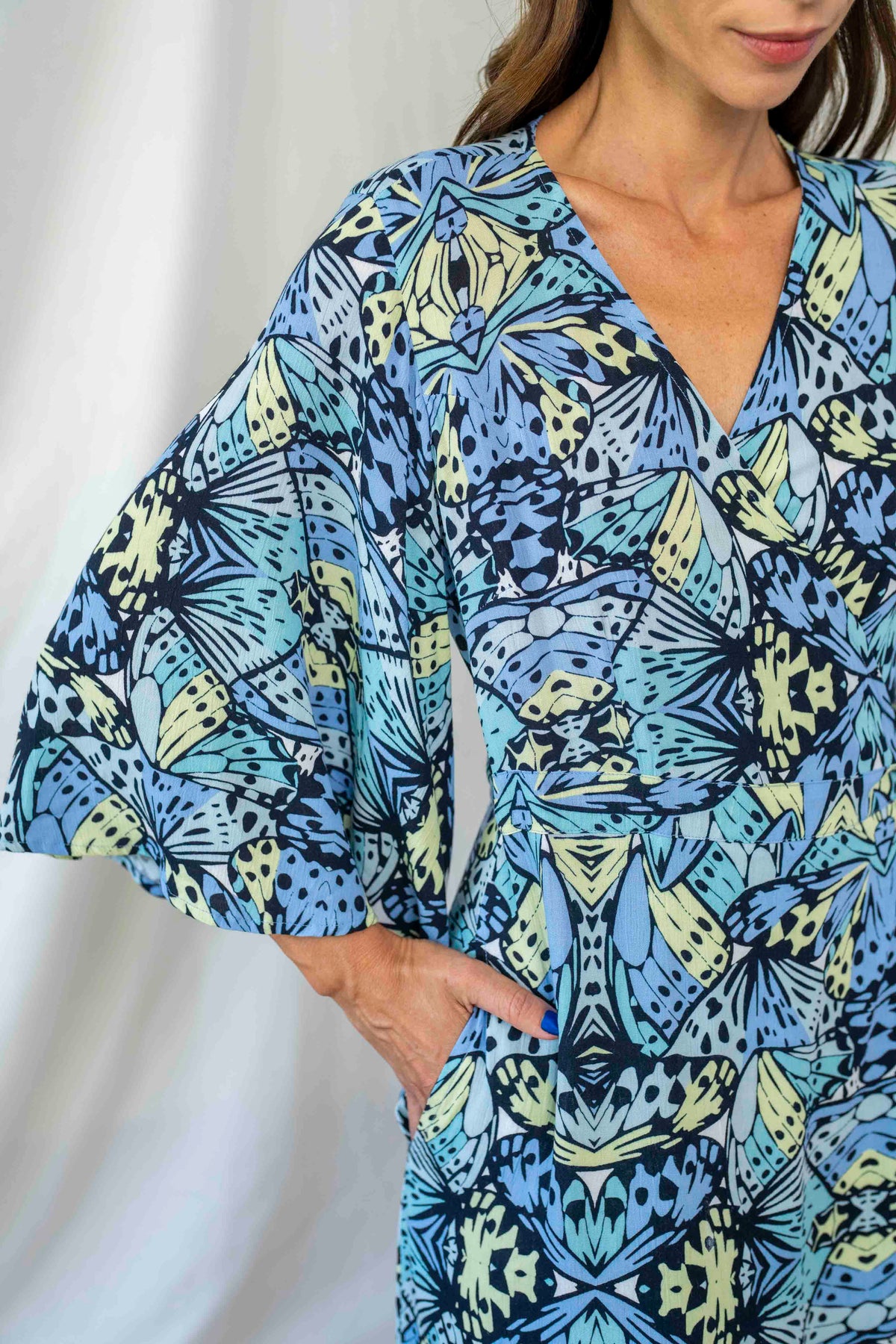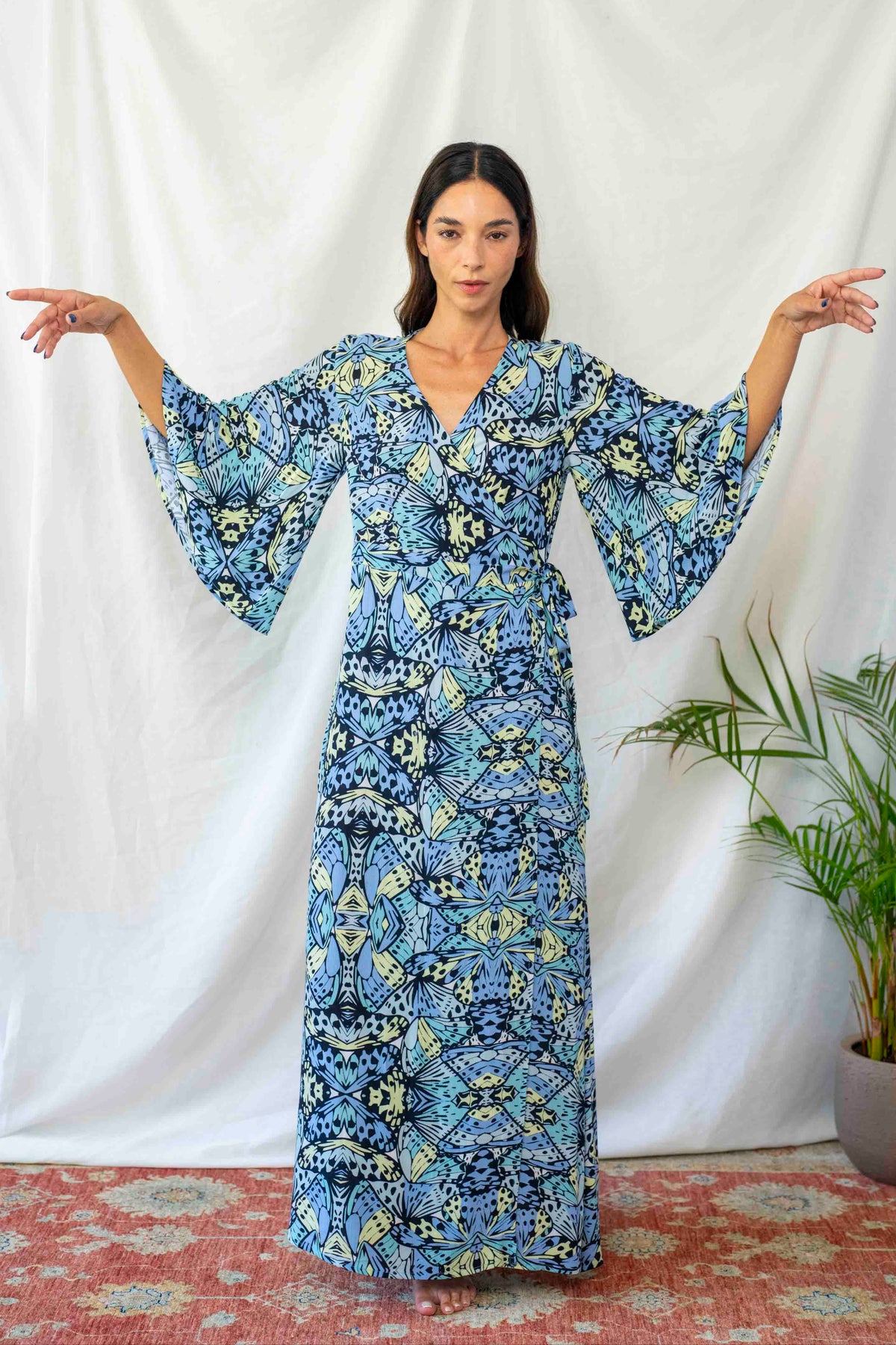 קימונו מקסי כנפיי פרפרים היא שמלה בולטת ודומיננטית למרות שהיא מקושטת בגווני פסטל עדינים, מעוטרת בפרחים כחולים שמקושטים בזהב. שמלה לאירוע וליום חול כאחד. הדגם בהשראת הקימונו היפני, שמלה סופר מרשימה בגיזרת מעטפת, בעלת שרוולי פעמון מרשימים וכמובן (איך לא?!) כיסים! שמלה צנועה ונשית בו זמנית, ארוכה ומלאת נוכחות, תראה מושלם עם עקב או עם סניקרס ותקצור את כל המחמאות.