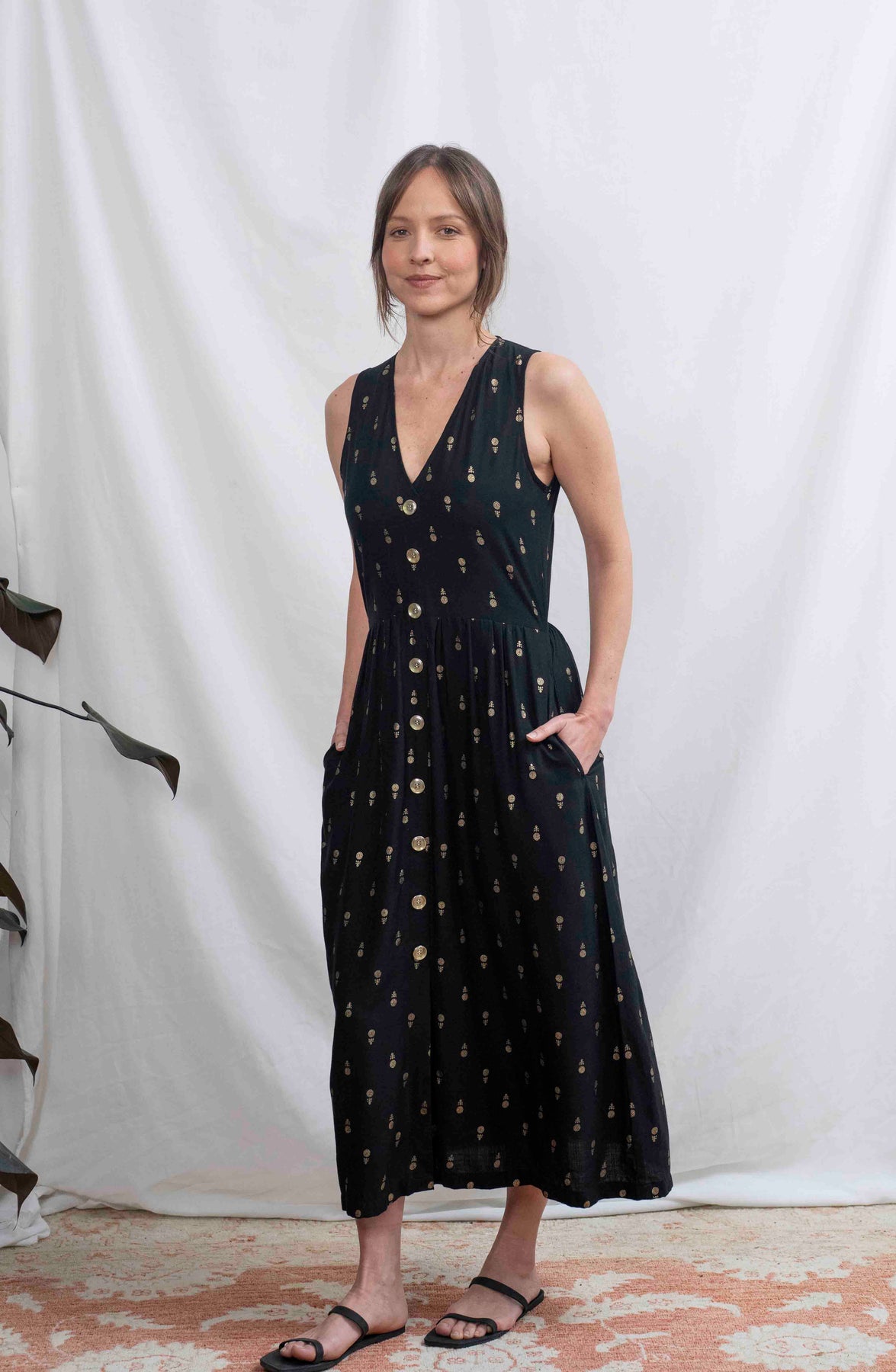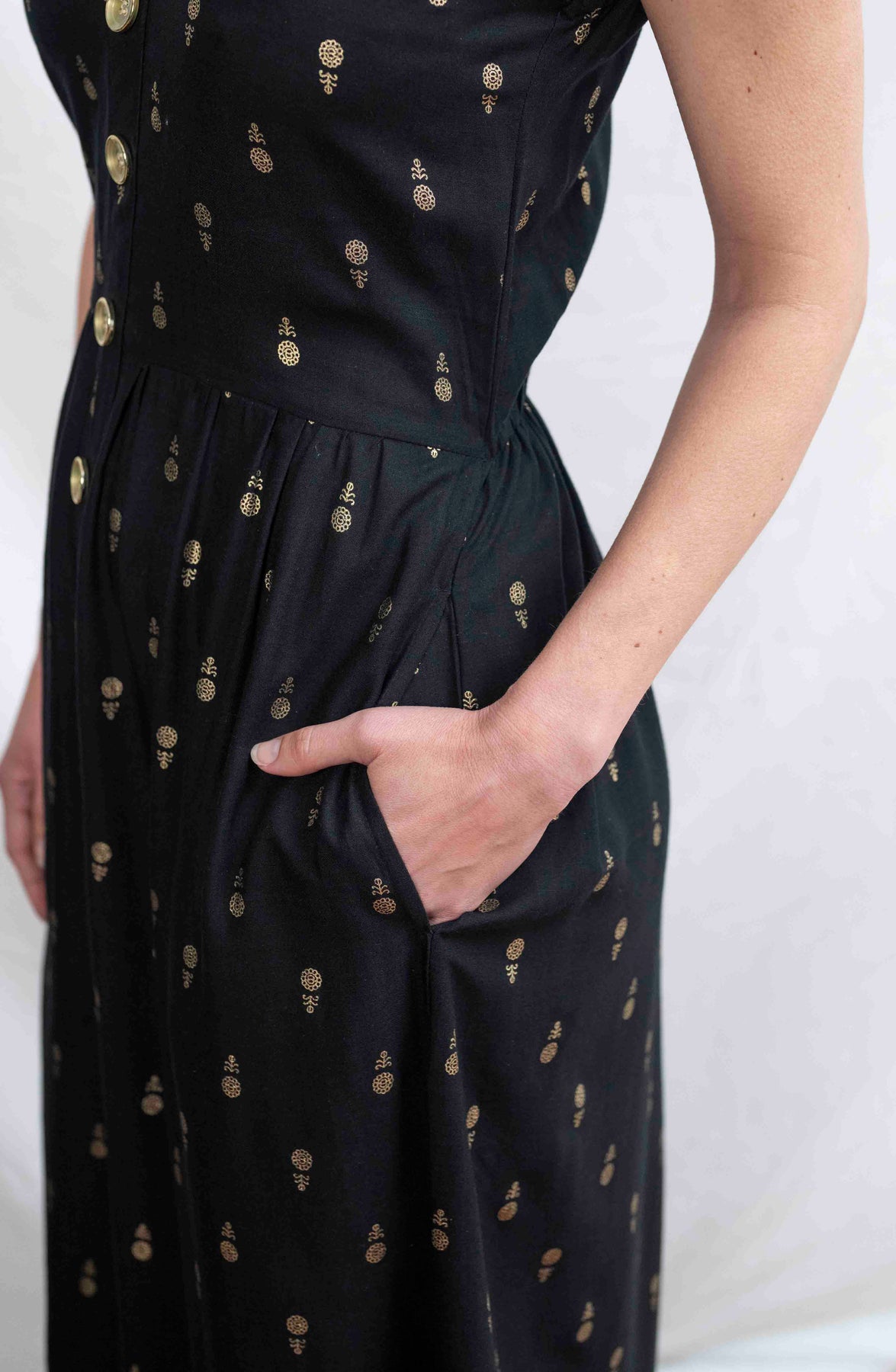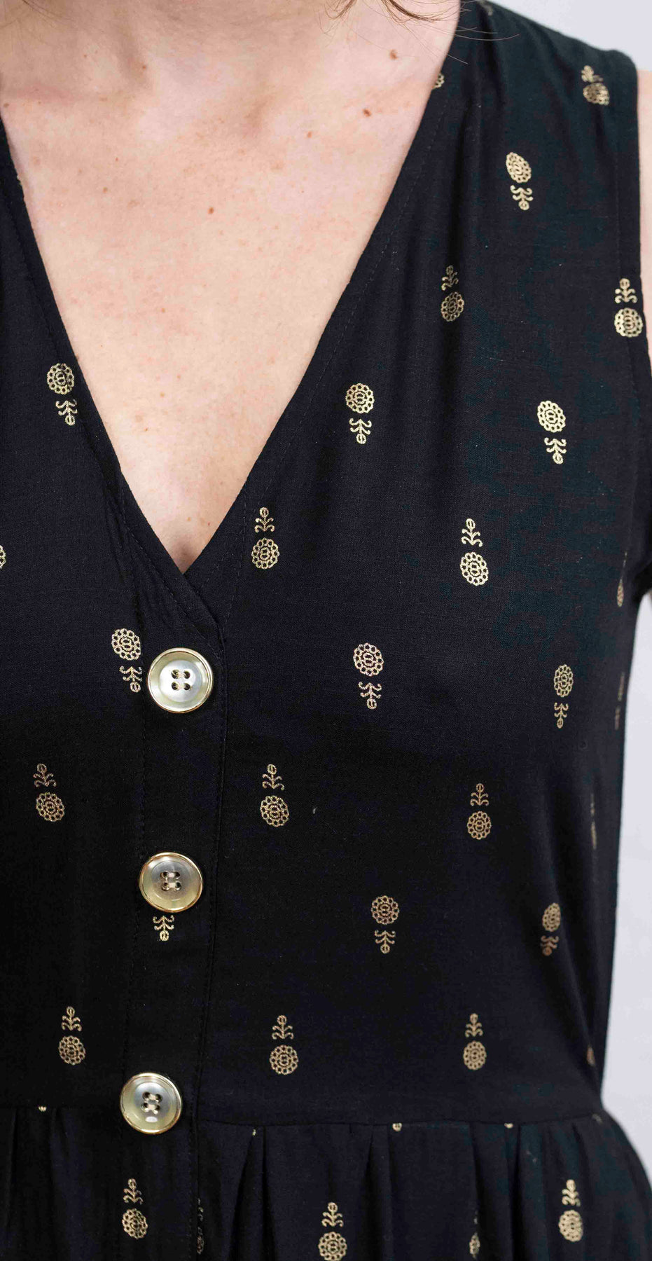 מהמם בכל אירוע. השמלה באורך מידי, ללא שרוולים ועם מפתח וי מושלם. הכפתורים הדקורטיביים לכל אורך השמלה מעניקים ביטחון וסטייל, ויש לה זוג הכיסים הצידיים מוסיפים פרקטיות. הגומי בגב מאפשר נוחות מרבית ומדגיש את המותן בצורה מחמיאה.