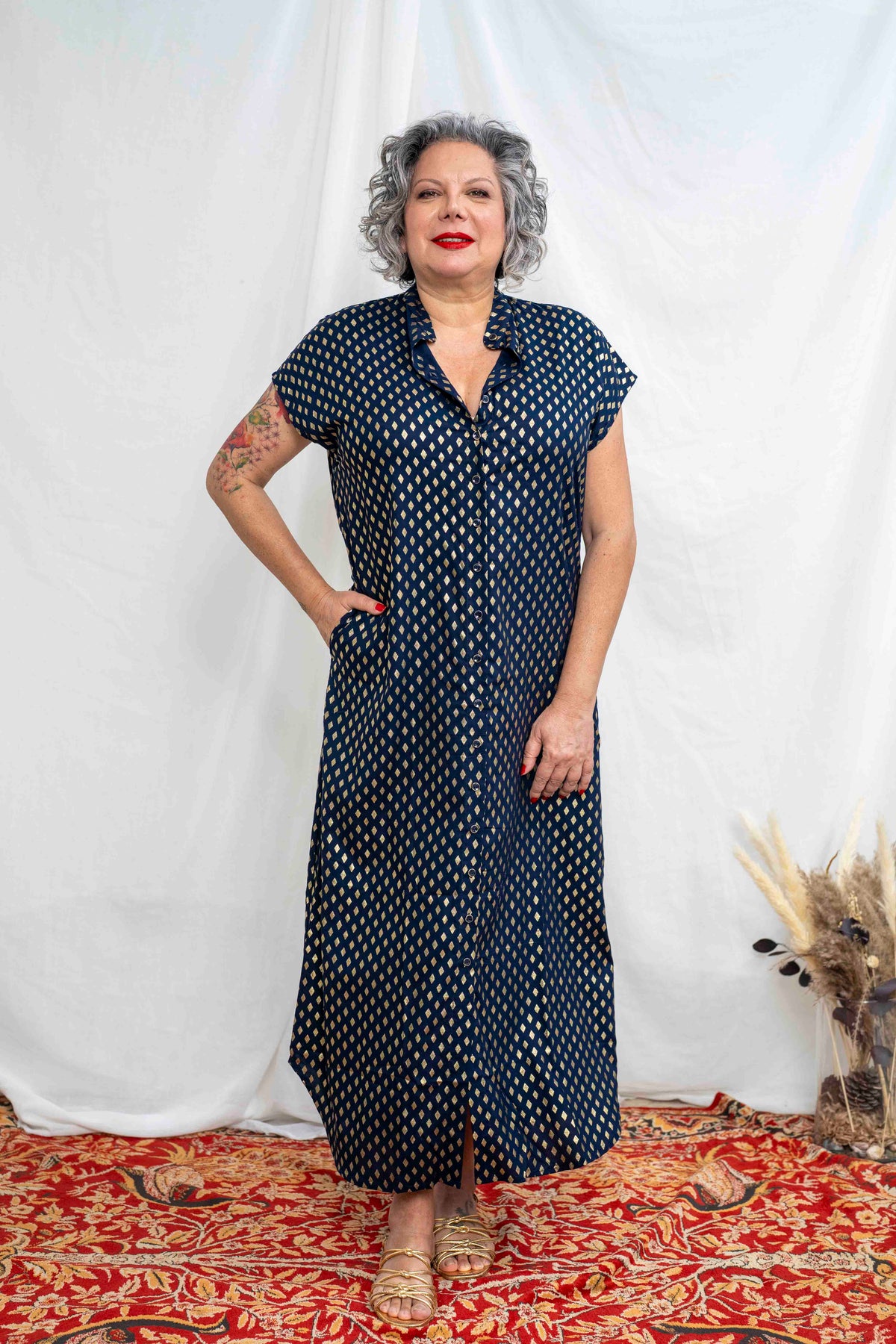 שמלת מקסי אוברסייז יהלומים כחול היא השמלה הכי קלאס באפס מאמץ, היא שיקית, היא נוצצת בזהב והיא תגרוף את כל המחמאות.