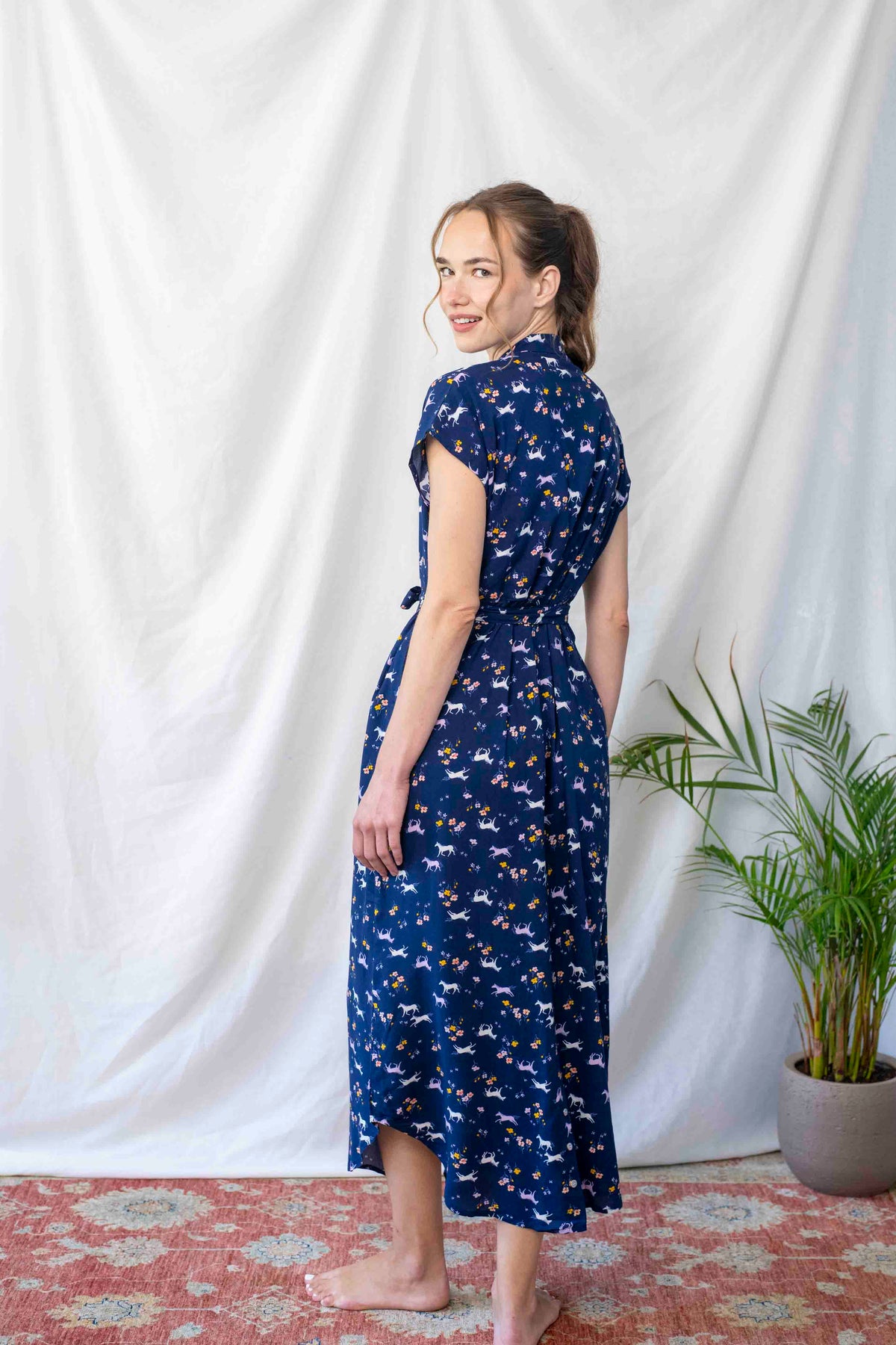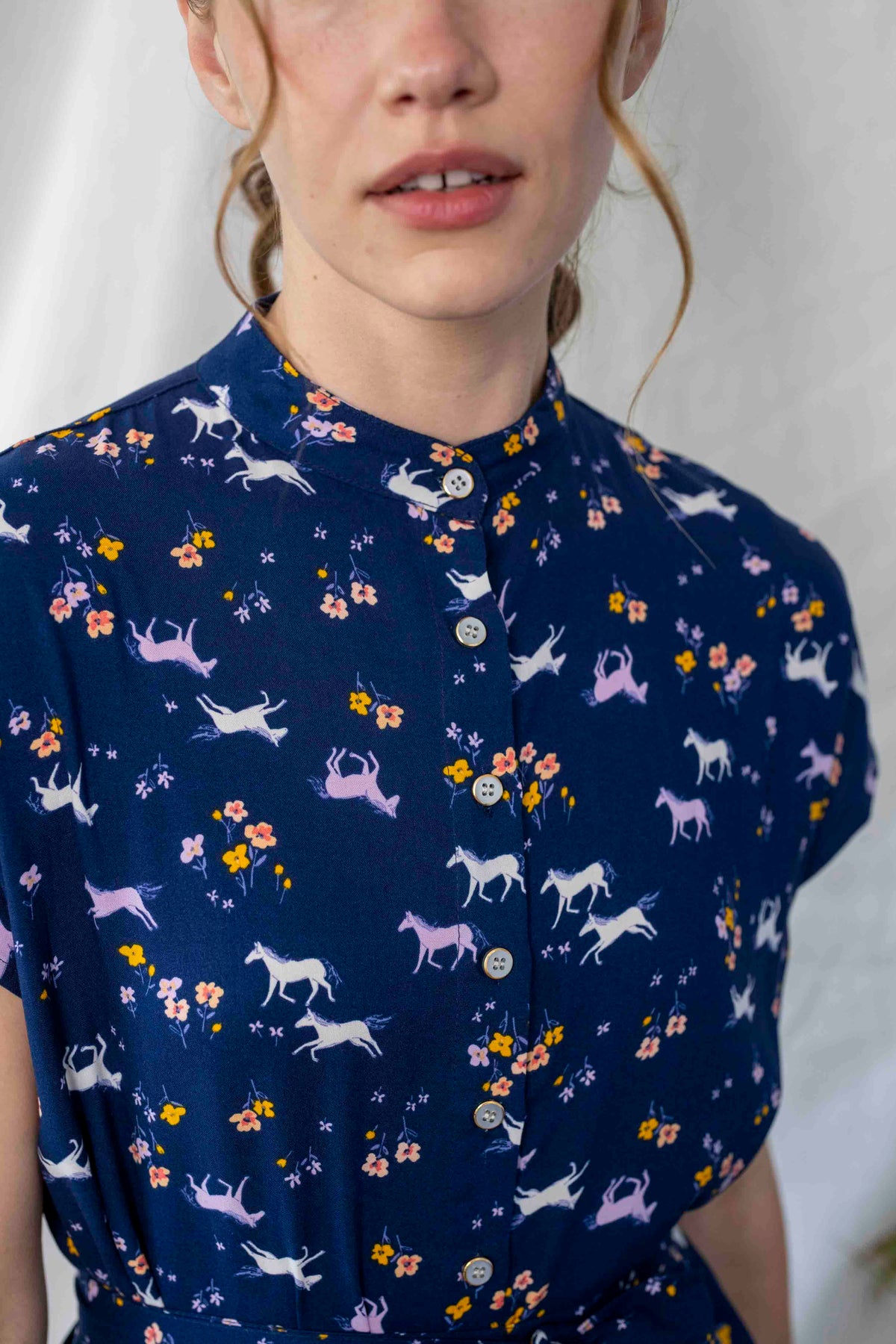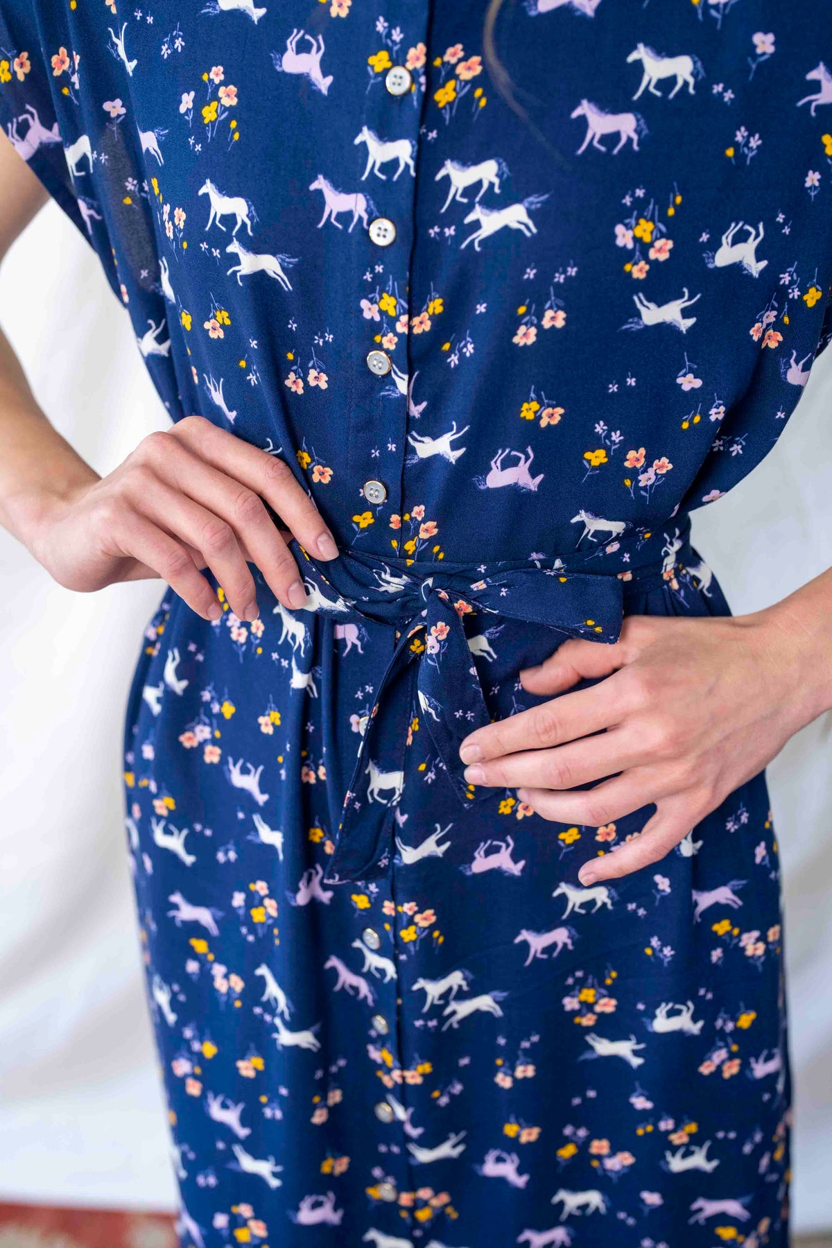 שמלה כחולה מעוטרת במוטיבים של סוסים, סוסי פוני, חדי קרן ופרחים, ובעלת צווארון סיני ייחודי. זוג כיסים צדדיים וחגורה תואמת משלימים את המראה, ומאפשרים התאמה לכל סגנון.