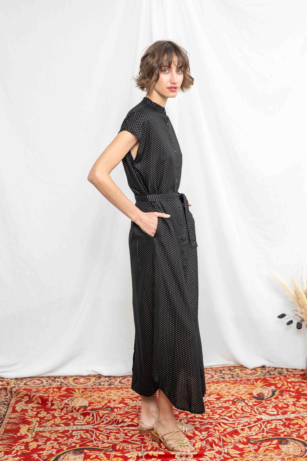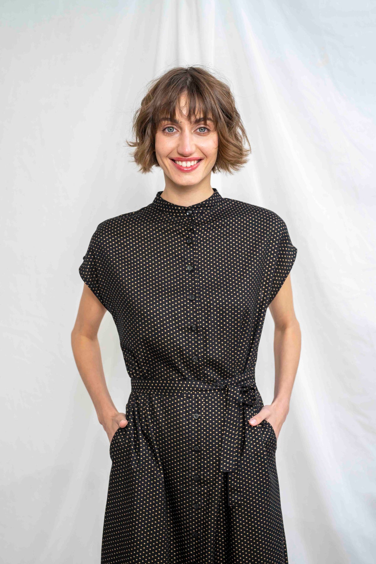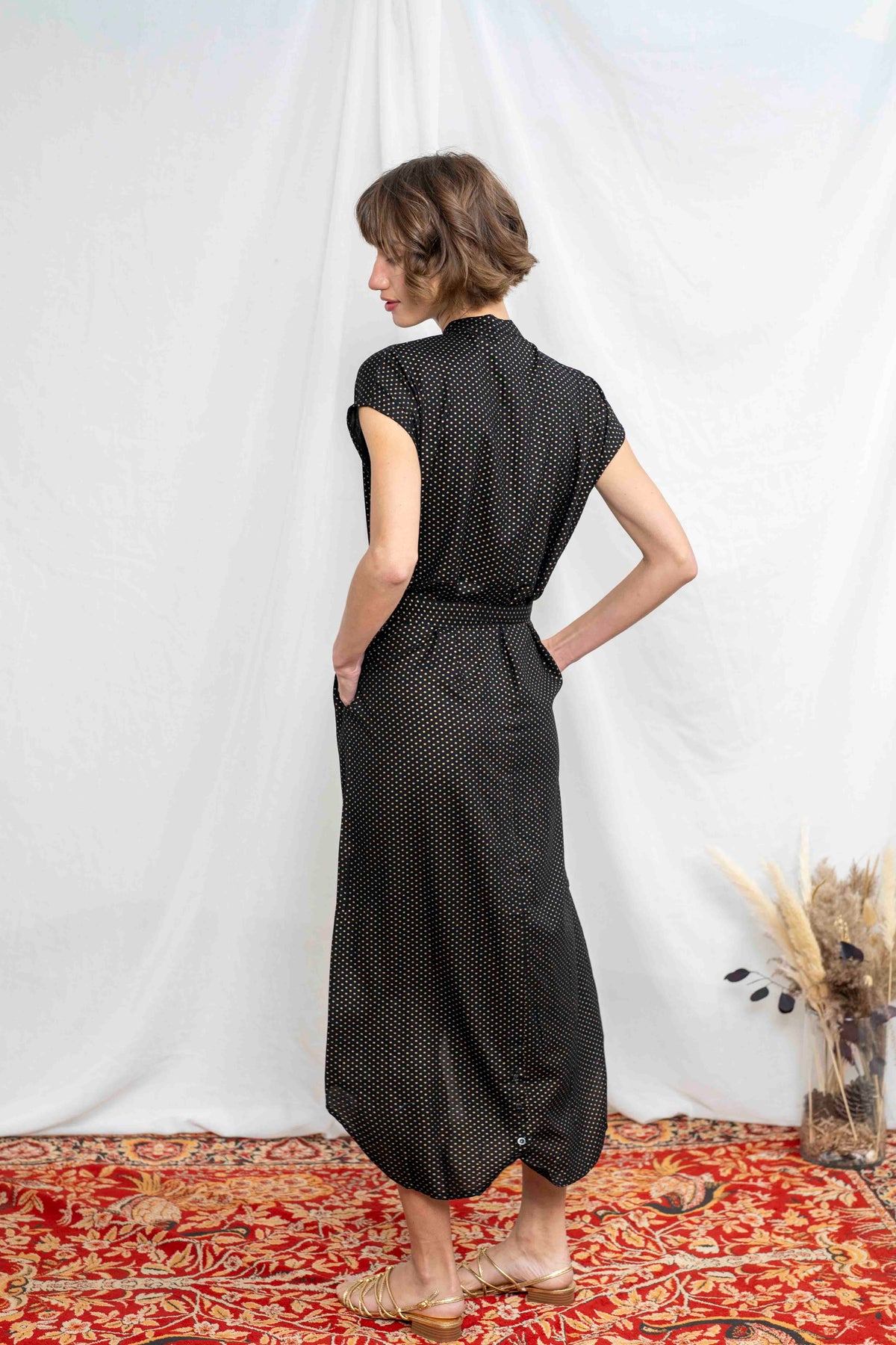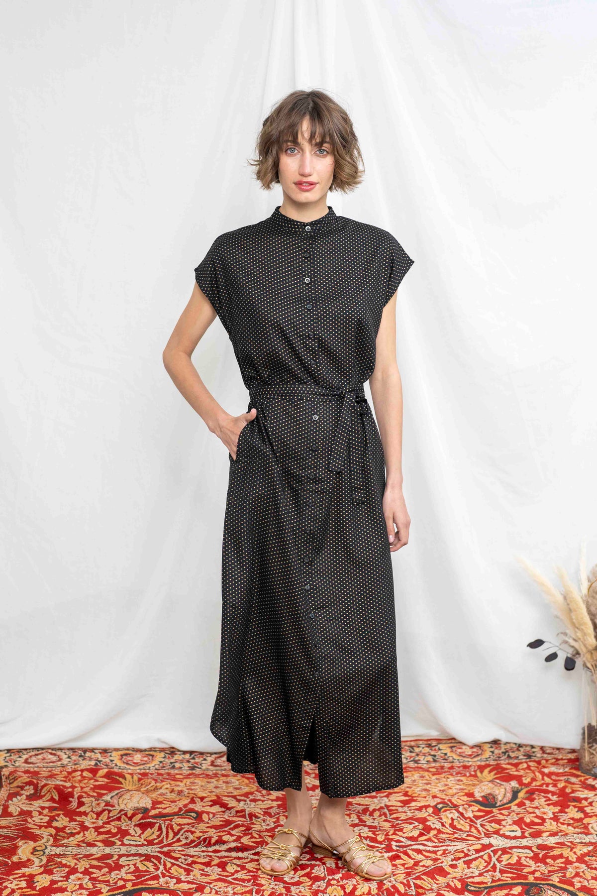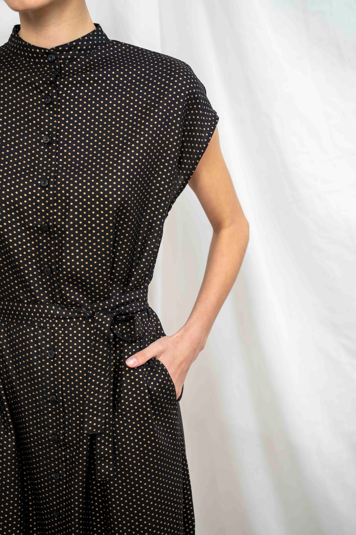 שמלה שחורה עם נקודות זהב עדינות, עשויה 100% כותנה.