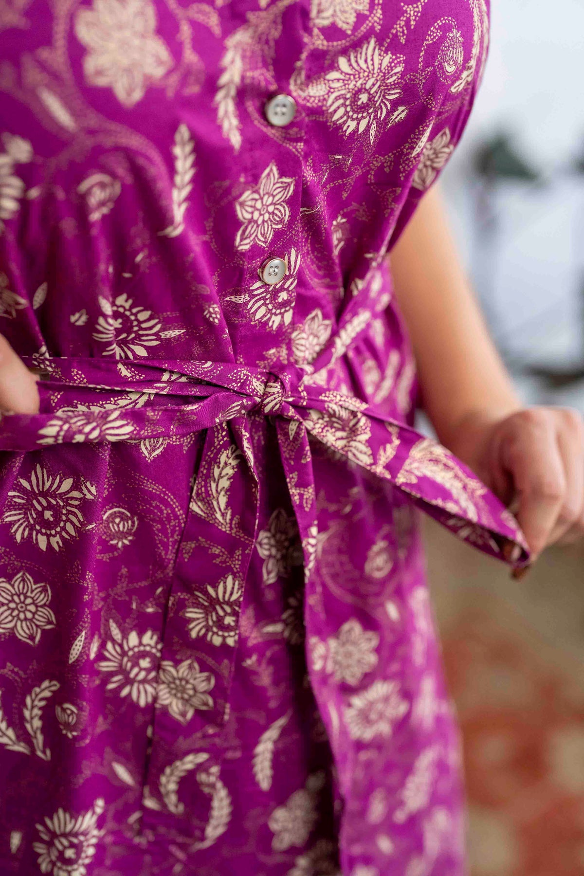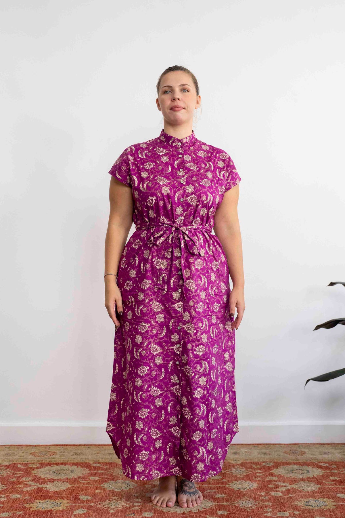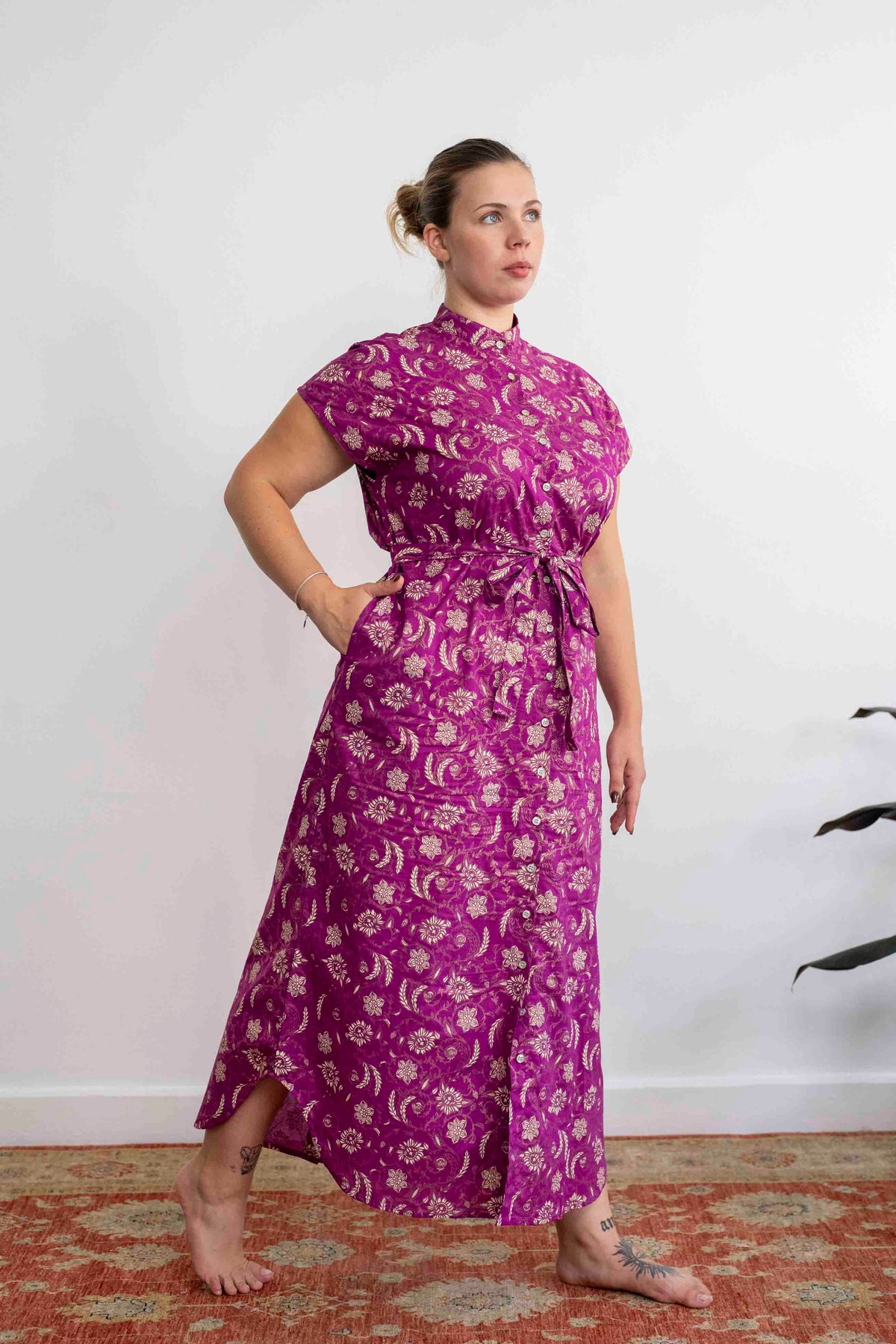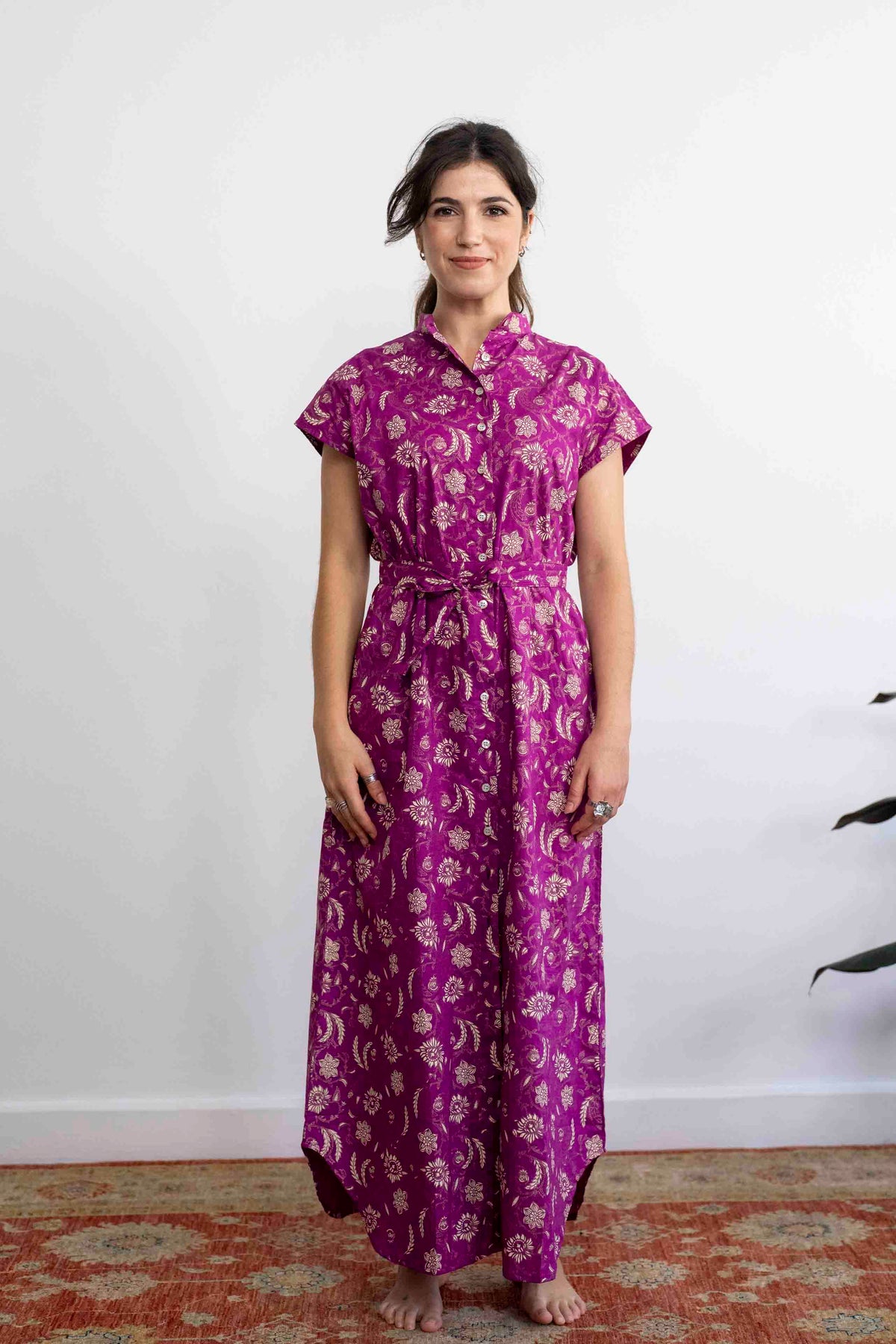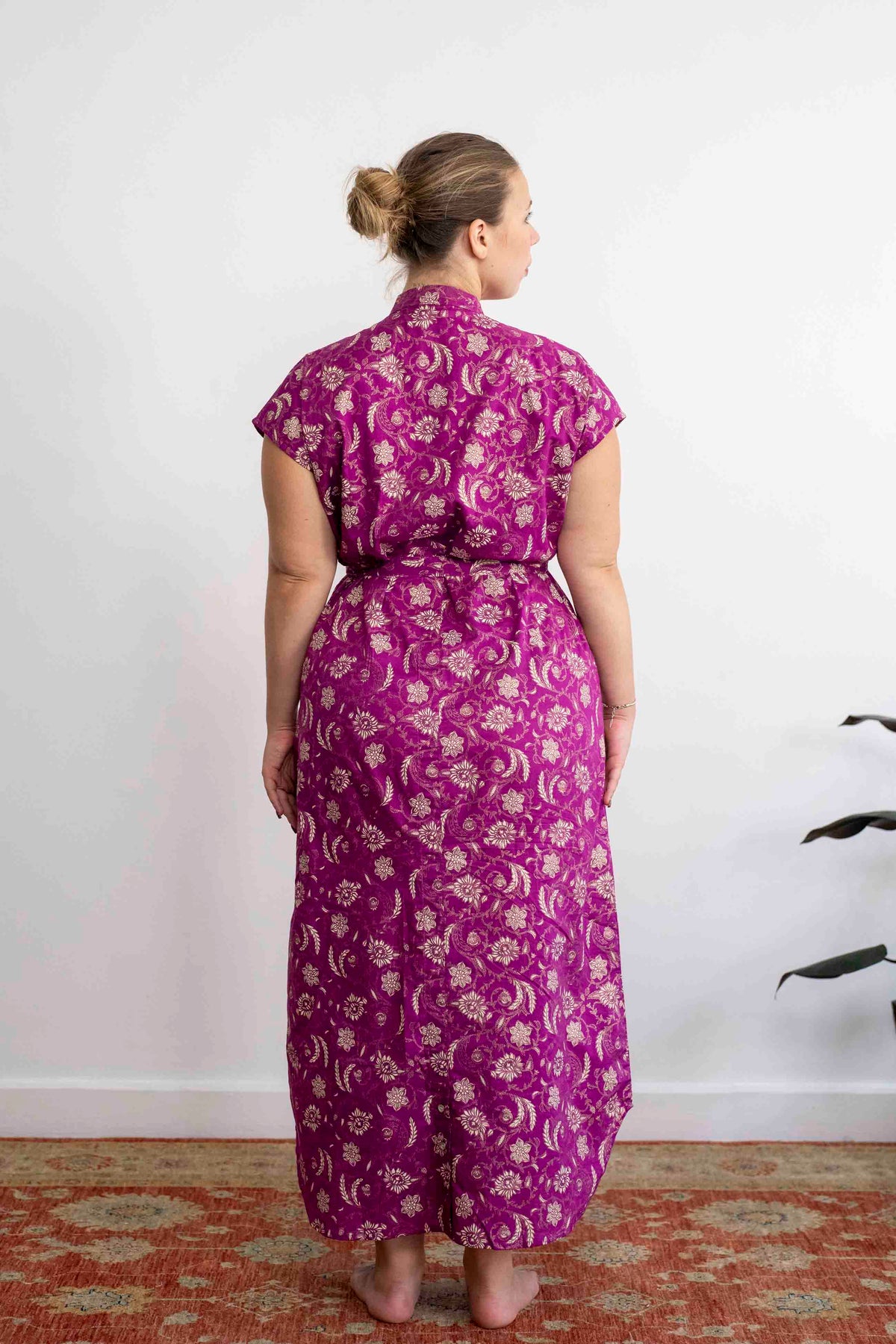 שמלת מקסי אוברסייז סגולה מעוטרת בדוגמאות פרחים ועיטורי זהב המאופיינים להודו ולמזרח, אבל פופולריים מאוד באירופה, בעיקר בצרפת.