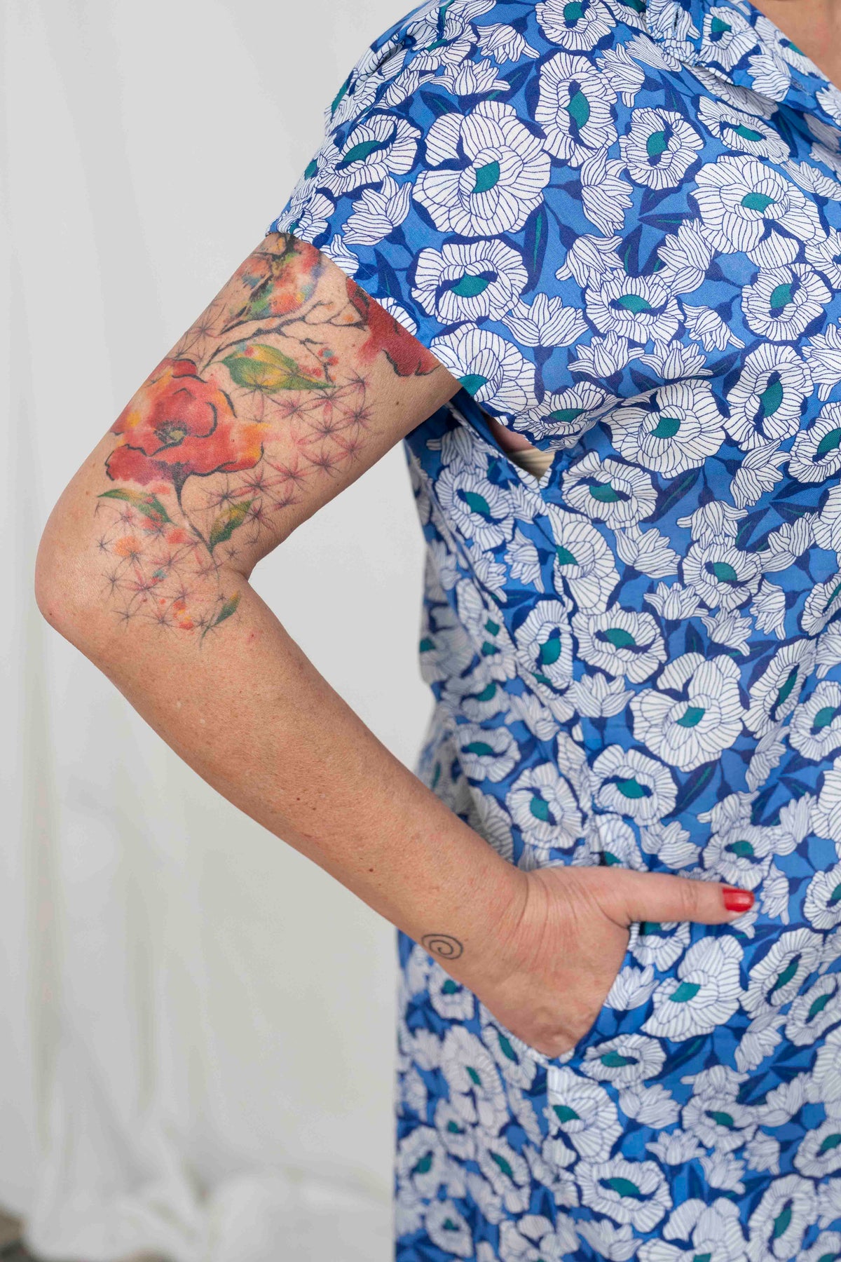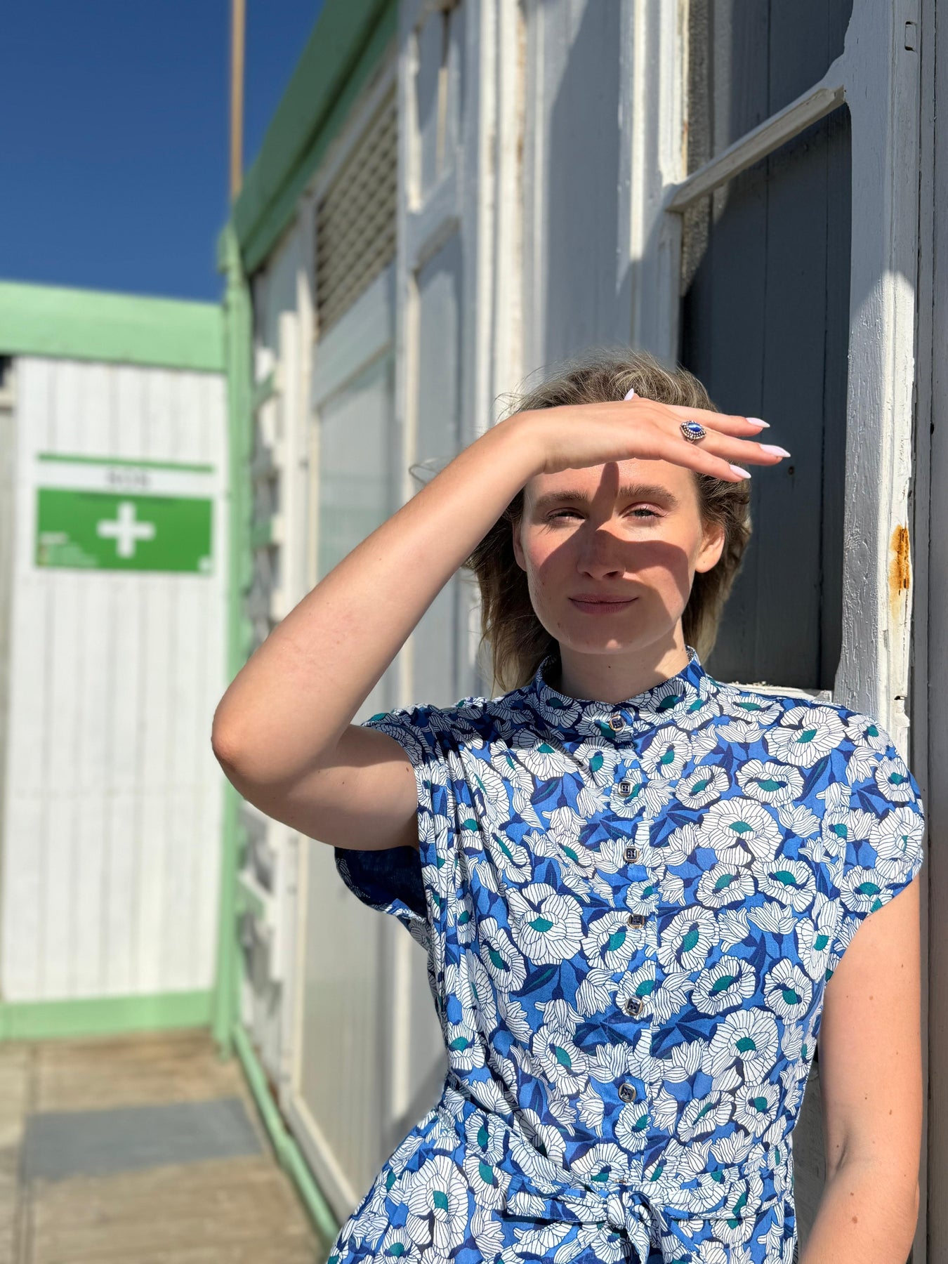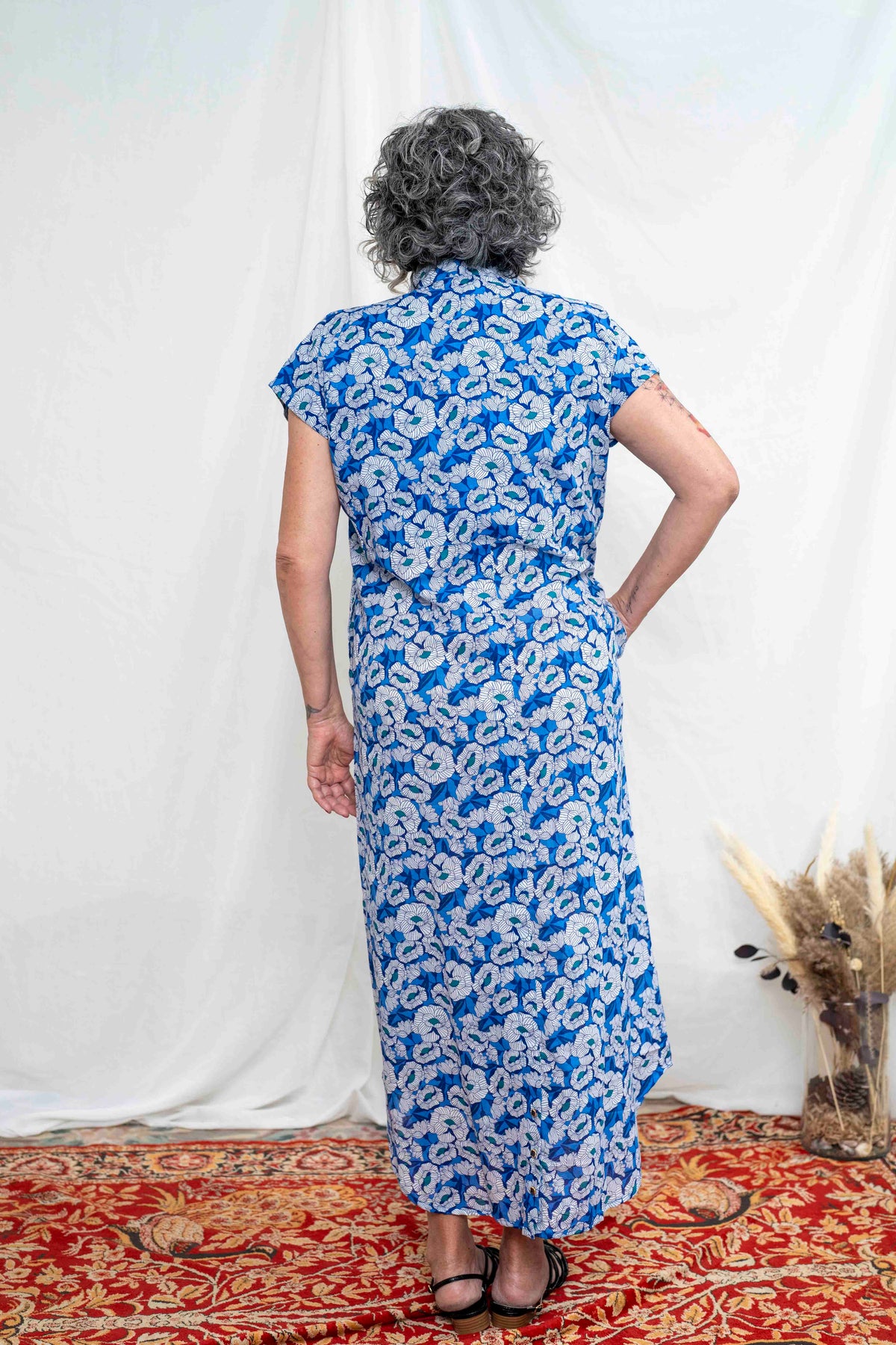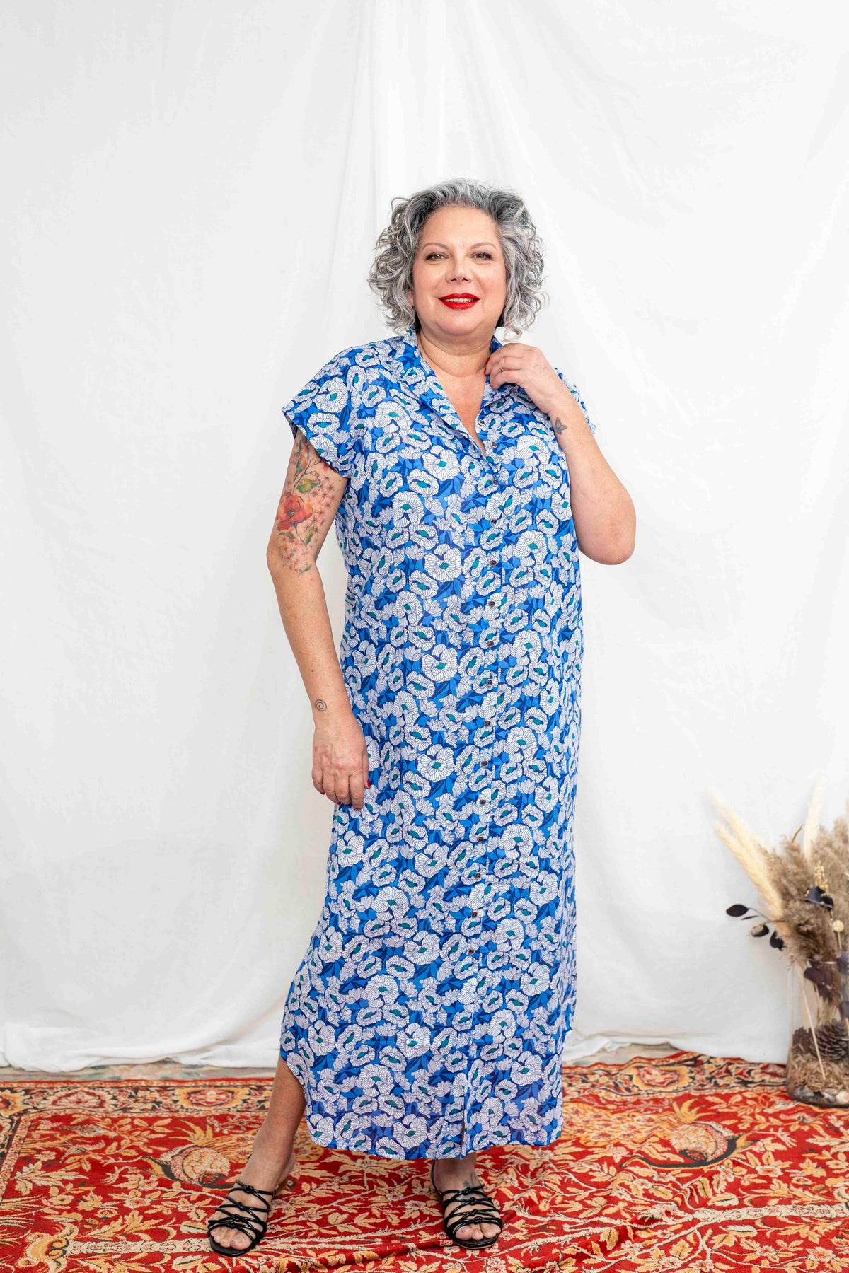 שמלת מקסי אוברסייז פרחי תכלת בשילוב צבעים של תכלת, כחול ולבן, עם דוגמה פרחונית מעניינת במיוחד, שמלה שהיא קלאסיקה.