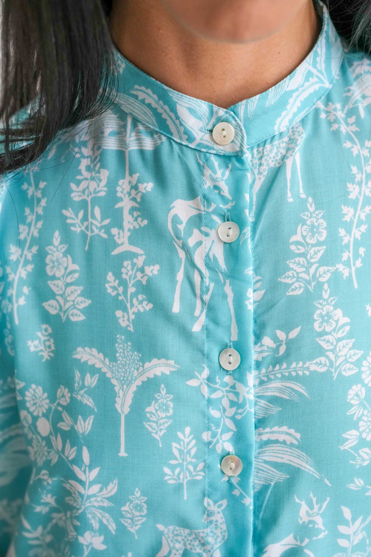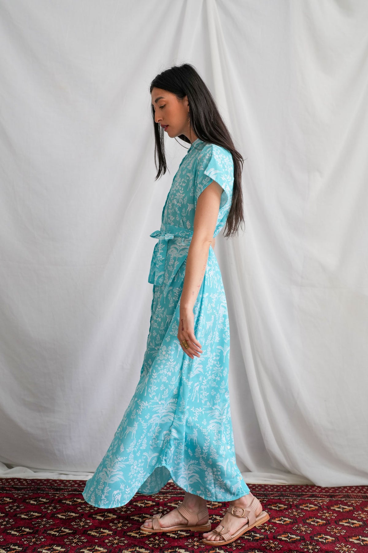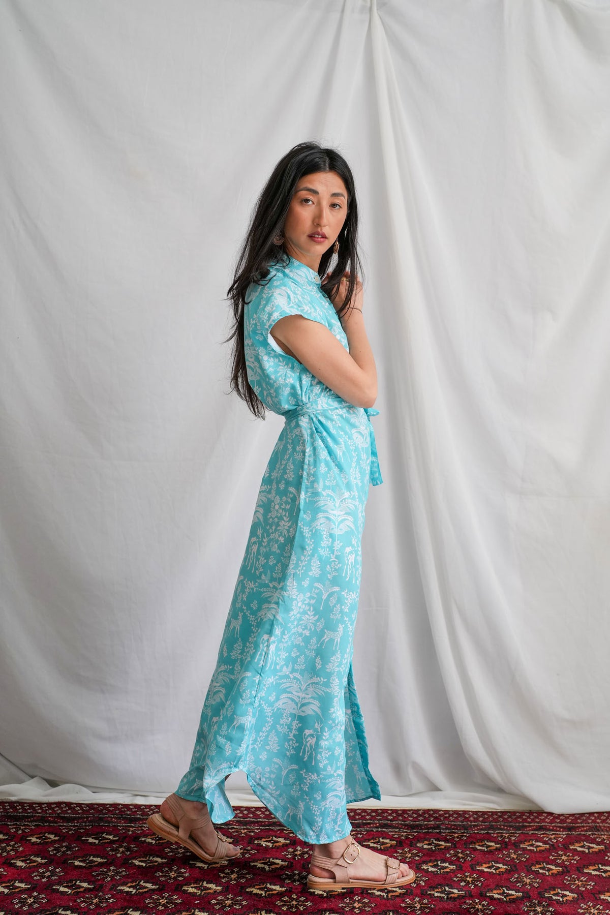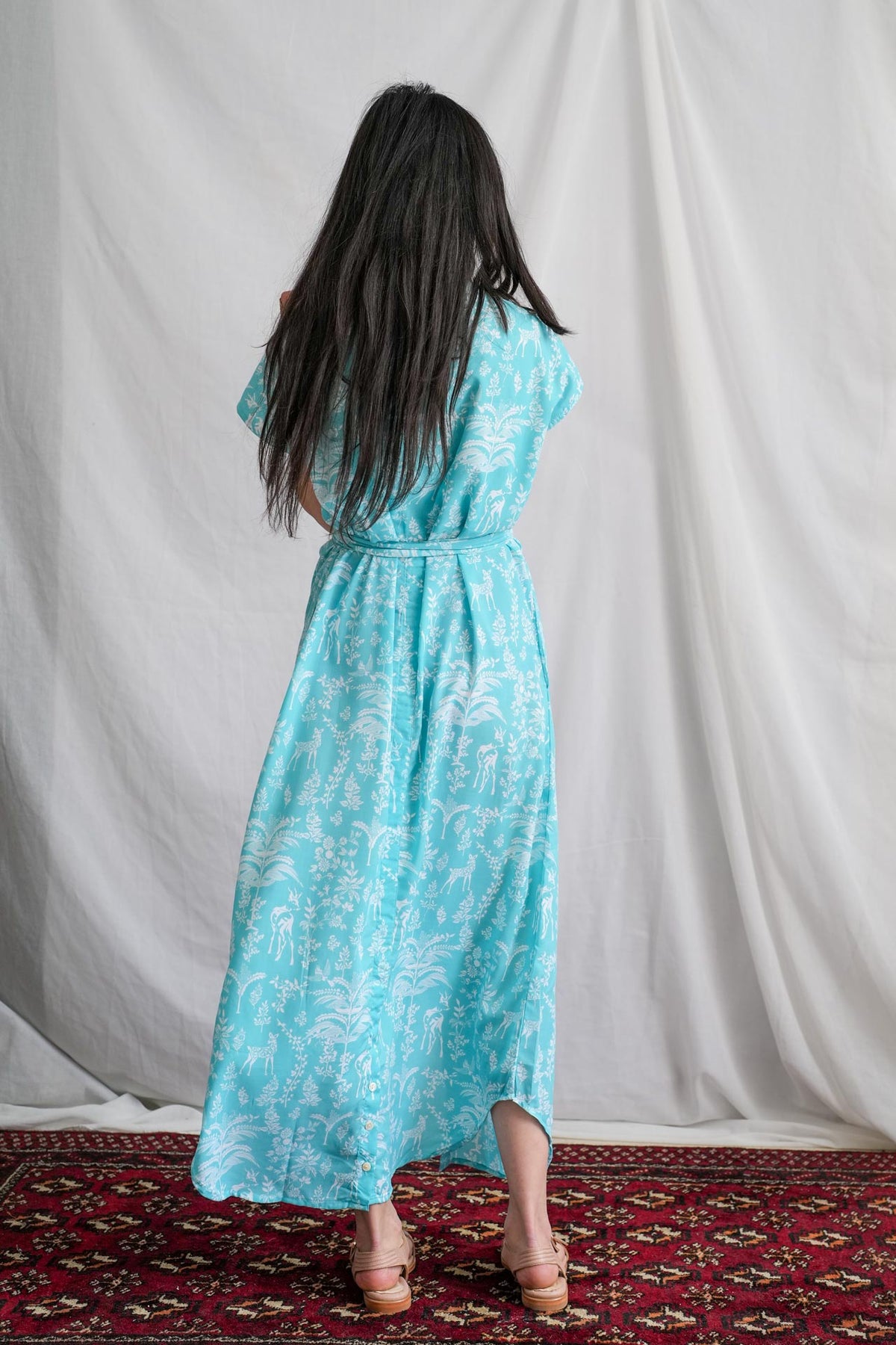 השמלה מעוטרת במוטיב של במבי חמוד על רקע תכלת בוהק ובעלת צווארון סיני ייחודי. זוג כיסים צדדיים וחגורה תואמת משלימים את המראה, ומאפשרים התאמה לכל סגנון.