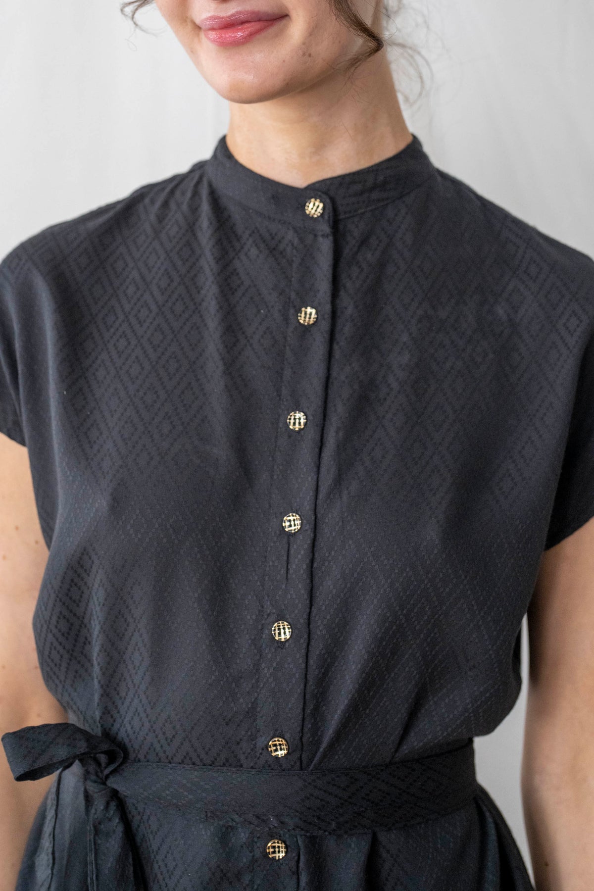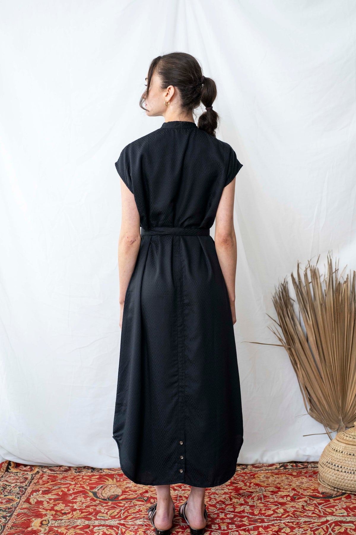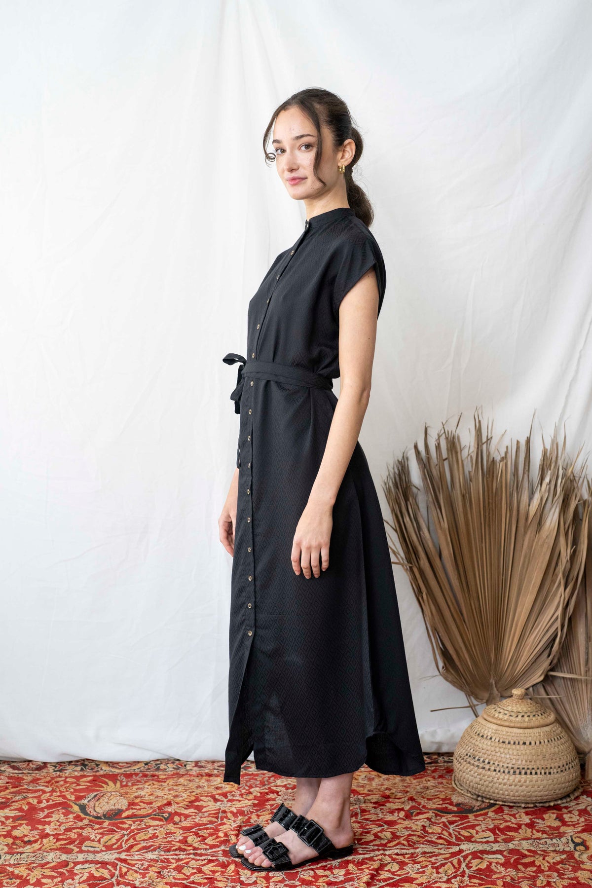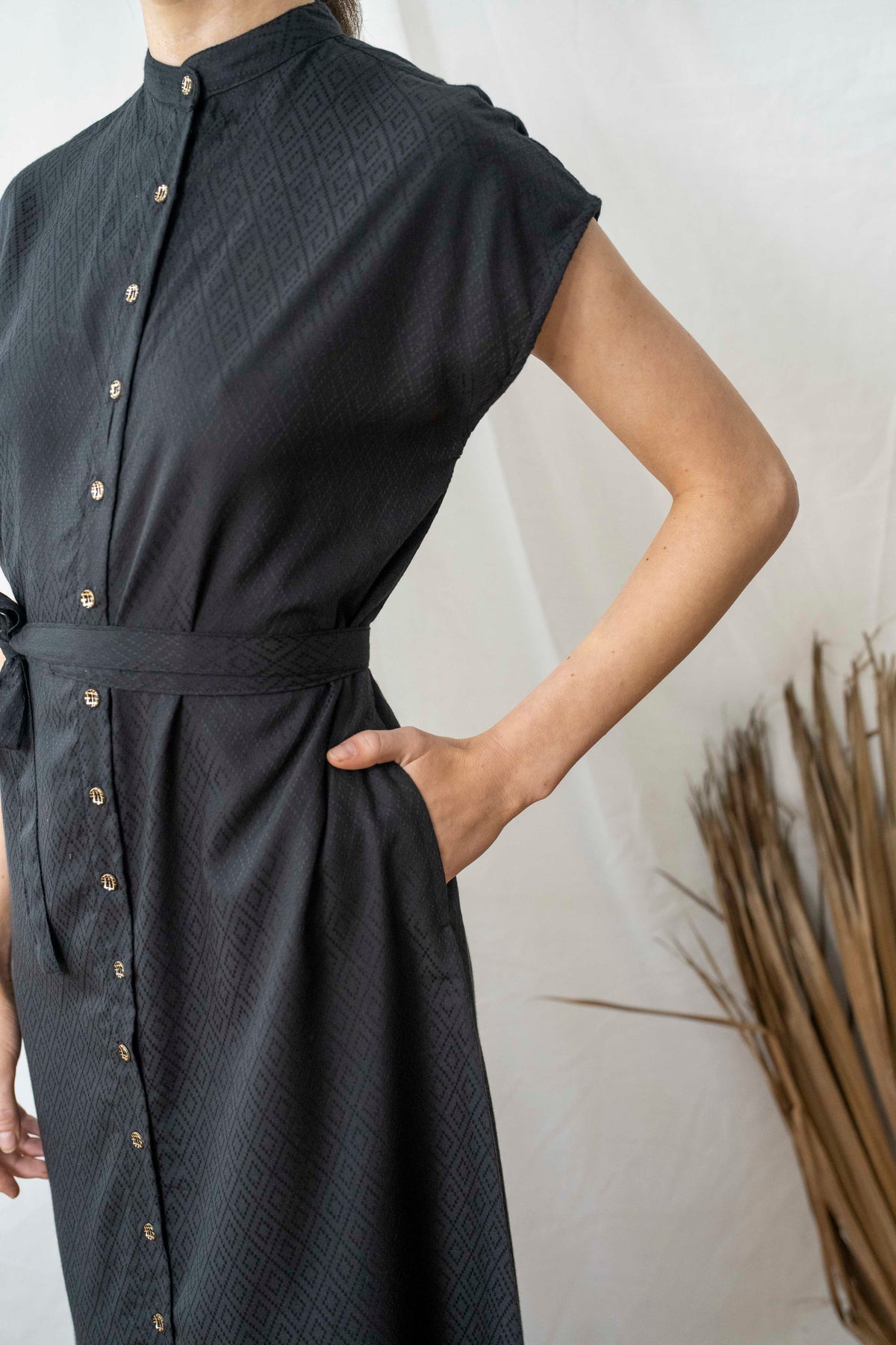 שמלת מקסי אוברסייז מעויינים שחורה היא השמלה השחורה הזו שכל אחת צריכה, עם דוגמה גאומטרית בבד - מאסט הב. בעלת גיזרת אוברסייז מושלמת וצווארון סיני. זוג כיסים צידיים וחגורה תואמת משלימים את המראה. ניתן לכפתר עד למעלה או לפתוח את הכפתורים למחשוף מבוקש ולהשתמש בה כקאפטן או לקשור להדגשת המותן.
