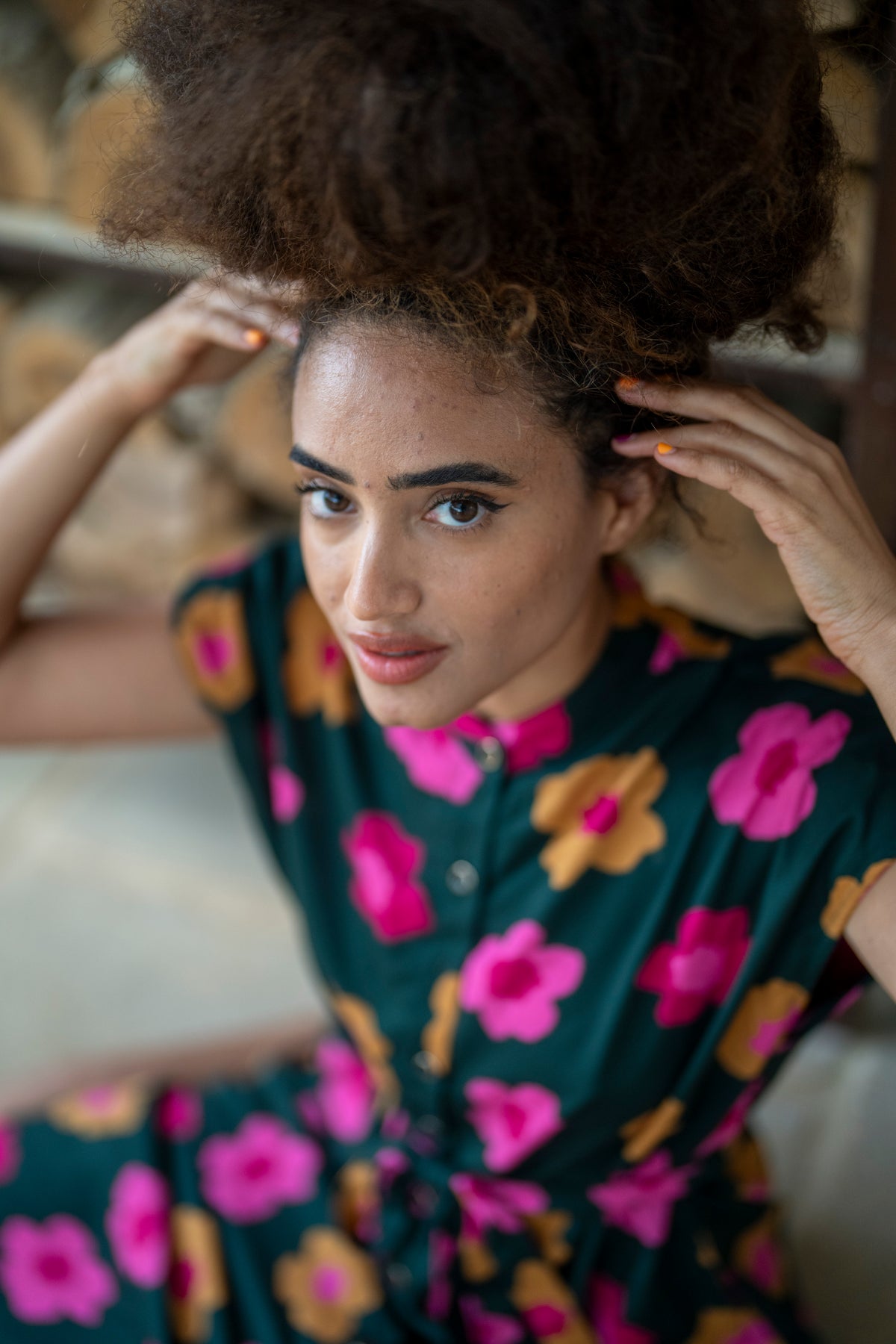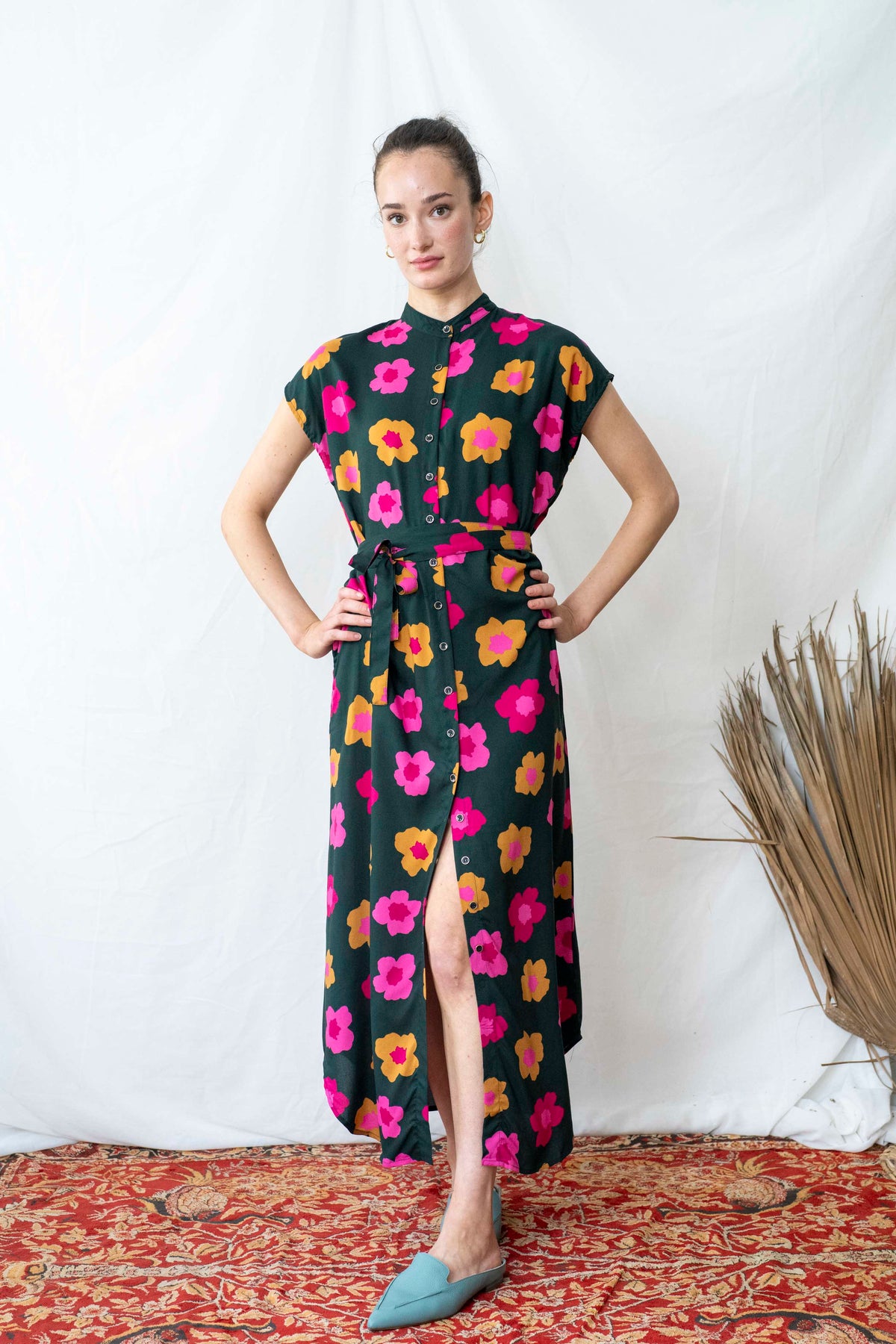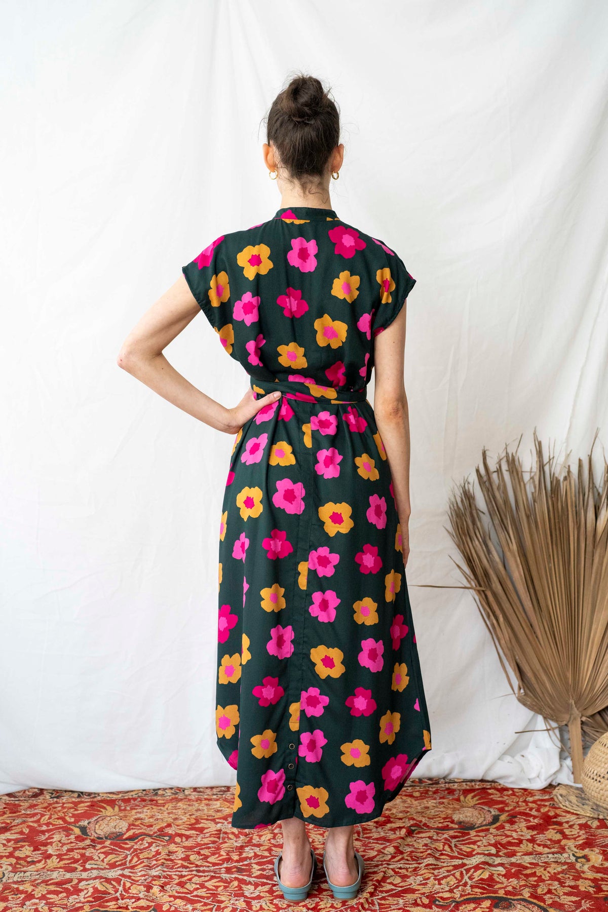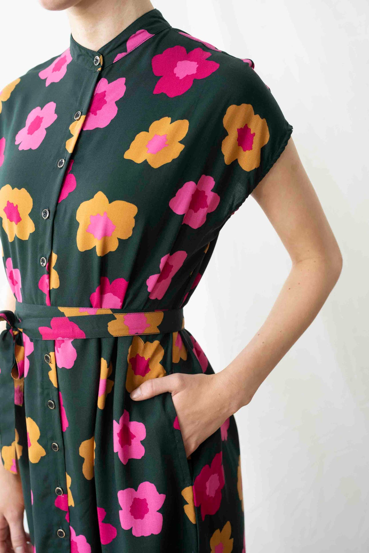 שמלה שחורה מעוטרת במוטיבים של פרחים גדולים וורודים, כשמה כן היא - שמלה בעלת נוכחות, בצבעוניות שעושה טוב בלב ובעיניים, ובעלת צווארון סיני ייחודי. זוג כיסים צדדיים וחגורה תואמת משלימים את המראה, ומאפשרים התאמה לכל סגנון.