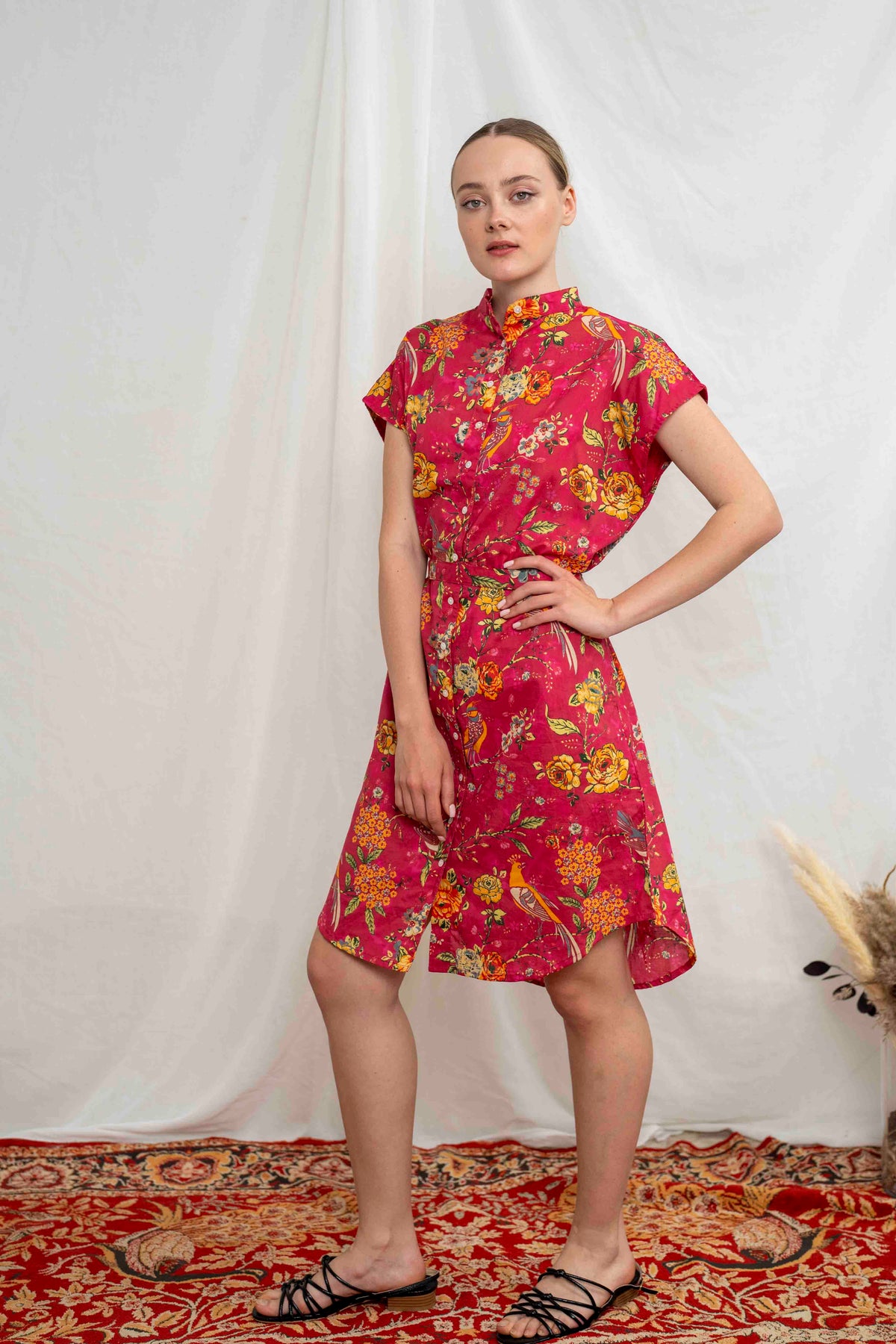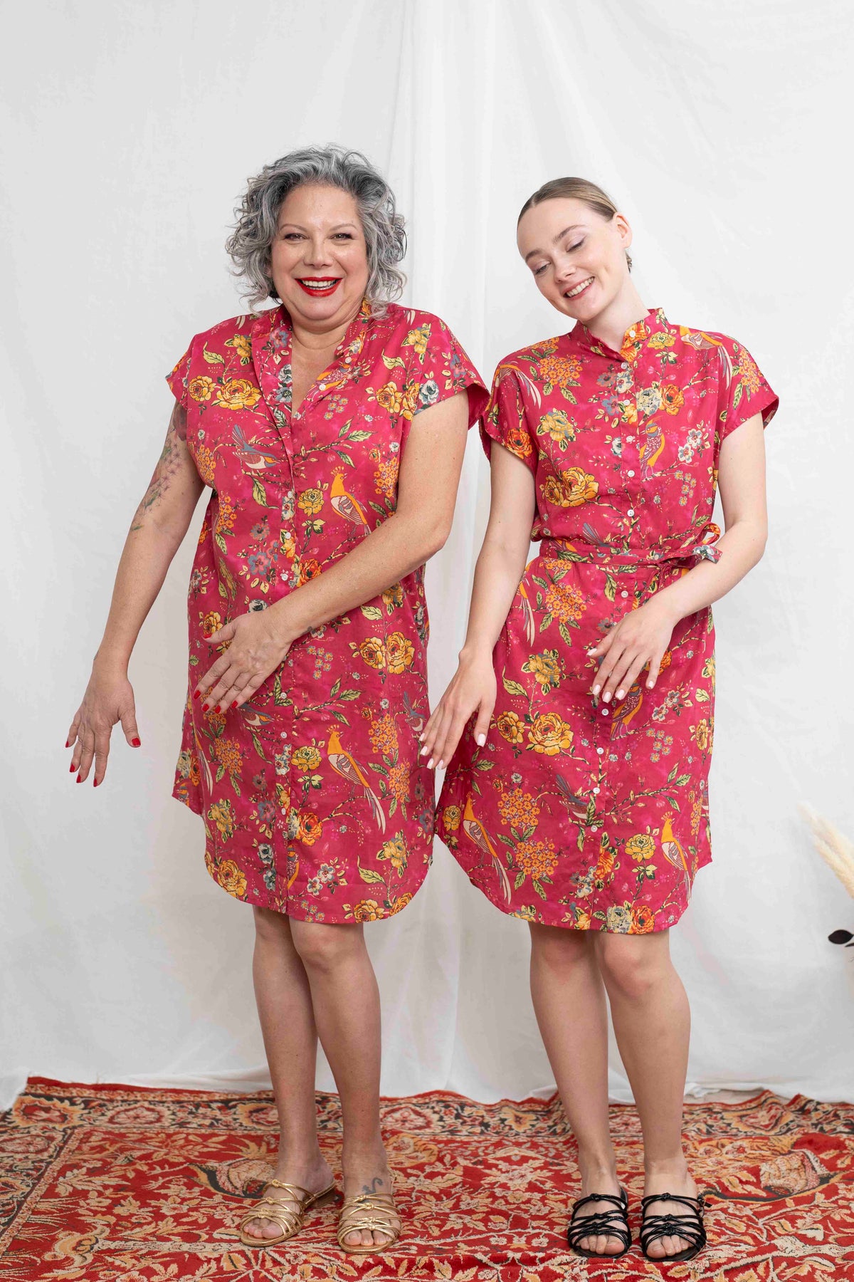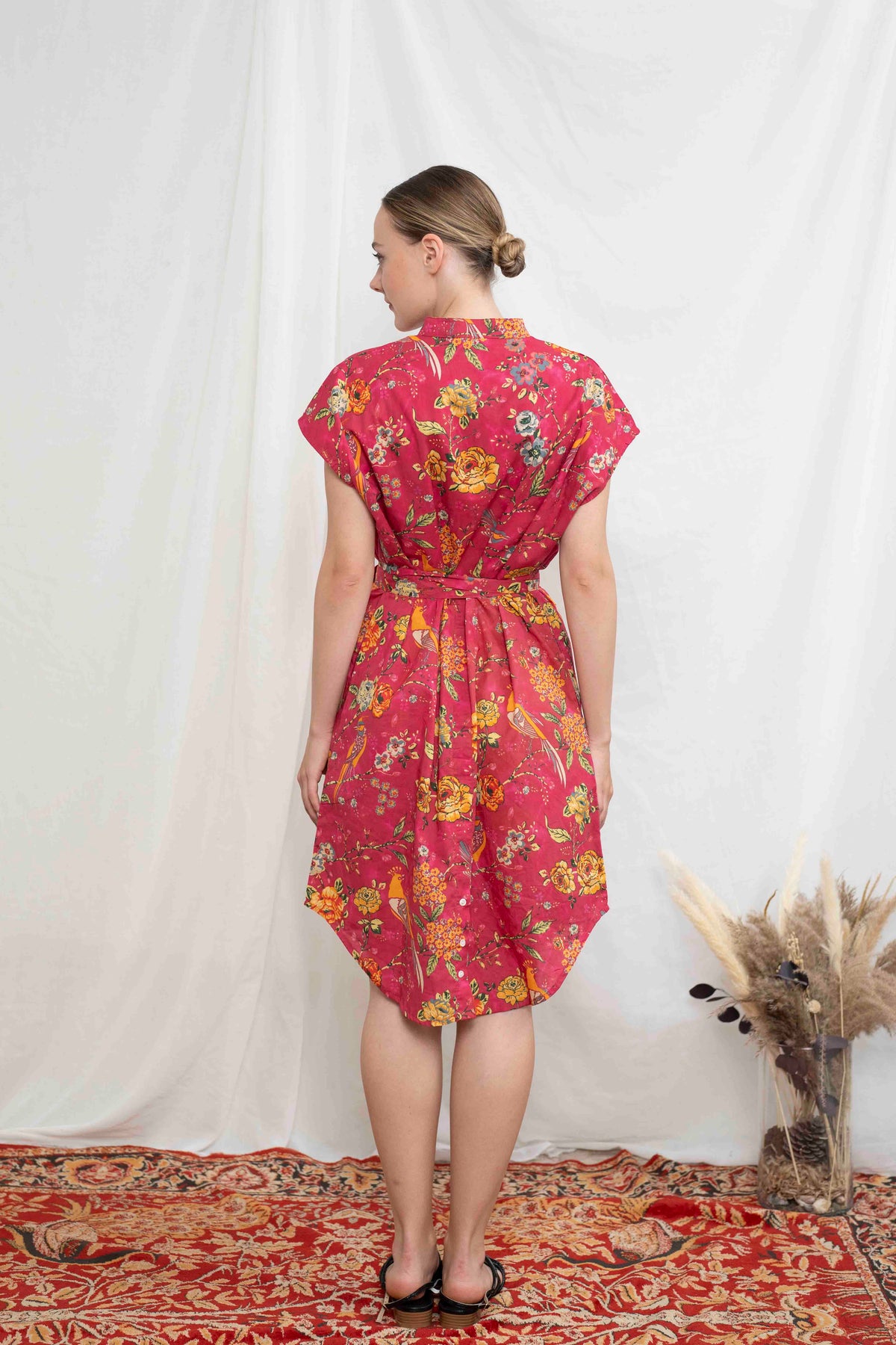 שמלת מידי אוברסייז ציפורי אהבה בעלת צבעוניות והדפס רומנטיים במיוחד, בשילוב צבעים משמח של פוקסיה וחרדל.