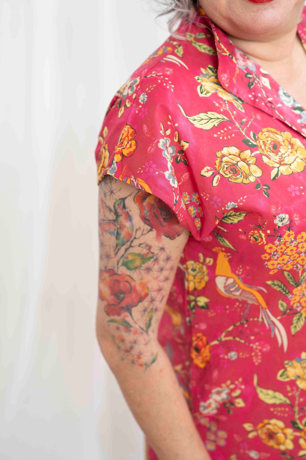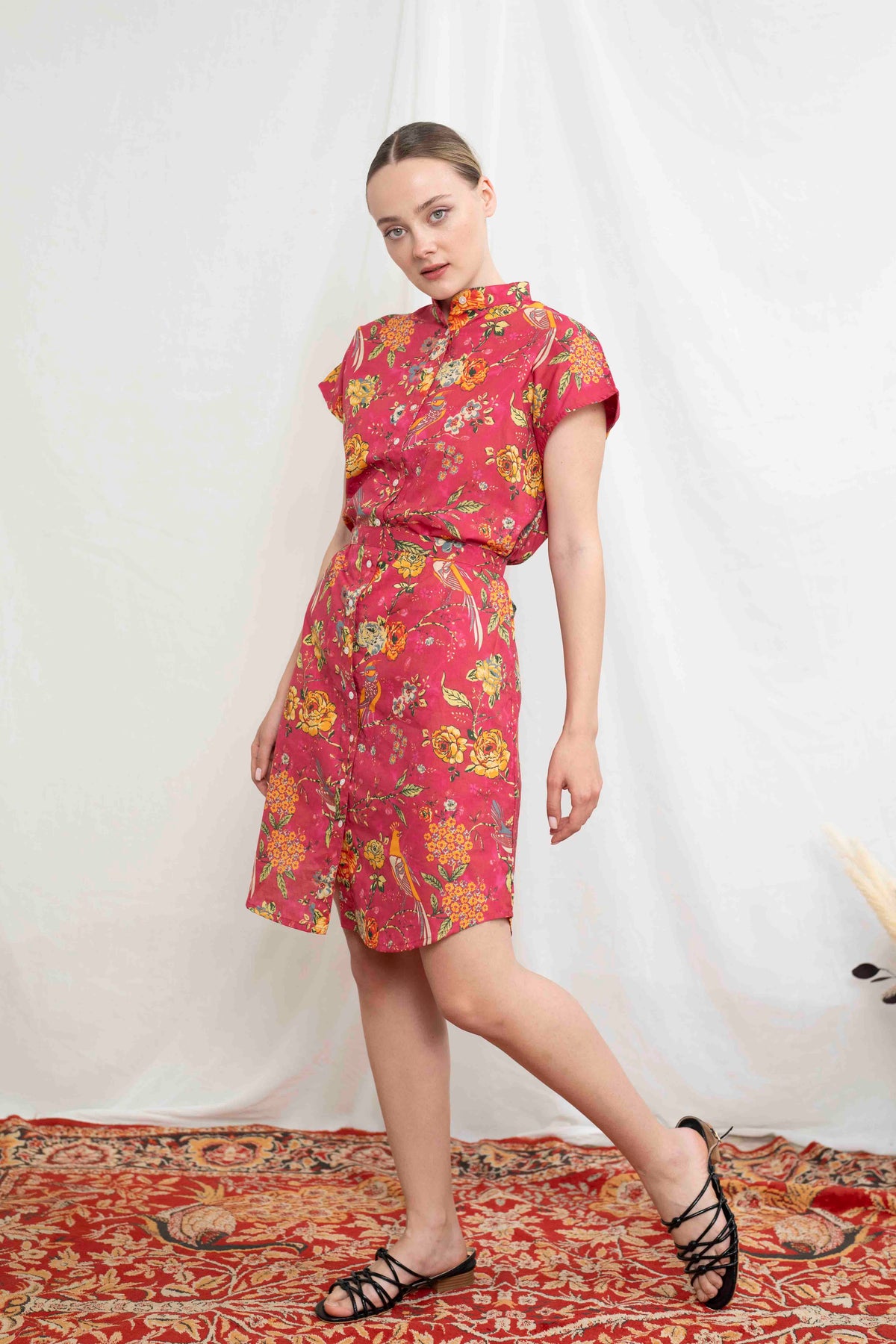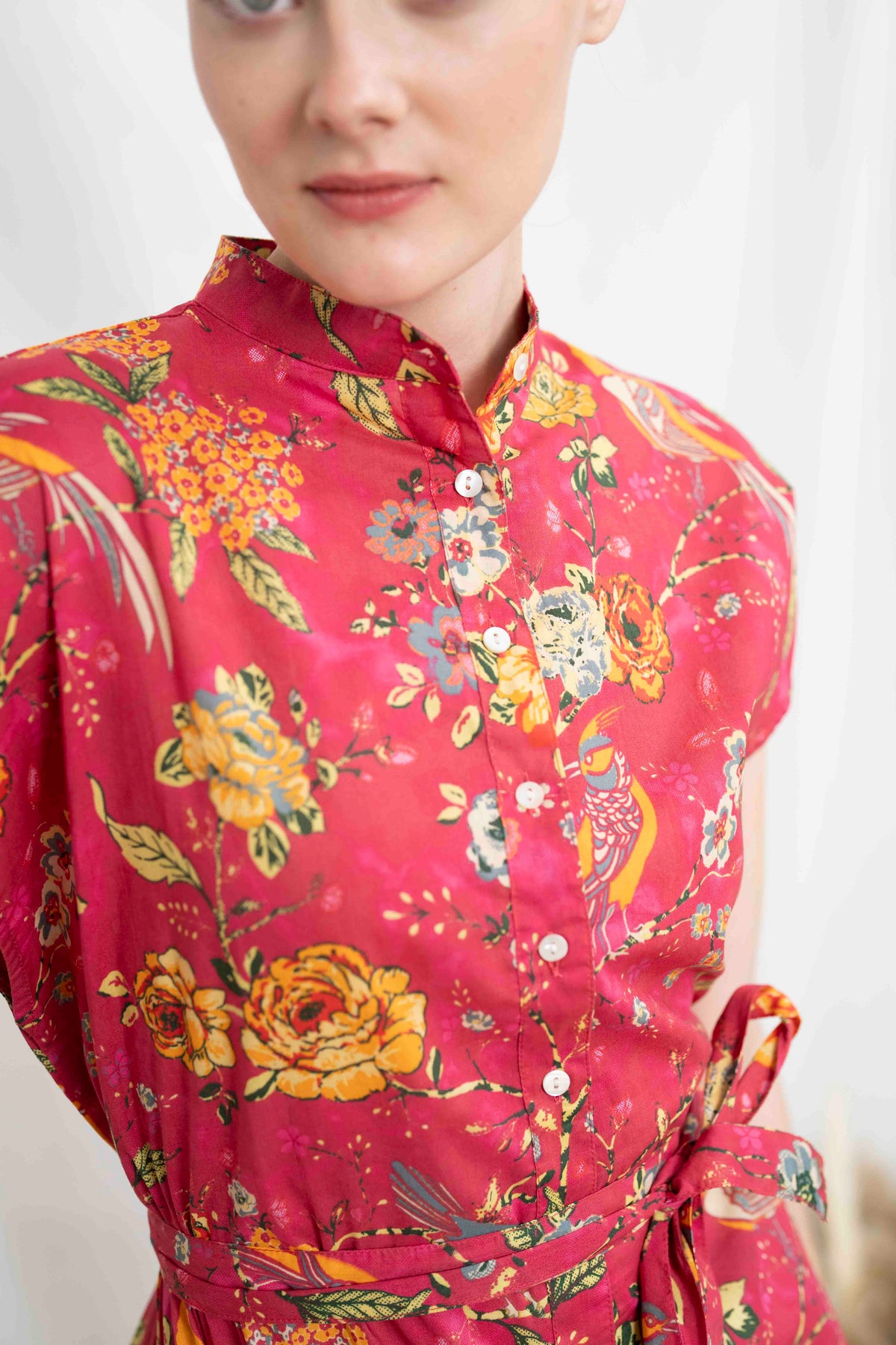 שמלת מידי אוברסייז ציפורי אהבה בעלת צבעוניות והדפס רומנטיים במיוחד, בשילוב צבעים משמח של פוקסיה וחרדל.