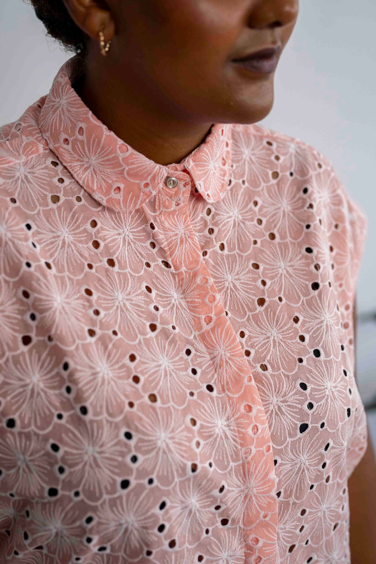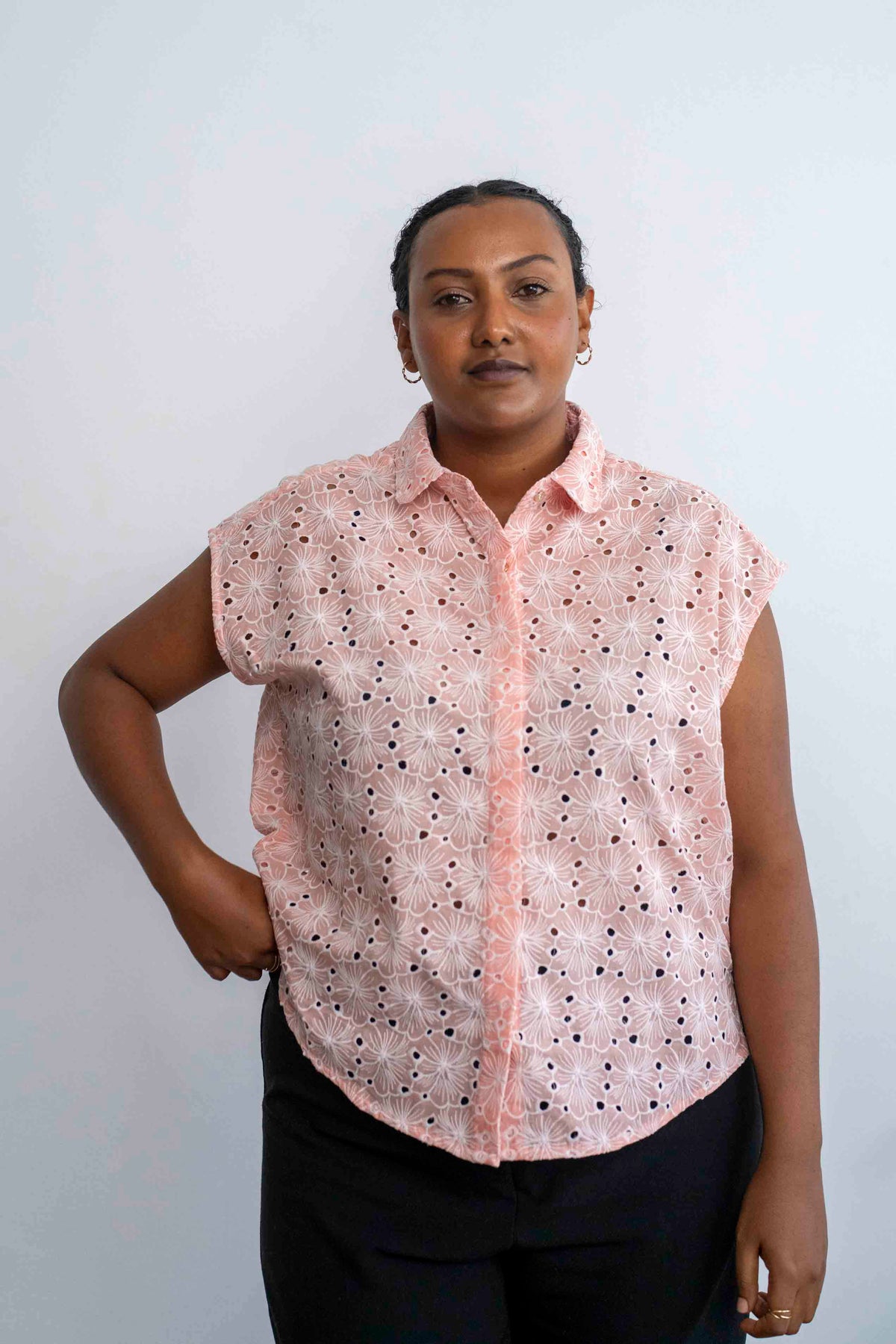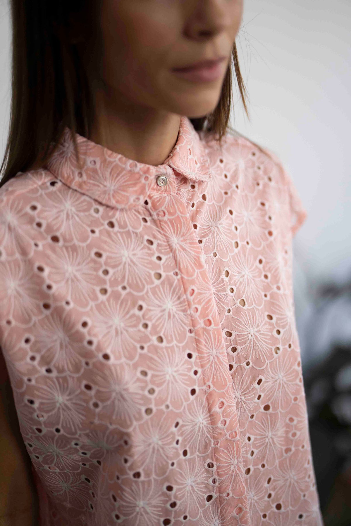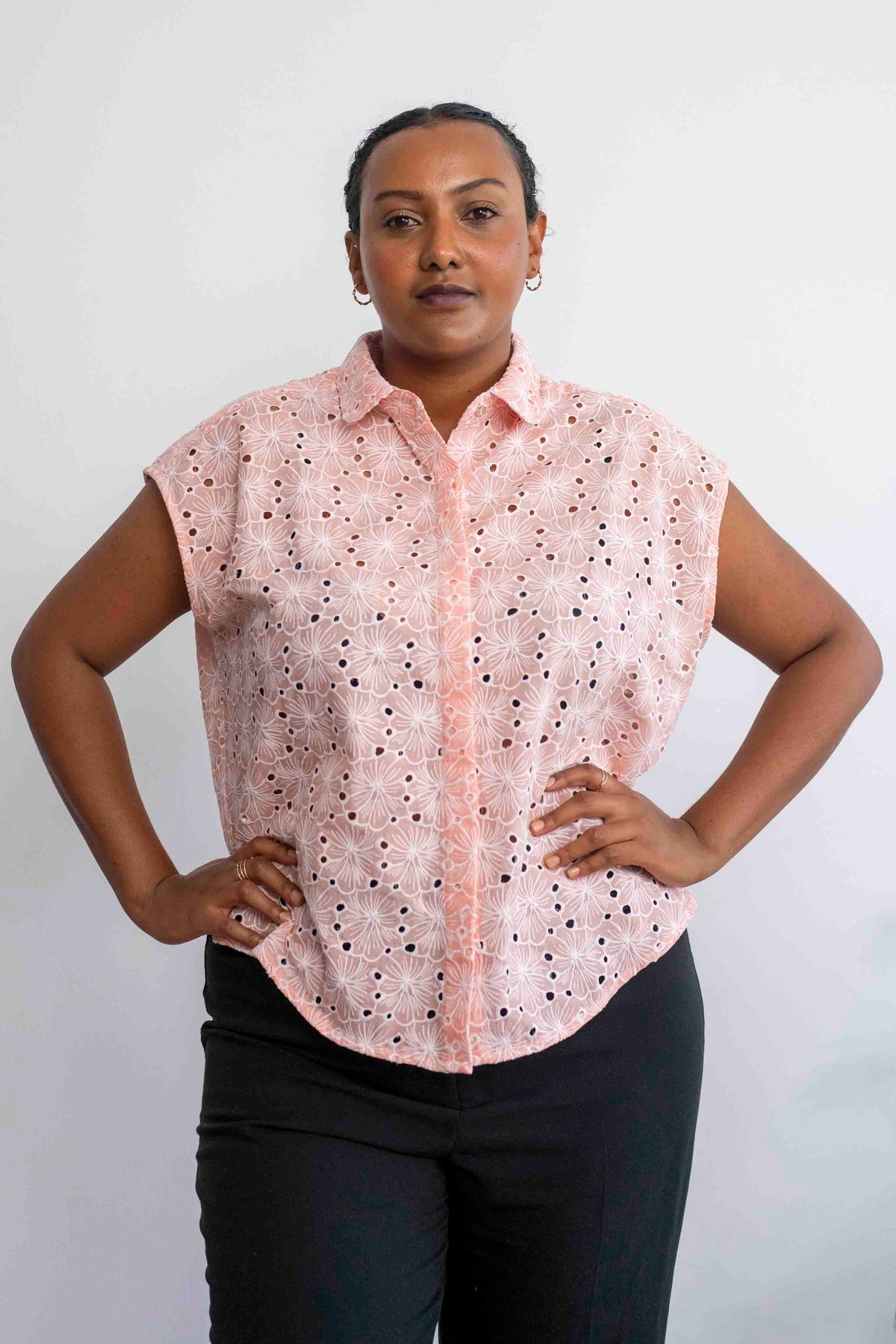 חולצת נעמי אפרסק היא חולצה קלאסית העשויה מבד כותנה רקום בגוון ורוד-כתמתם, בעלת צווארון מעוגל וכפתורים מחופים לאורך הבגד, למעט הכפתור העליון שחשוף.