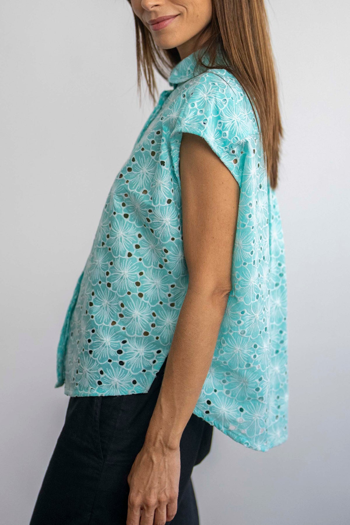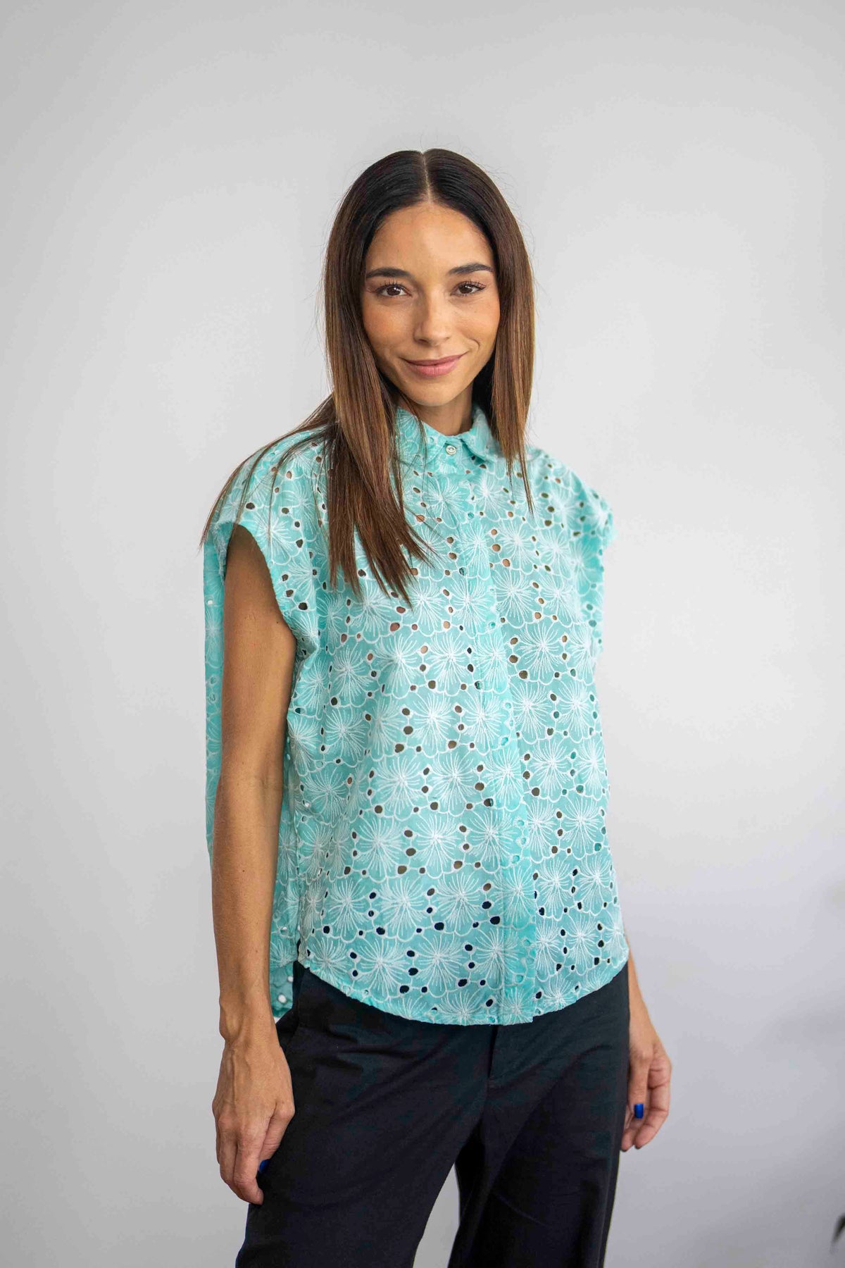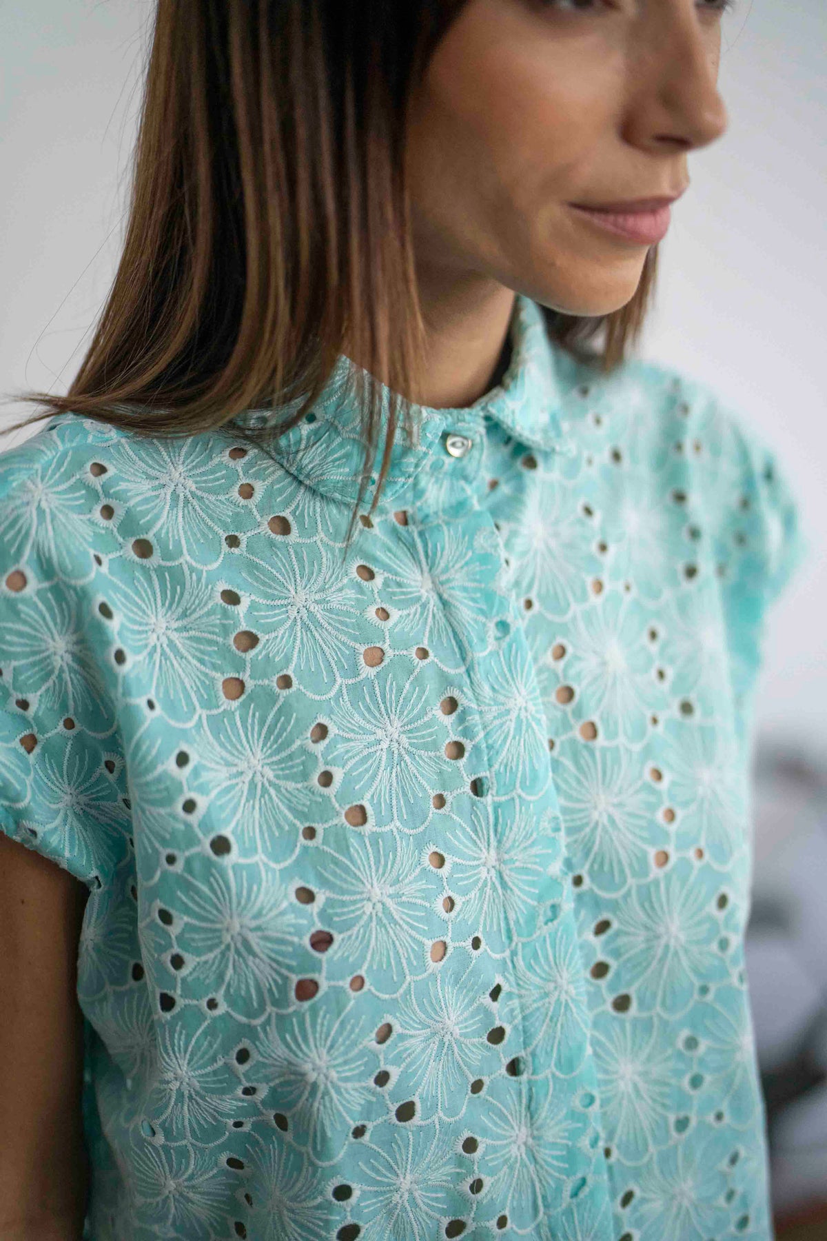 חולצת נעמי מנטה היא חולצה קלאסית העשויה מבד כותנה רקום בגוון טורקיז-תכלת, בעלת צווארון מעוגל וכפתורים מחופים לאורך הבגד, למעט הכפתור העליון שחשוף.
