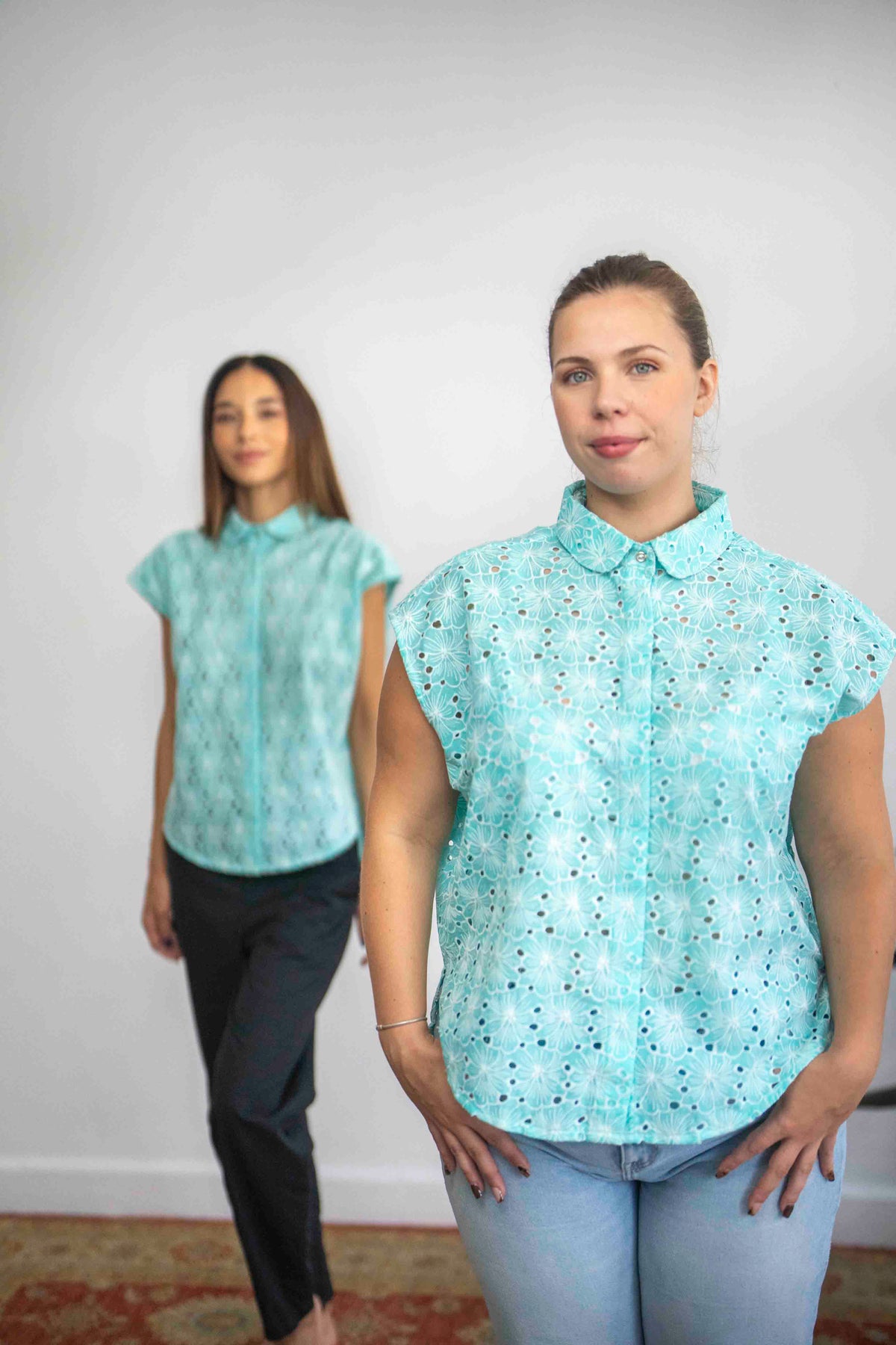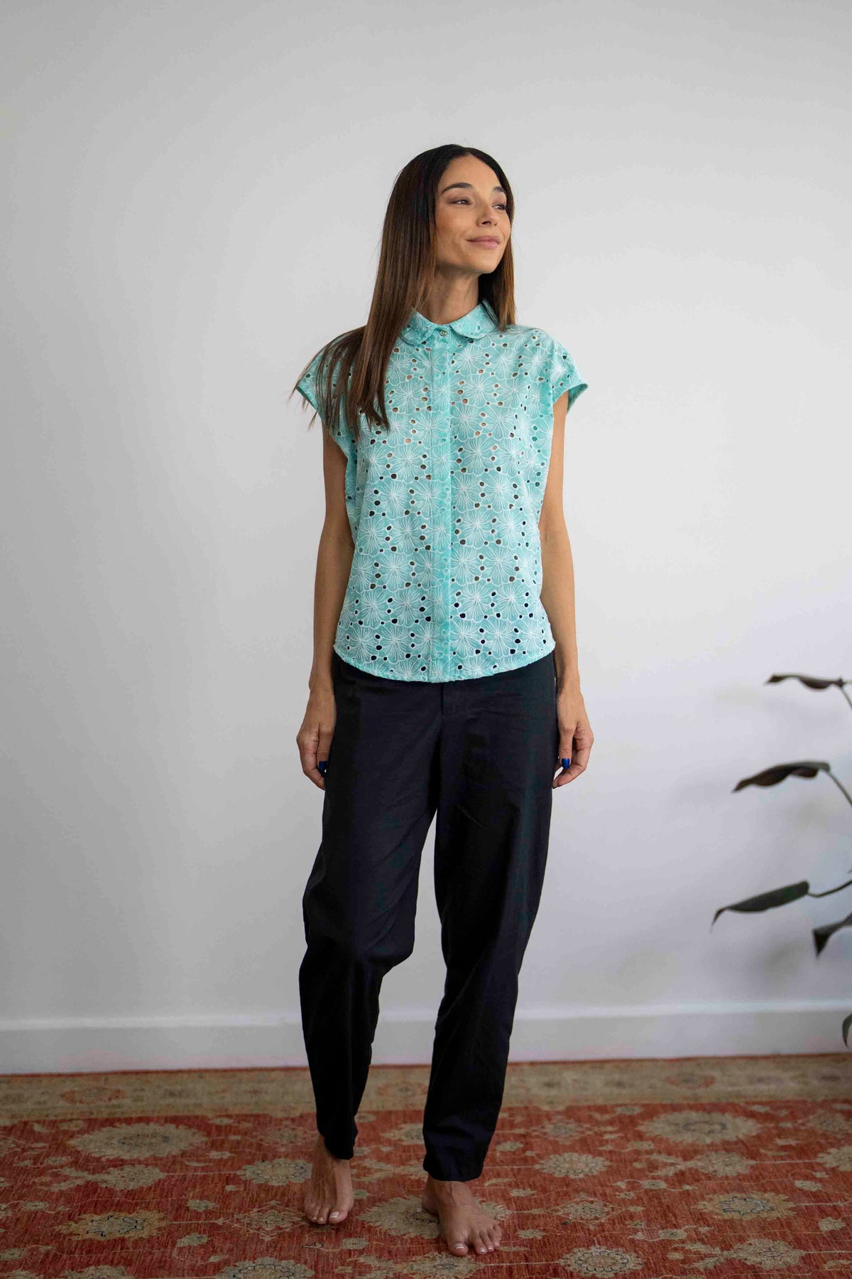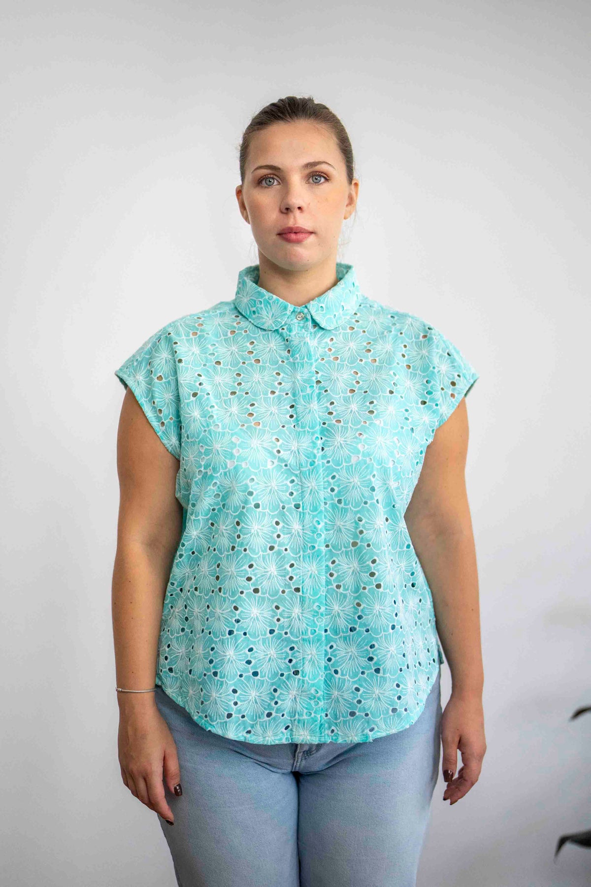 חולצת נעמי מנטה היא חולצה קלאסית העשויה מבד כותנה רקום בגוון טורקיז-תכלת, בעלת צווארון מעוגל וכפתורים מחופים לאורך הבגד, למעט הכפתור העליון שחשוף.