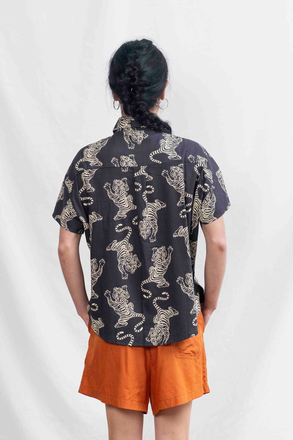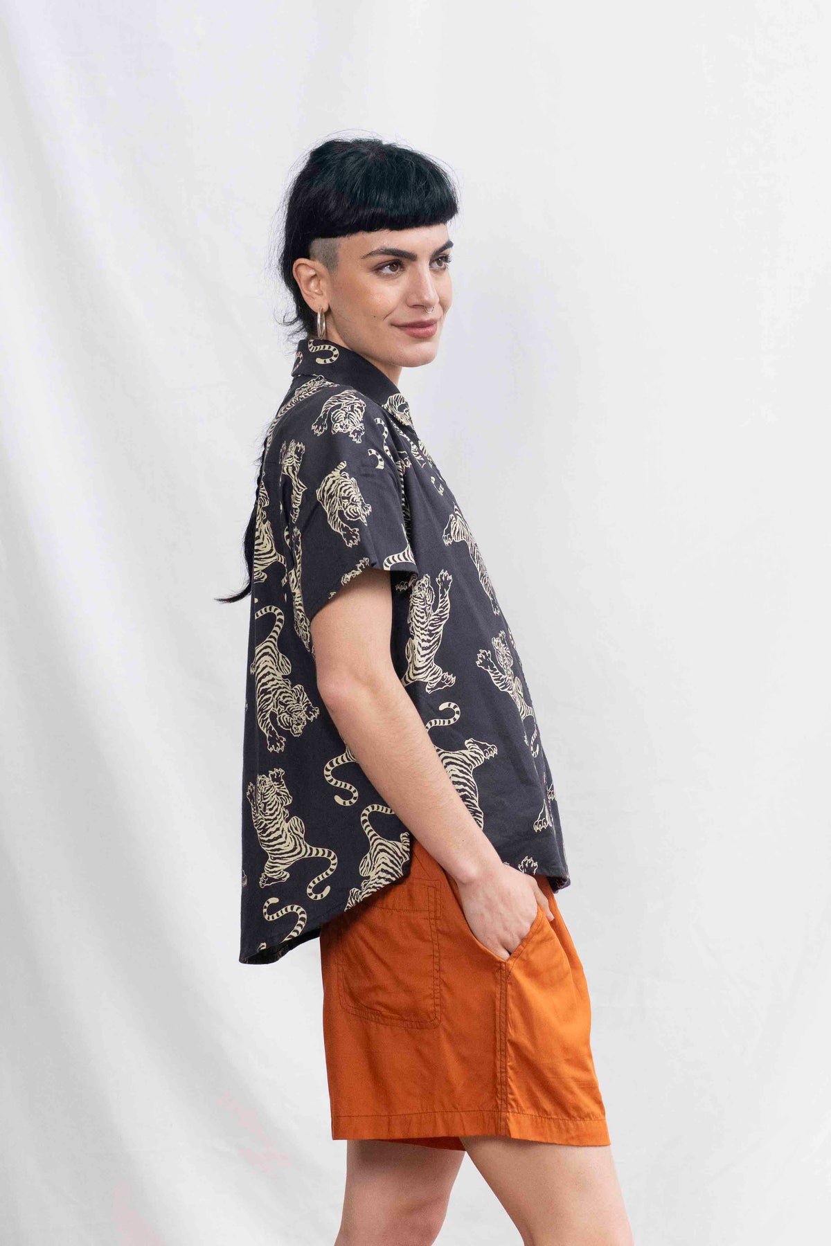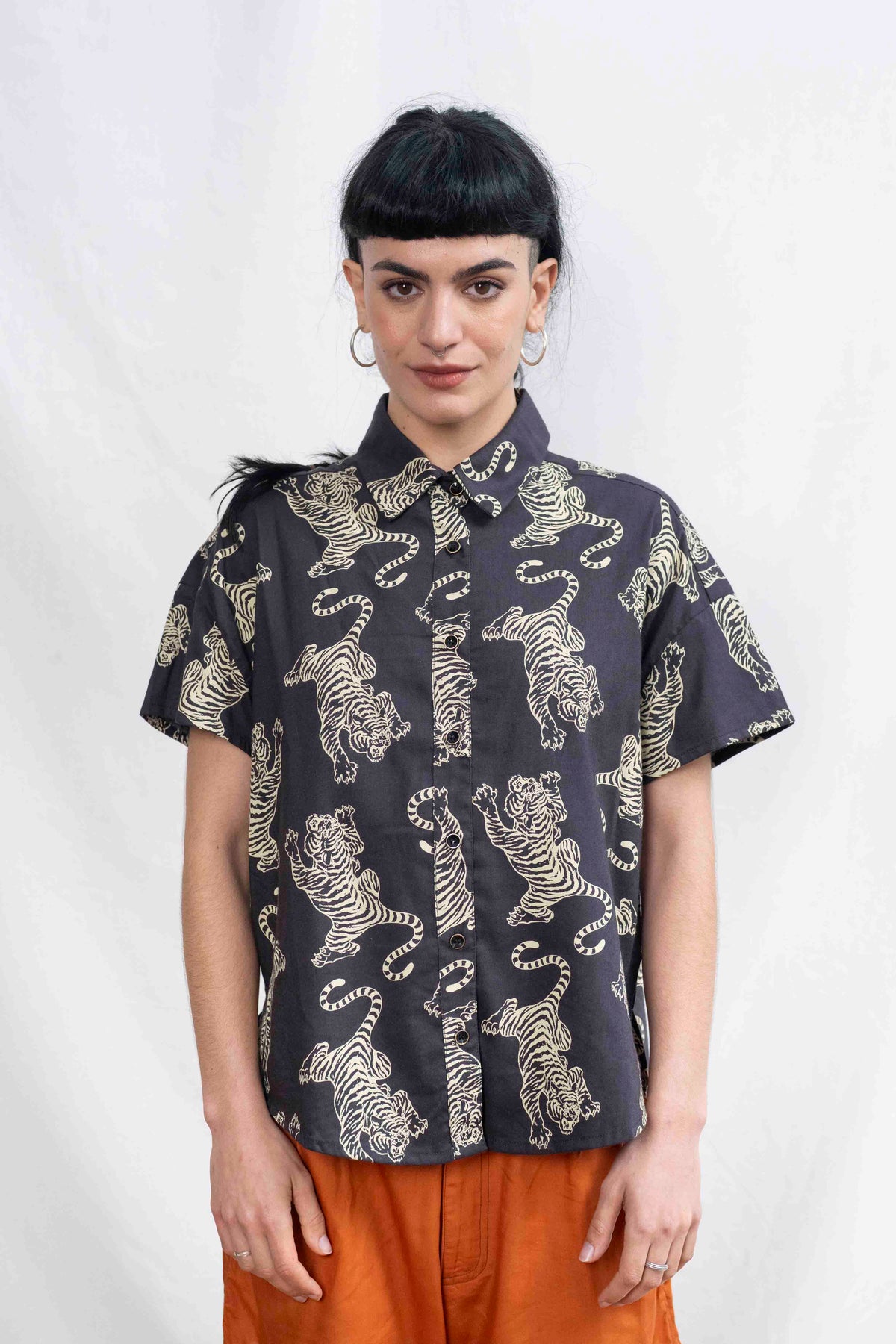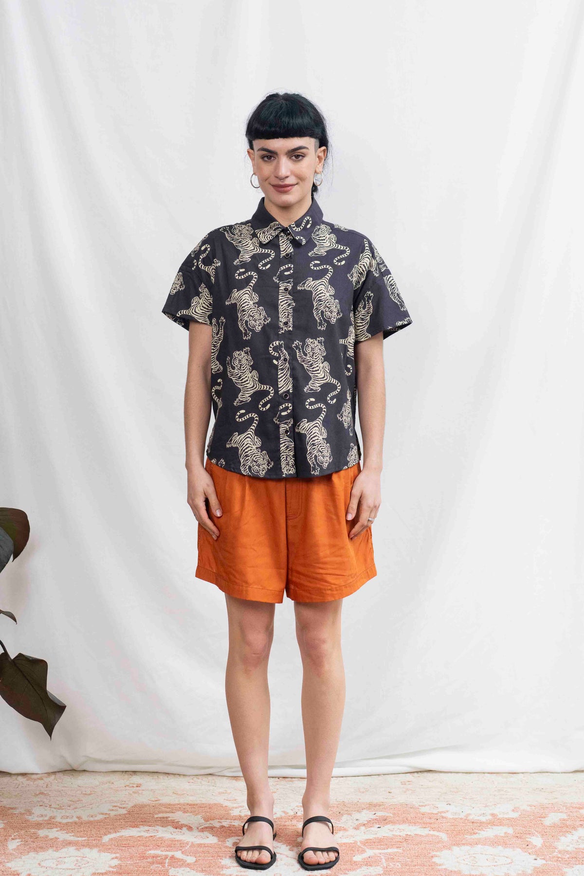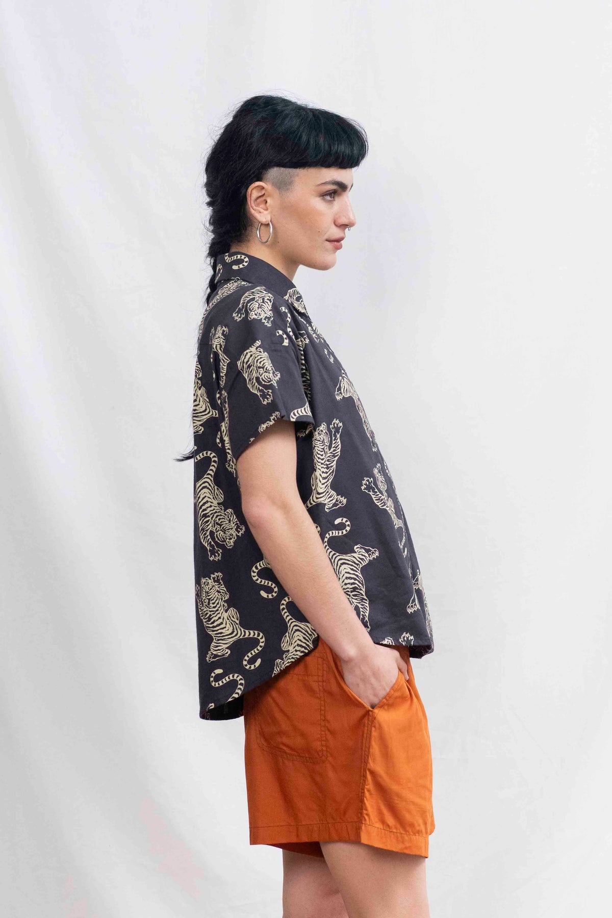 חולצת רון שומרת על המבנה האהוב שלה – גזרת אוברסייז נינוחה, שרוולים קצרים עם כתף מעט שמוטה, צווארון מחויט וכפתורים לכל האורך. השסעים הקטנים בצדי המכפלת מוסיפים חופש תנועה וזרימה עדינה. זו חולצה שתמיד עושה רושם – בין אם תשלבי אותה עם מכנסיים מחויטים או ג'ינס פשוט – היא הופכת כל אאוטפיט לאמירה.