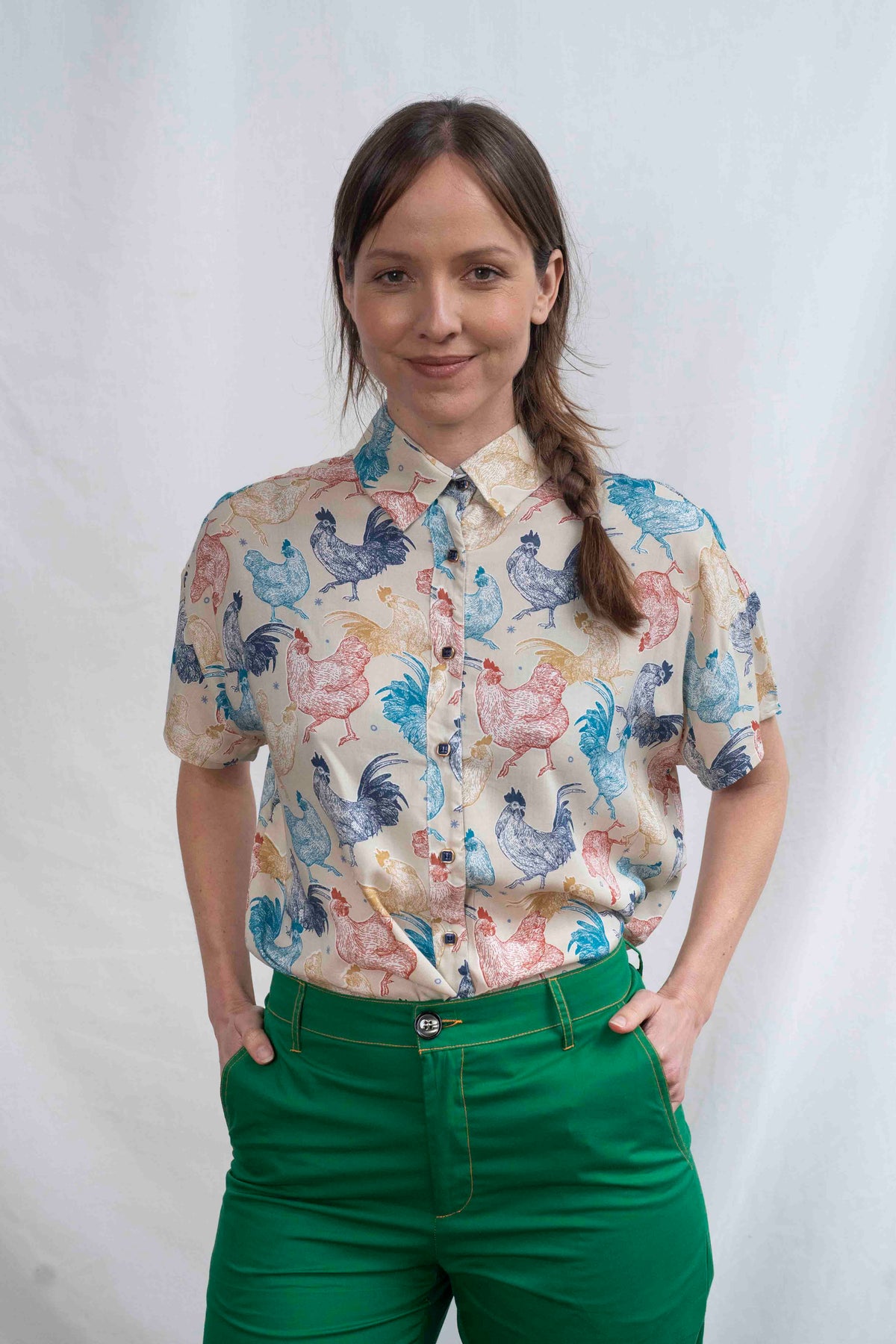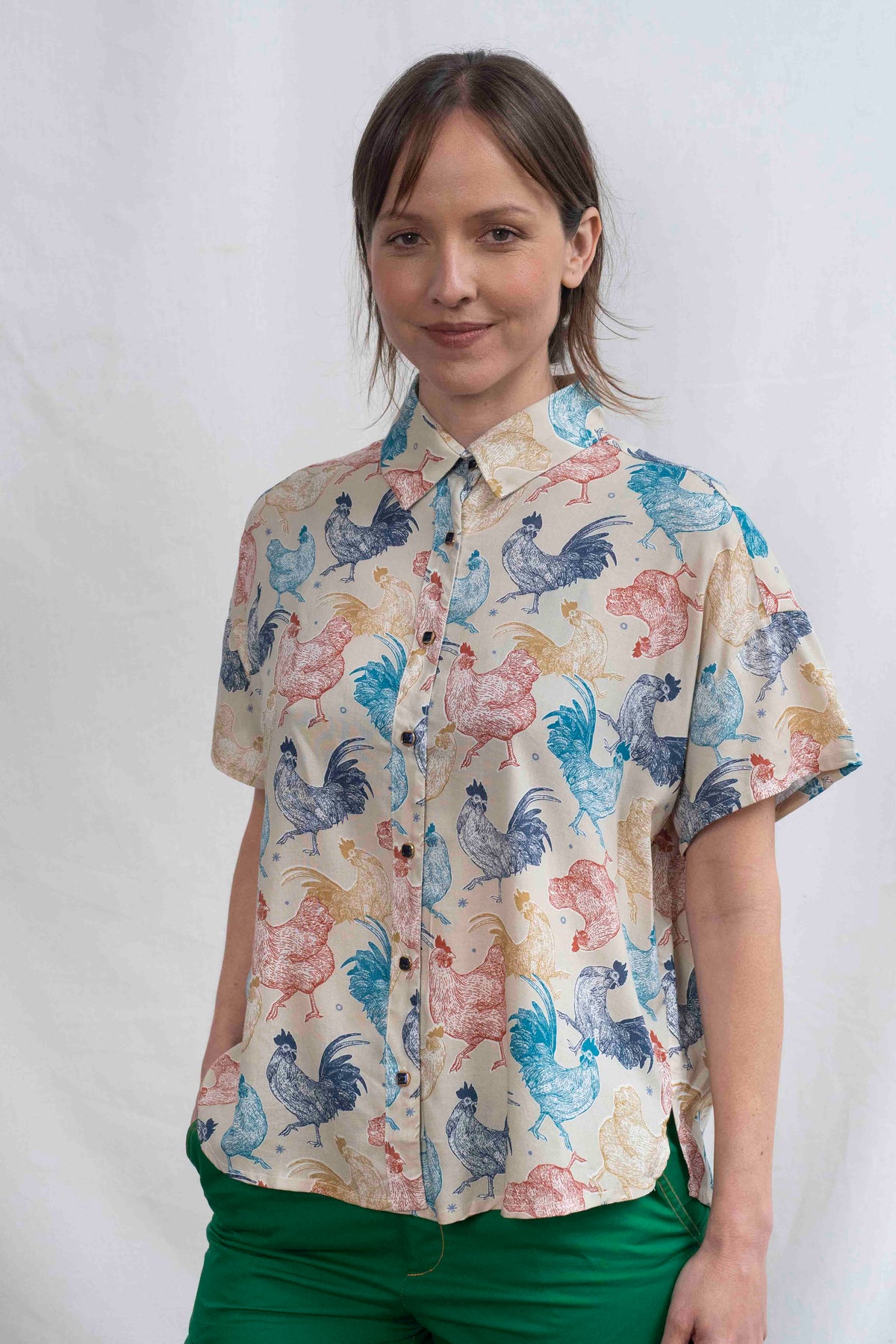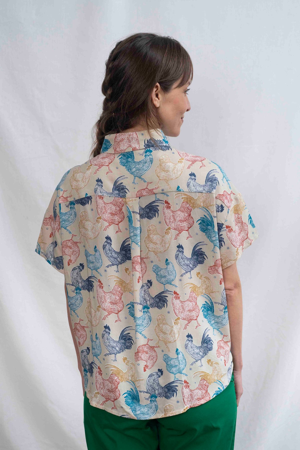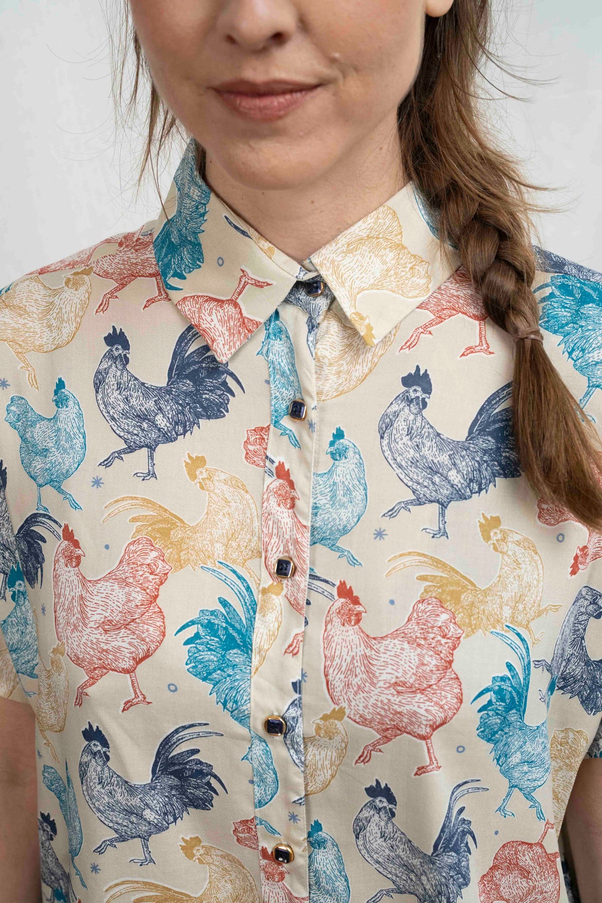 חולצת רון רוסטרס מעוטרת בתרנגולים צבעוניים וגדולים, חולצה שהיא סטייטמנט.