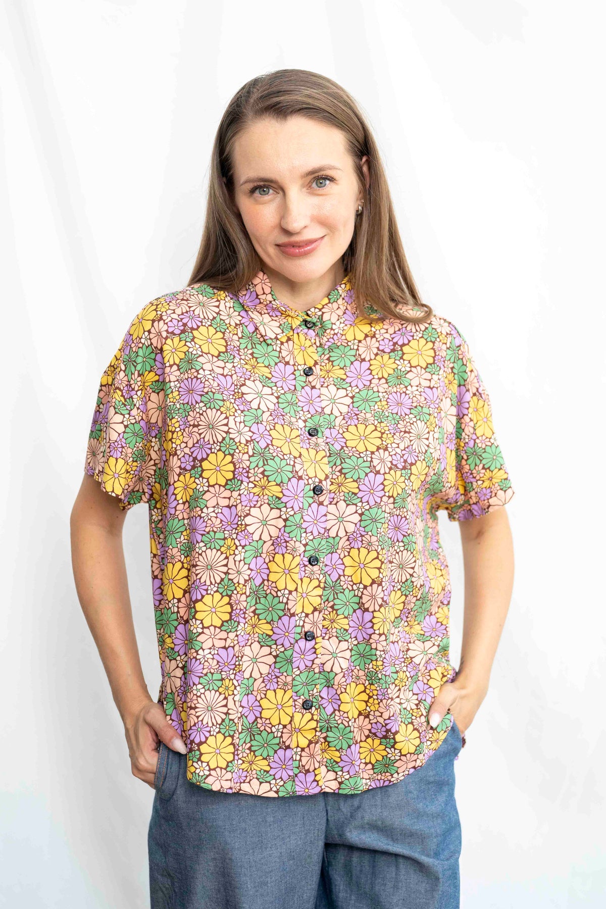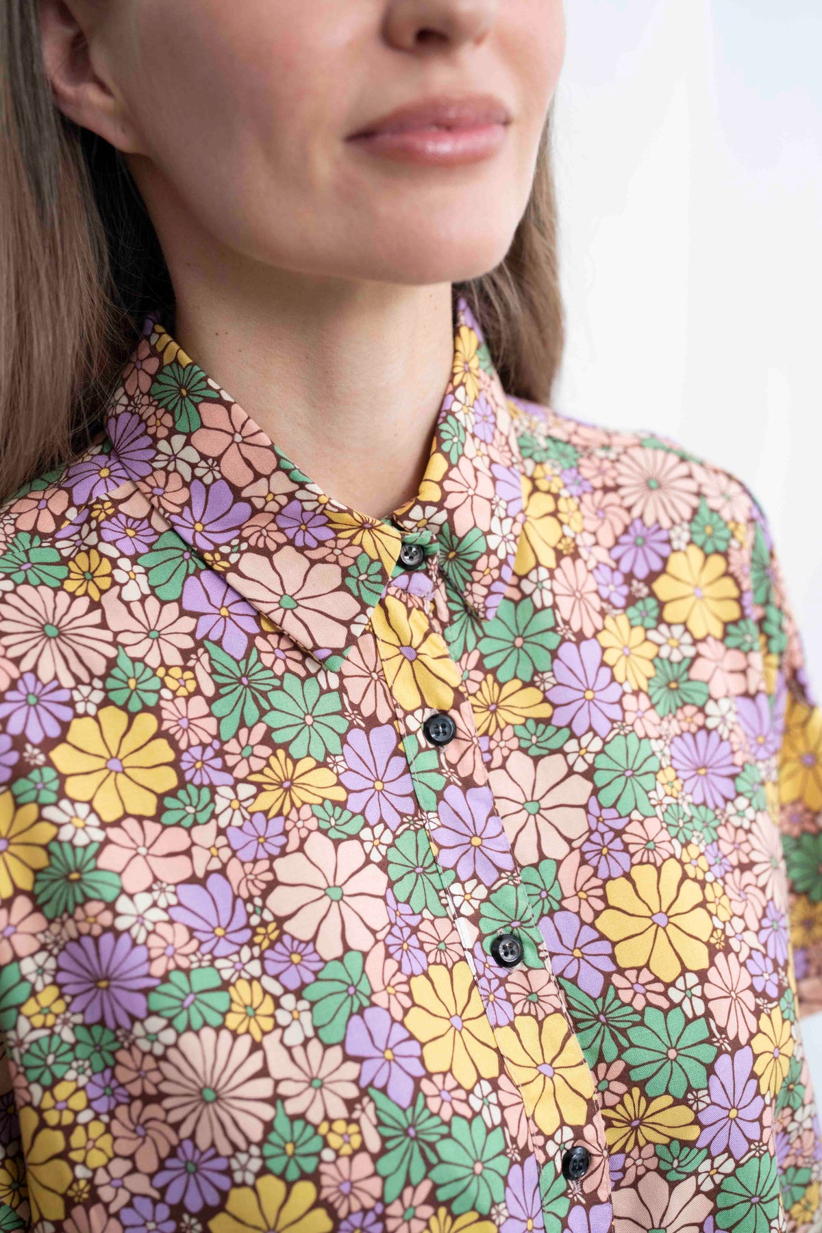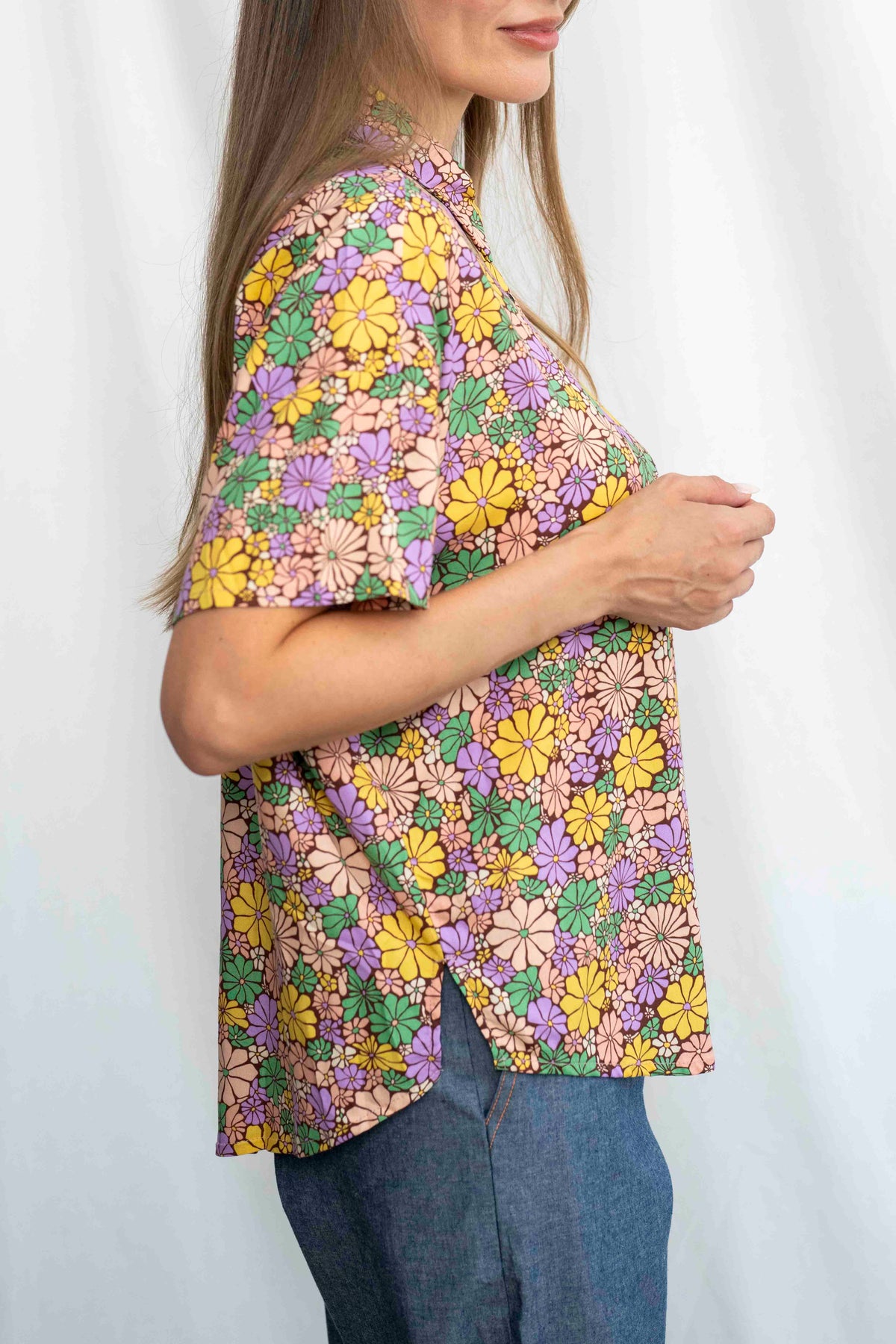 הדפס פרחוני נועז וססגוני בגווני צהוב, סגול, ורוד וירוק, שמזכיר את הווייבים העליזים והחופשיים של שנות ה־70, מעניק לחולצה הזו אופי ייחודי ונוכחות בלתי מתפשרת. כל פרח מצויר בקו שחור דק, שמדגיש את הצבעוניות ומוסיף תחושת עומק ועבודת יד. הבד רך ונעים, קליל ומתאים בדיוק לימים שאת רוצה לשדר אופטימיות וסטייל בלי להתאמץ.