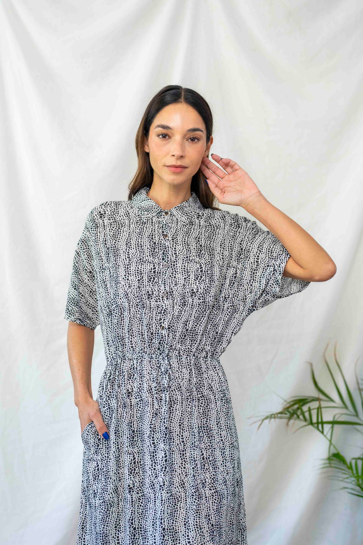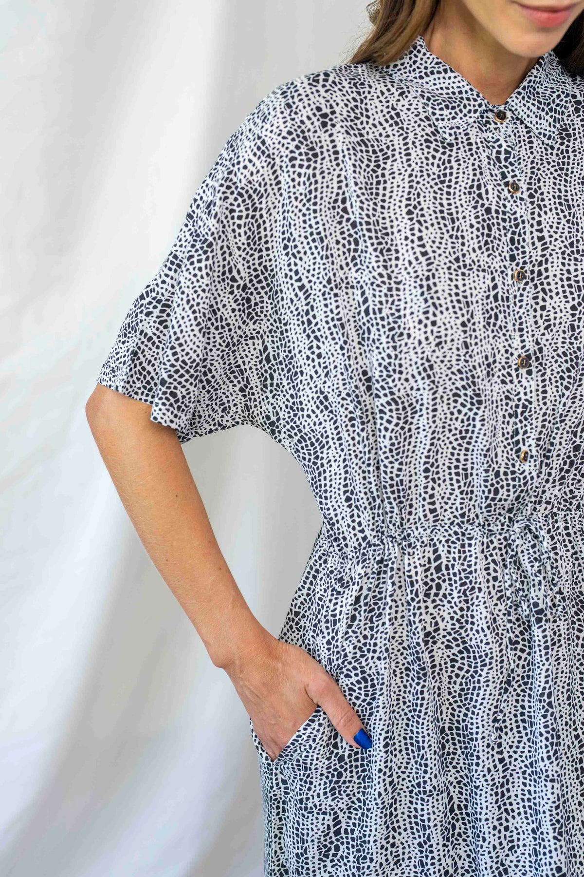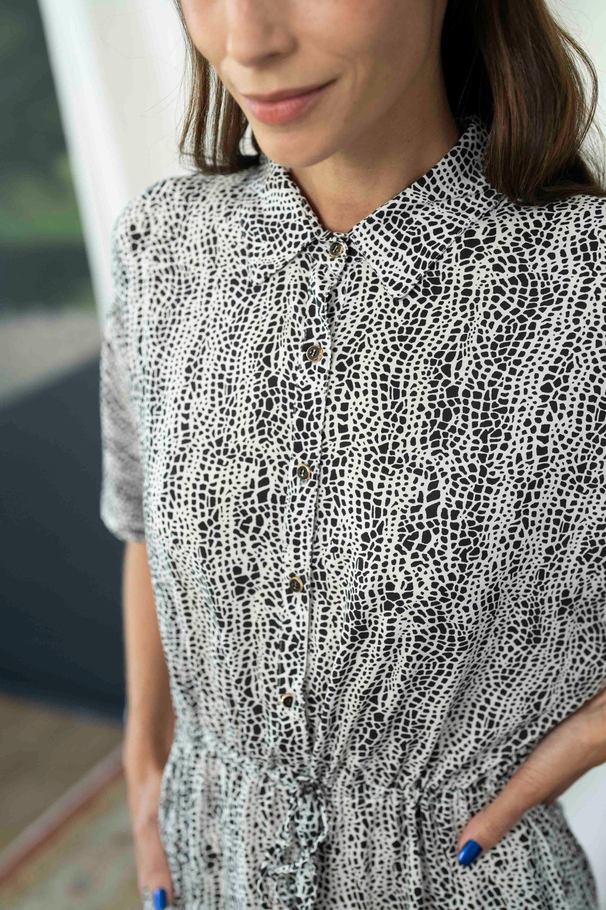 שמלת קיוטו חברבורות שחור לבן היא שמלה קלאסית על זמנית עם שובבות ורמיזה להדפס מנומר.