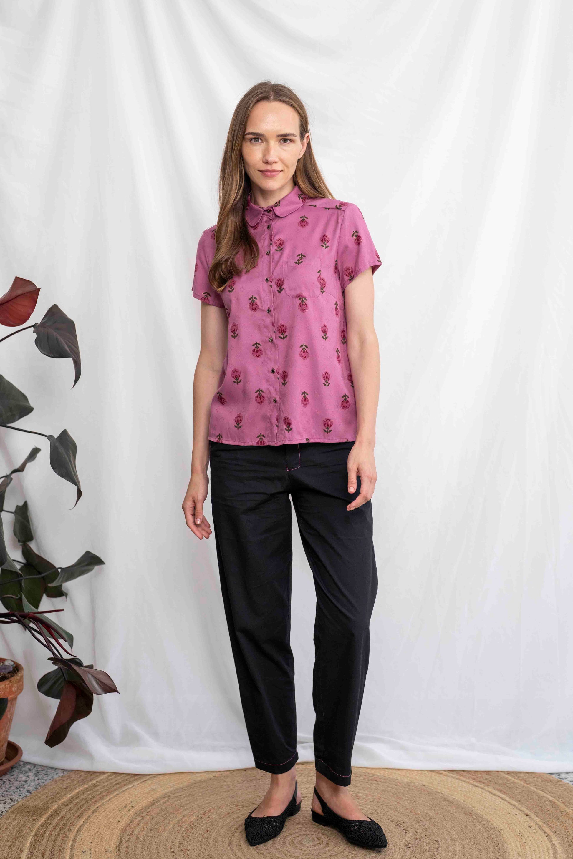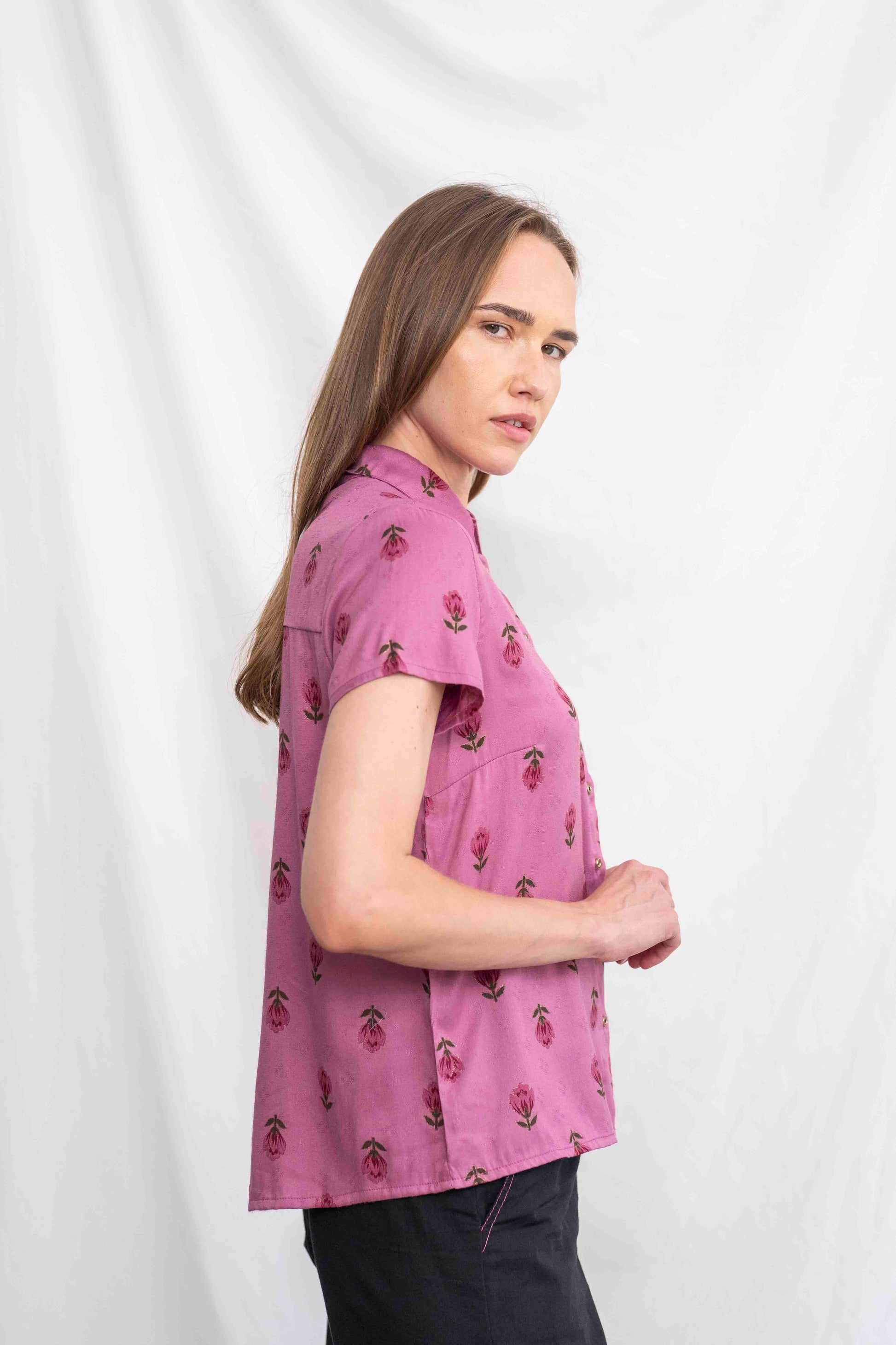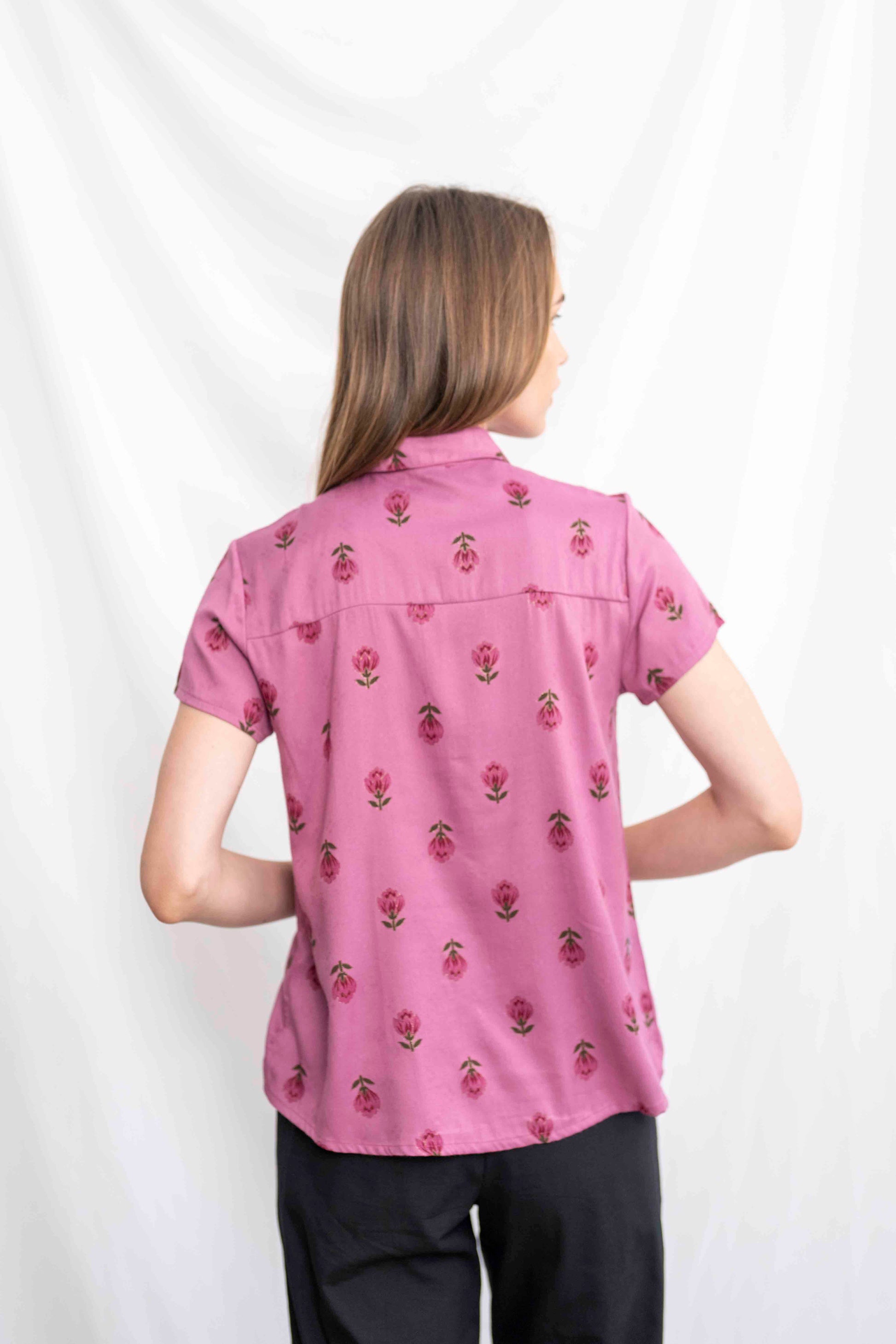 חולצת דריה טוליפ ורוד מעוטרת בפרחים עם קווי מתאר בזהב, על רקע גוון ורוד-סגול מושלם, קלאסיקה על-זמנית: הבד קליל ונעים על הגוף, והכפתורים הקטנים משתלבים בצורה הרמונית עם ההדפס ומוסיפים טאץ' מוקפד ועדין.