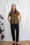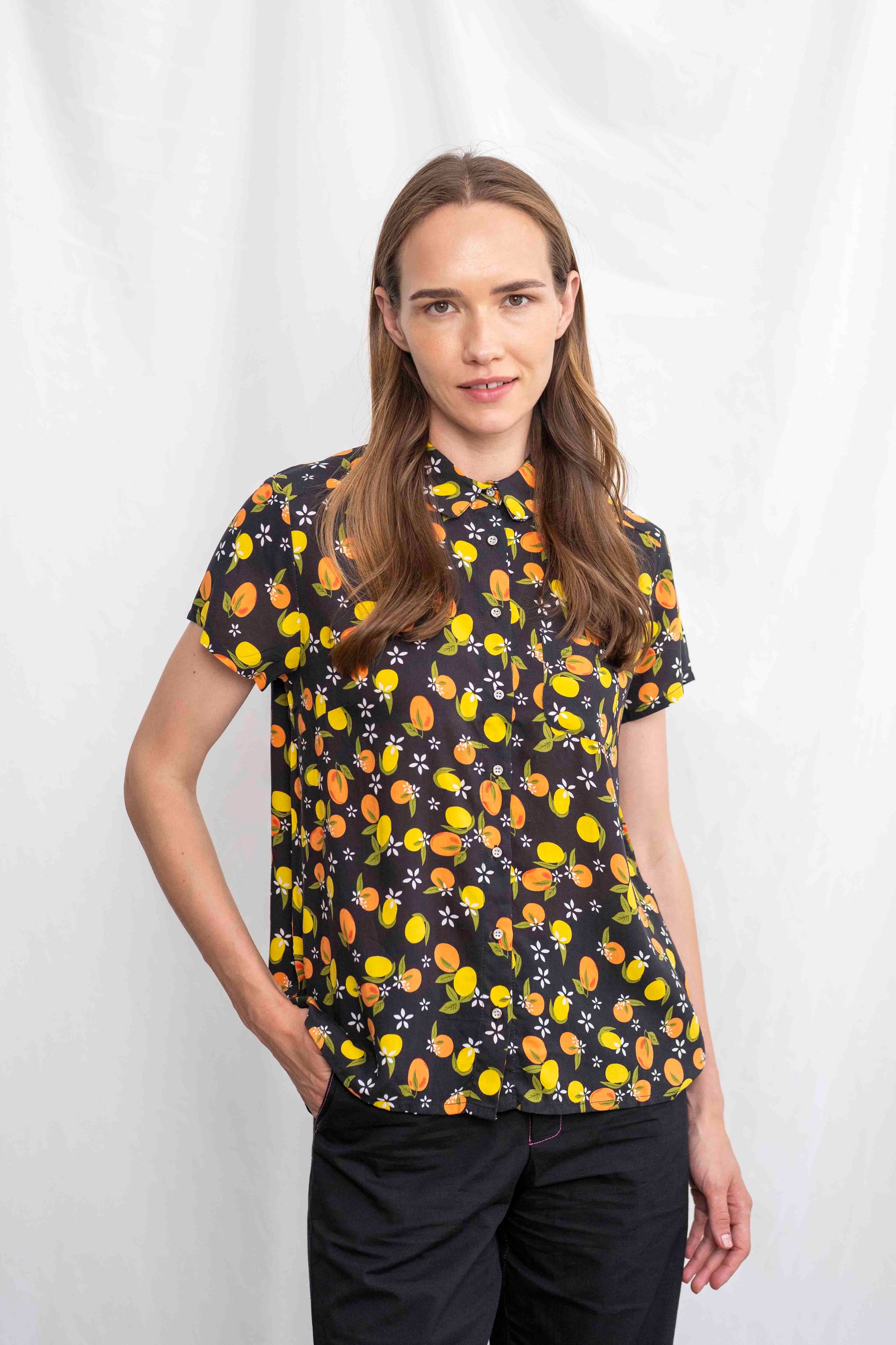 חולצת דריה פירות הדר בעלת הדפס קייצי מלא שמחה וצבעוניות פוגש קלאסיקה על-זמנית: חולצת דריה עם הדפס פירות הדר משלבת בין רקע שחור אלגנטי לפירות כתומים וצהובים ופרחים לבנים קטנים, שיוצרים יחד מראה רענן, נועז ומדויק. הבד קליל ונעים על הגוף, והכפתורים הקטנים משתלבים בצורה הרמונית עם ההדפס ומוסיפים טאץ' מוקפד ועדין.