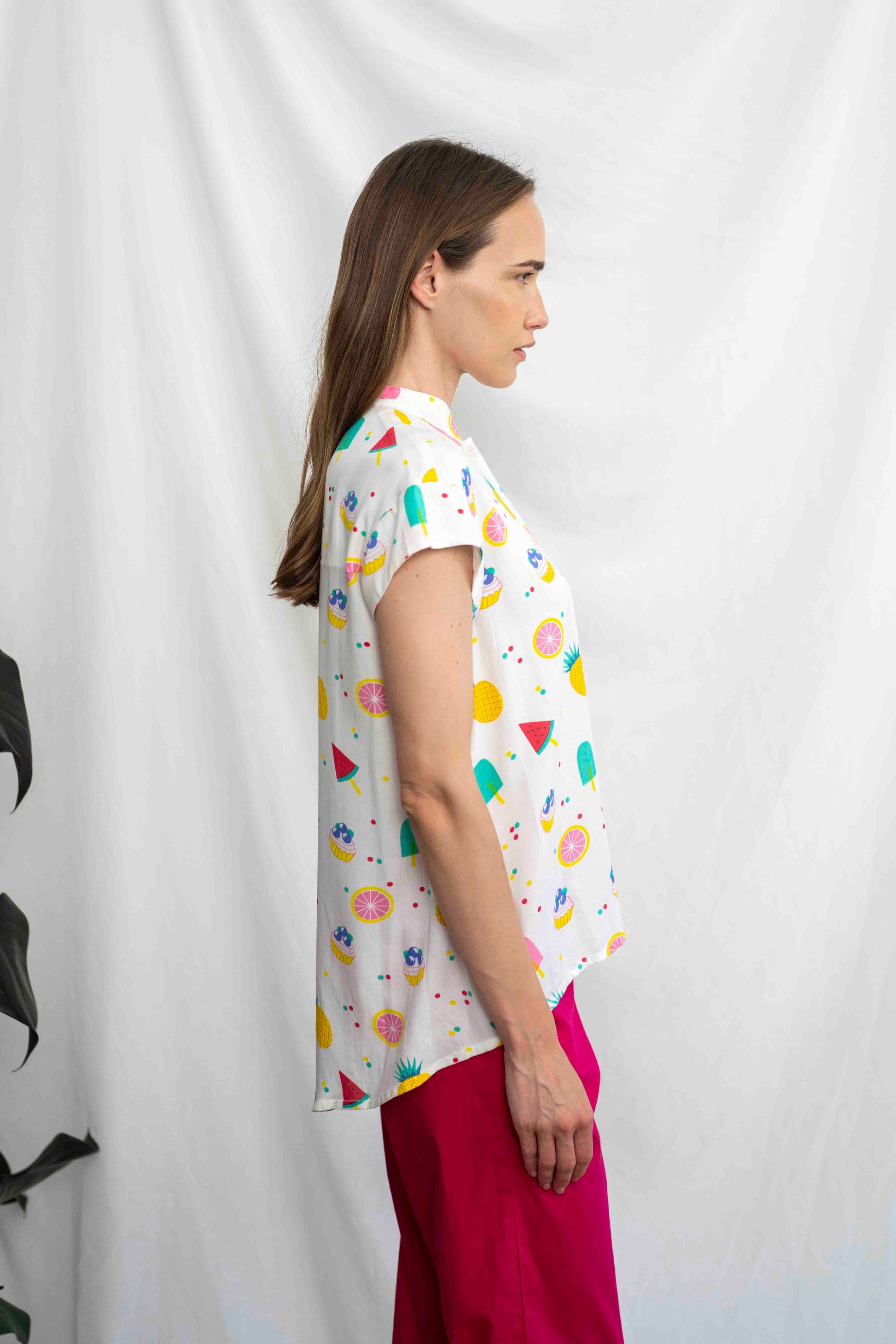 חולצת טוני הכי מתוקה היא חגיגה של צבעים, שמחה וסטייל – כמו קינוח קיצי מרענן שלא רוצים שייגמר. ההדפס כולל עוגות, שלגונים, פירות קיץ עסיסיים ונקודות צבעוניות, והכול על רקע לבן שמבליט כל איור בצורה חיה ומלאת אנרגיה. זו חולצה שמצליחה לשלב הומור, שובבות ואסתטיקה מתוחכמת – מושלמת למי שמחפשת להמתיק את היום שלה (ושל הסובבים) בסטייל מקורי.