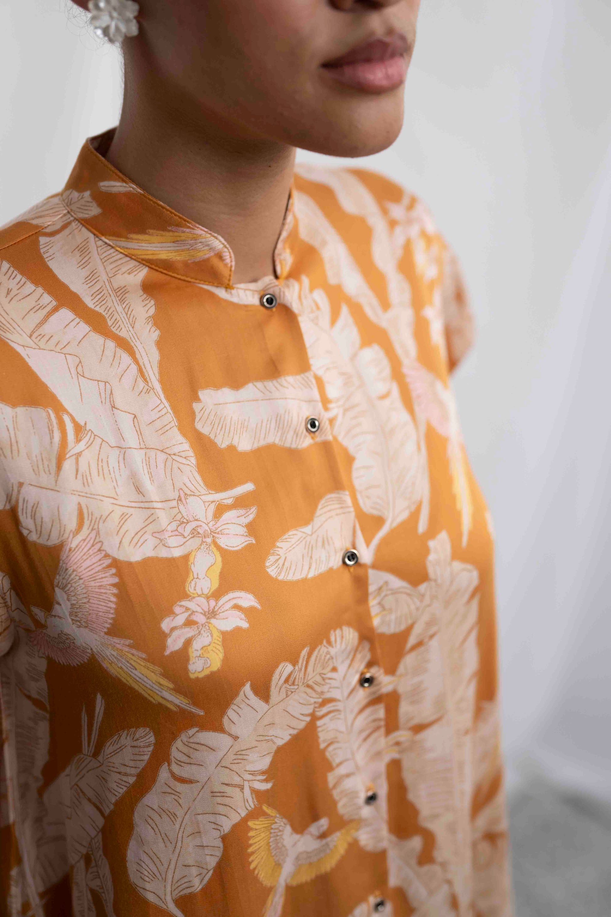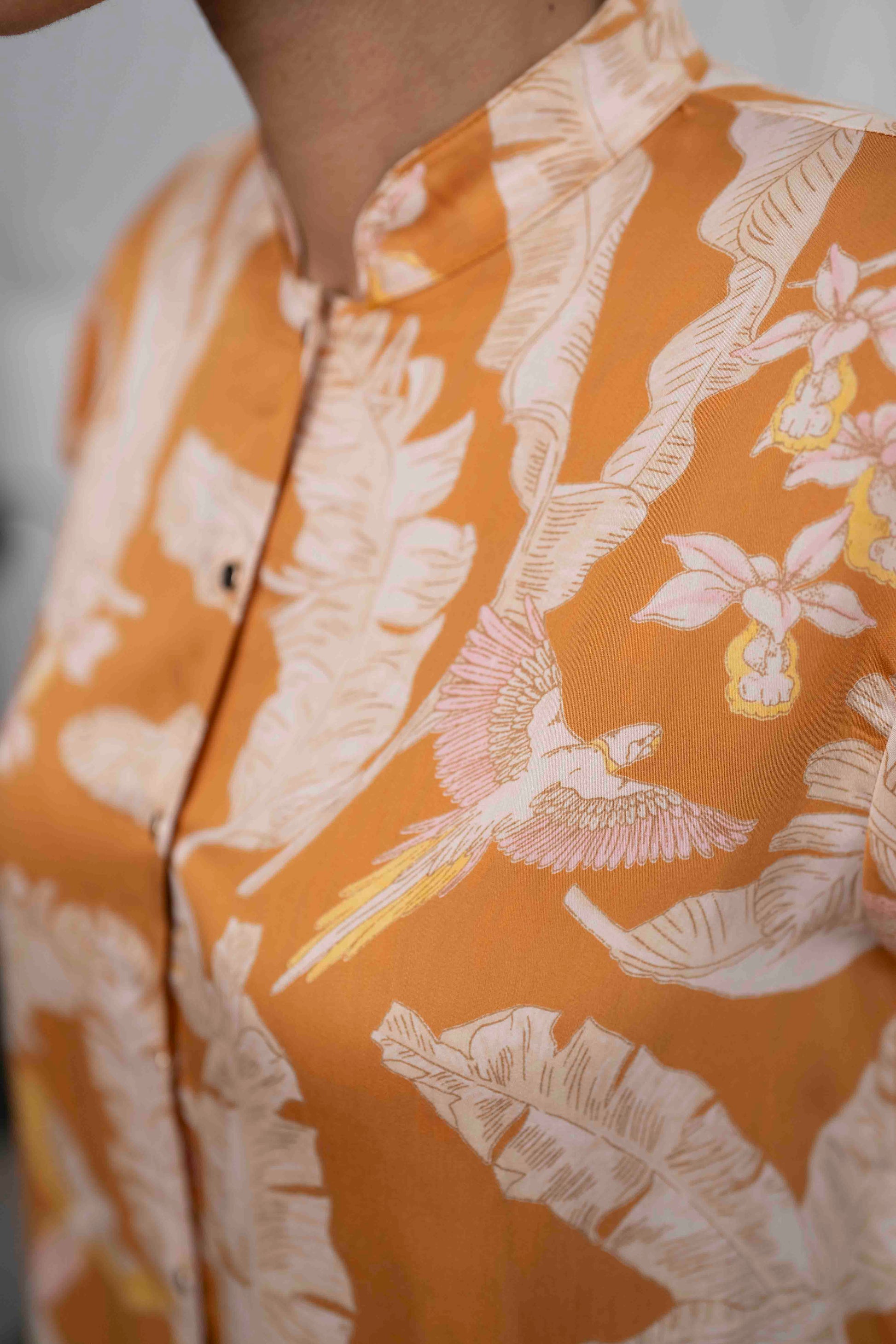 חולצת טוני יערות ברזיל היא חולצה שמביאה איתה משב של אקזוטיקה, חום וחופש – כאילו יצאה הישר מלב הג'ונגלים של דרום אמריקה. ההדפס העשיר כולל עלי בננה רחבים, תוכים מרהיבים ופרחים טרופיים שמזכירים חופשה רחוקה. כל זה משתלב עם גוון חמים ועמוק של כתום-זהוב, שמודגש עוד יותר בזכות הבד הייחודי בעל הברק הקל והמהפנט – כזה שתופס את האור ומשווה מראה יוקרתי ובלתי רגיל.