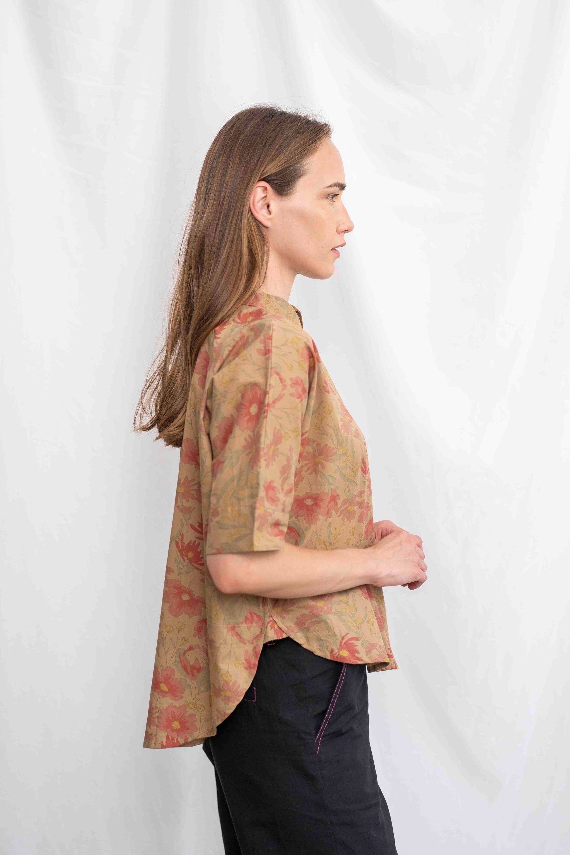 חולצת רובי מגיעה בגרסה נוסטלגית ומלאת אופי, עם הדפס פרחי בר עדינים על רקע בגווני אדמה – חום ואופוויט – בעלי תחושה טבעית וצבעוניות דהויה במכוון, שמעניקה לחולצה מראה וינטג'י רך ורגוע. נגיעות של אדום עמוק בפרחים וכפתורים בגוון בורדו-יין משלימים את האווירה החמה והעל-זמנית של הדגם הזה.