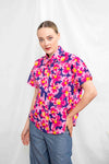 חולצת רון בהדפס הפרח הכי יפה מביאה איתה נוכחות נשית ורומנטית. הפרחים הורודים הגדולים פורחים על רקע סגול מנוקד, יוצרים שילוב הרמוני של צבעים חיים ומלאי עומק. ההדפס מעניק לחולצה מראה ייחודי שמשלב רכות אלגנטית עם נגיעה נועזת.
