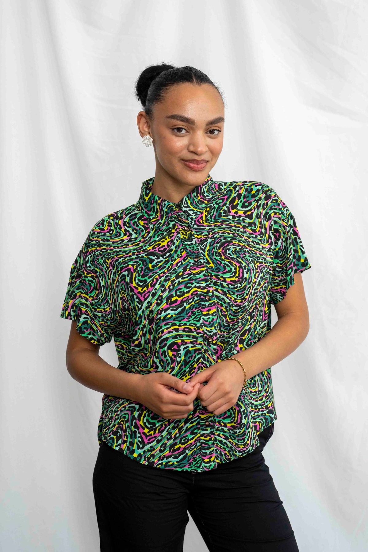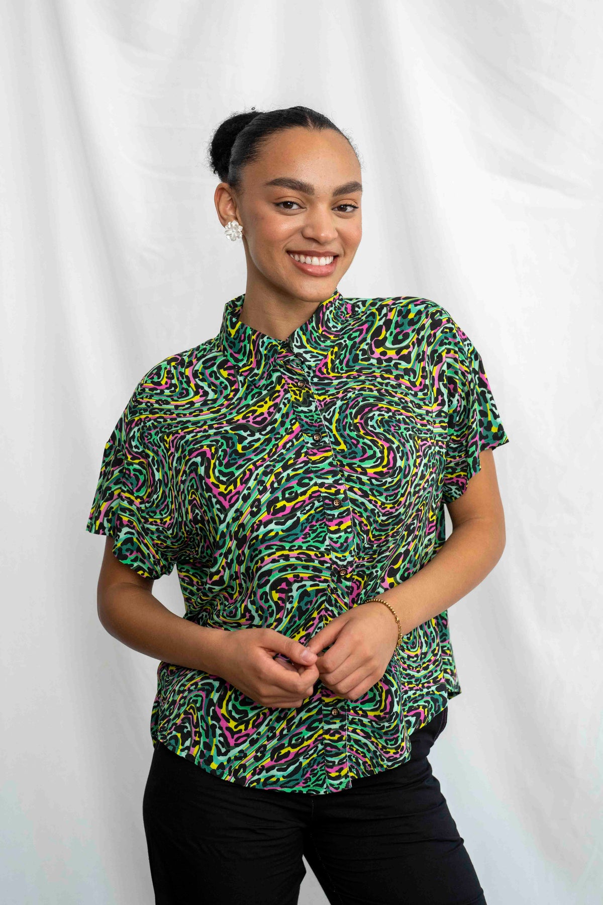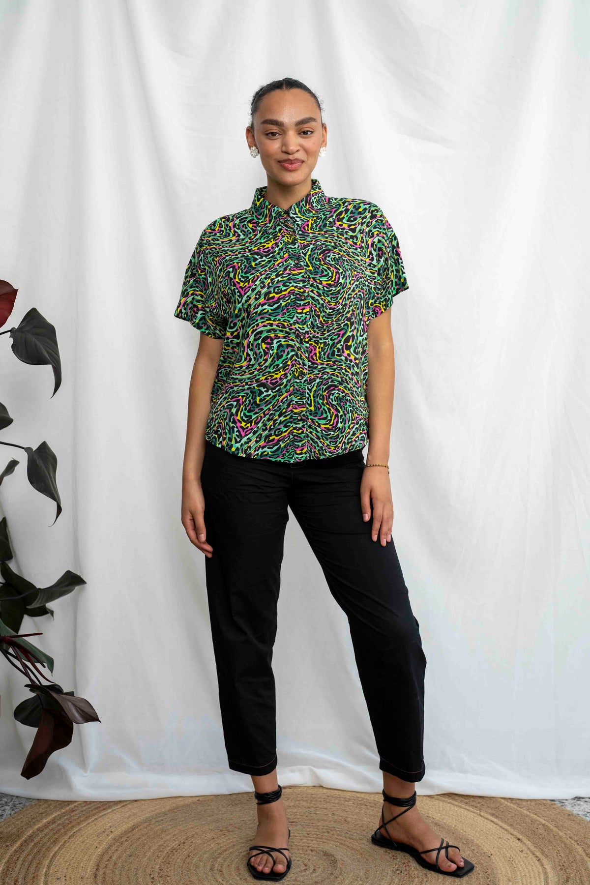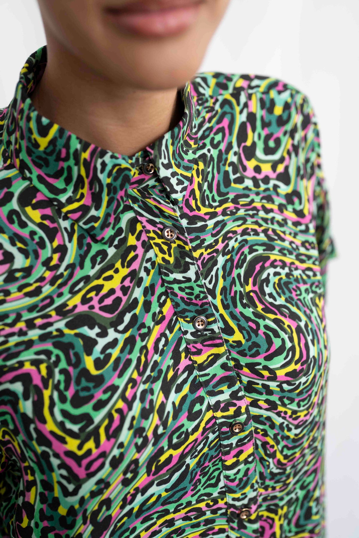הדפס מנומר, אבל לא כמו שחשבת – כאן הוא מקבל טוויסט פרוע וצבעוני במיוחד: ורוד, ירוק, טורקיז, צהוב ושחור משתלבים במערבולת גרפית מרהיבה וקצבית, שיוצרת לוק בולט, עוצמתי ומלא סטייל. הבד נעים וקליל, עם מגע רך ומרקם שמרגיש נהדר גם בימים חמים.