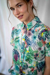 חולצת רון הוואי עשויה בד כותנה קליל, מעוטרת במוטיבים טרופיים לצד תוכים ועוד.