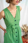 שמלת יולי משולשים ירוק-מנטה מעוטרת בדוגמה גאומטרית דמויית משולשים קטנים ובעלת צבעוניות מאירת עיניים.