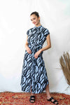 שמלה תכלת מעוטרת במוטיב מופשט דמוי סערה, ובעלת צווארון סיני ייחודי. זוג כיסים צדדיים וחגורה תואמת משלימים את המראה, ומאפשרים התאמה לכל סגנון.
