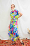 שמלה צבעונית בגזרת מקסי שתיקח אותך למחוזות רחוקים עם נופים אחרים, השמלה מעוטרת ברחובות עם בתים מיוחדים ועצי דקל, בצבעוניות נאון מדליקה.