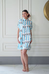 שמלת אוברסייז קצרה בגוון תכלת ולבן, עם מוטיב מתוק במיוחד של פנדות. שמלת סיילור מעוטרת כפתורים קטנים לאורך קו האמצע, בעלת צווארון ישר, זוג כיסים צדיים, ושרוולים נינוחים בחיתוך אלכסוני. שילוב הגזרה הרפויה עם המוטיב השיקי מעניק תחושה קלילה ונינוחה, מחמיא למגוון מבני גוף, ויוצר טוטאל לוק אורבני ומדליק.