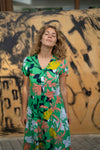 שמלת קומות ירוקה ובועטת עם מוטיב פרחוני גדול הכי אביבית ומשמחת.