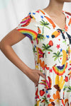שמלה שהיא חגיגה לעיניים וללב: שמלת הקומות "מסיבה טרופית" מעוטרת בהדפס ססגוני של פירות טריים, תוכי קקדו שובב, כוכבים ועוד – כולם משולבים בתוך דוגמה עשירה שמזכירה טקסטורה סרוגה ייחודית. הצבעוניות הבולטת – בגווני ורוד, כתום, ירוק וטורקיז – מייצרת תחושת שמחה קיצית, קלילה ומזמינה, כמו חופשה בתנועה.