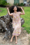 שמלת קומות פרחונית מתוקה בגוונים בהירים של צהוב בננה וורוד פסטלי היא קסם של שמלה.