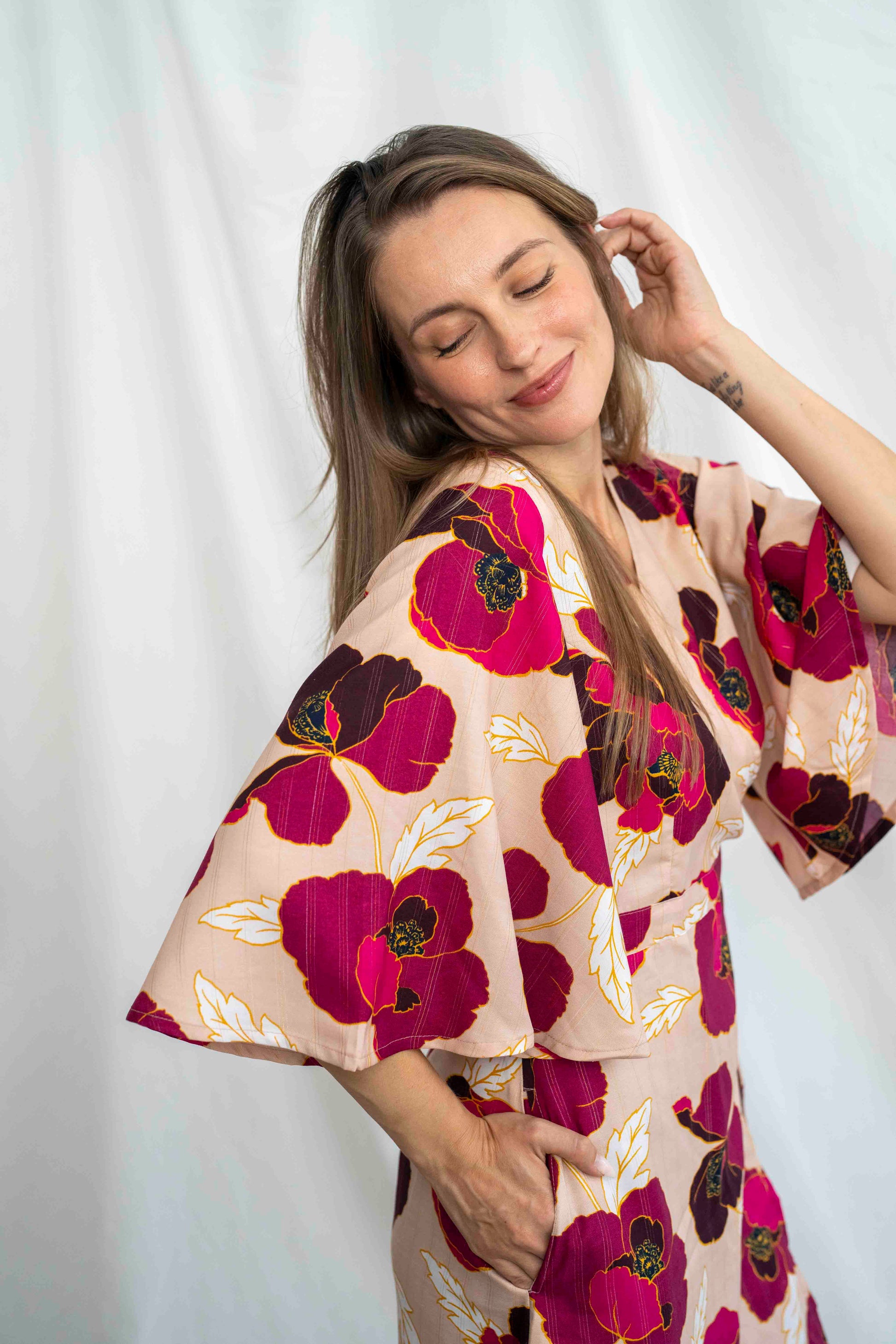 שמלת קימונו מיני הכי רומנטית היא בדיוק השמלה שאף אחד לא יישאר אדיש אליה: שילוב ממכר בין שיק רטרואי לנשיות שובבה, בהדפס פרחים עזים בגווני ורוד ויין על רקע ניוד חמים. היא בולטת, נועזת ועם זאת מלאת רוך וקסם – כזו שמרימה את מצב הרוח ומתאימה לכל שעה ביום (ובעיקר לקיץ מלא סטייל).