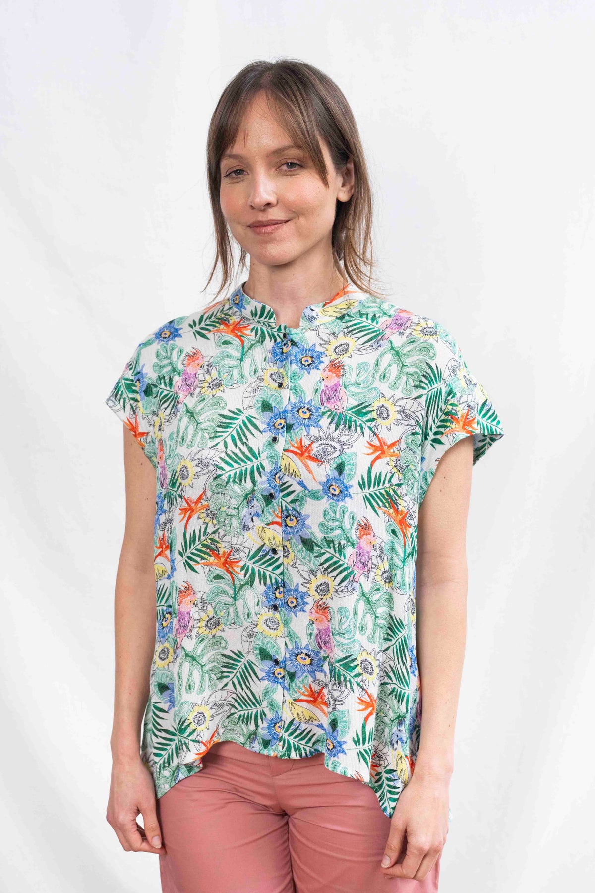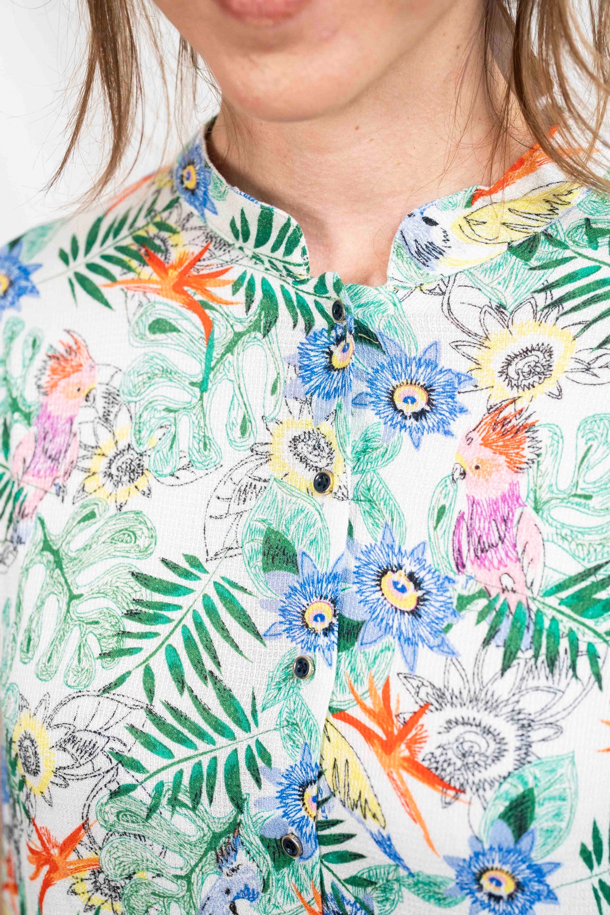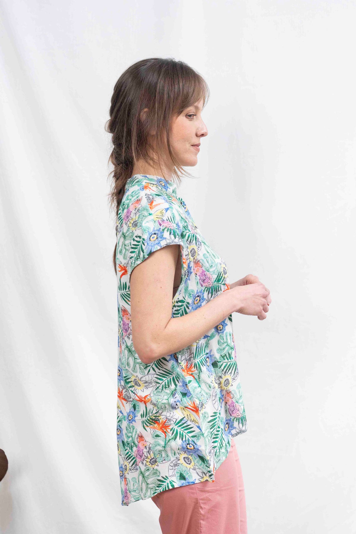 חולצת טוני אי טרופי מעוטרת בטוקים צבעוניים ופרחים וצמחים טרופיים ועשירים, ויש לה גם דוגמה בבד שמזכירה פיקה.