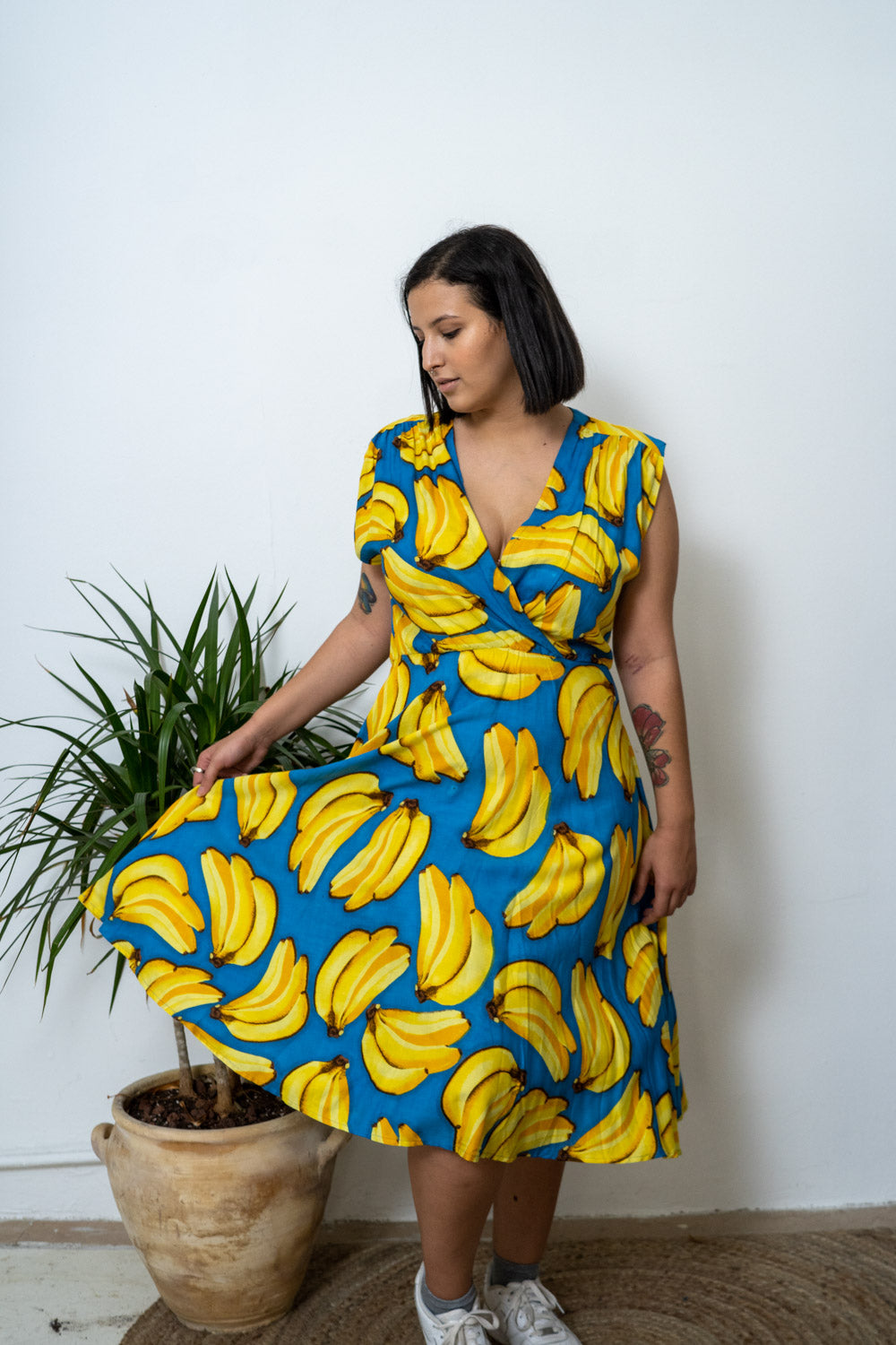 שמלת מידי ללא שרוולים בצבע תכלת, עם מוטיב בננות סופר כיפי. שמלת פיפטיז מעוצבת בגזרת A שיקית, בעלת מפתח V בגזרת מעטפת, וחיתוך חצאית עגול המעניק מראה מחמיא למגוון רחב של מבני גוף. אין כמו שמלת רטרו מהממת שיוצרת לוק אורבני ועדכני בסגנון קלאסי ונצחי.