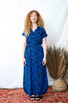 שמלה כחולה מעוטרת במוטיבים חיות דמוי זברה, בצבעוניות שיקית, ובעלת צווארון סיני ייחודי. זוג כיסים צדדיים וחגורה תואמת משלימים את המראה, ומאפשרים התאמה לכל סגנון.